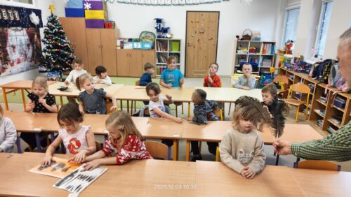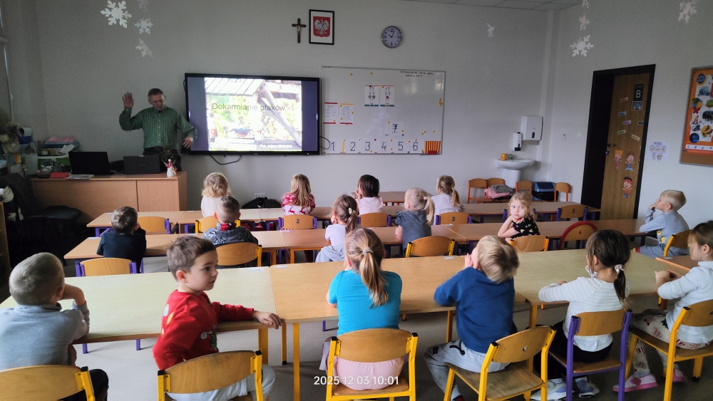 Na początku dzieci obejrzały pokaz na tablicy multimedialnej, podczas którego poznały różne gatunki ptaków występujących w Polsce. Dowiedziały się również, które ptaki wędrują na zimę do cieplejszych krajów, a które zostają z nami. Edukator opowiedział także, co jedzą poszczególne gatunki ptaków i jak można im mądrze pomagać w czasie zimy.