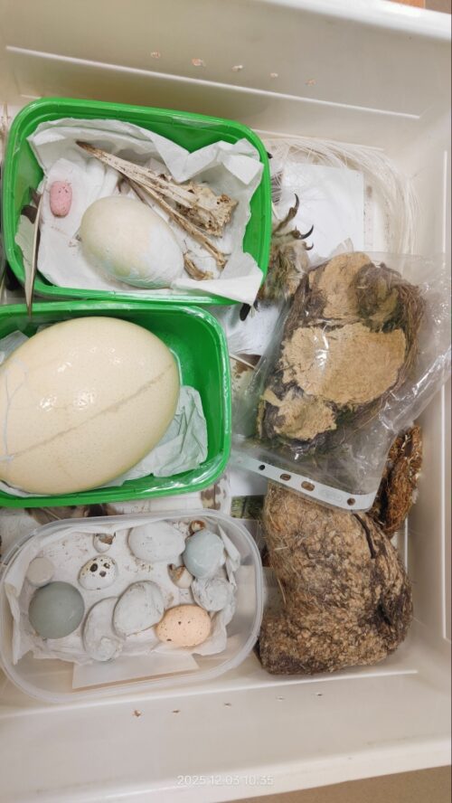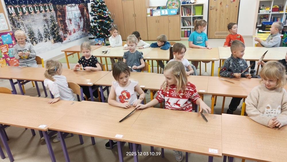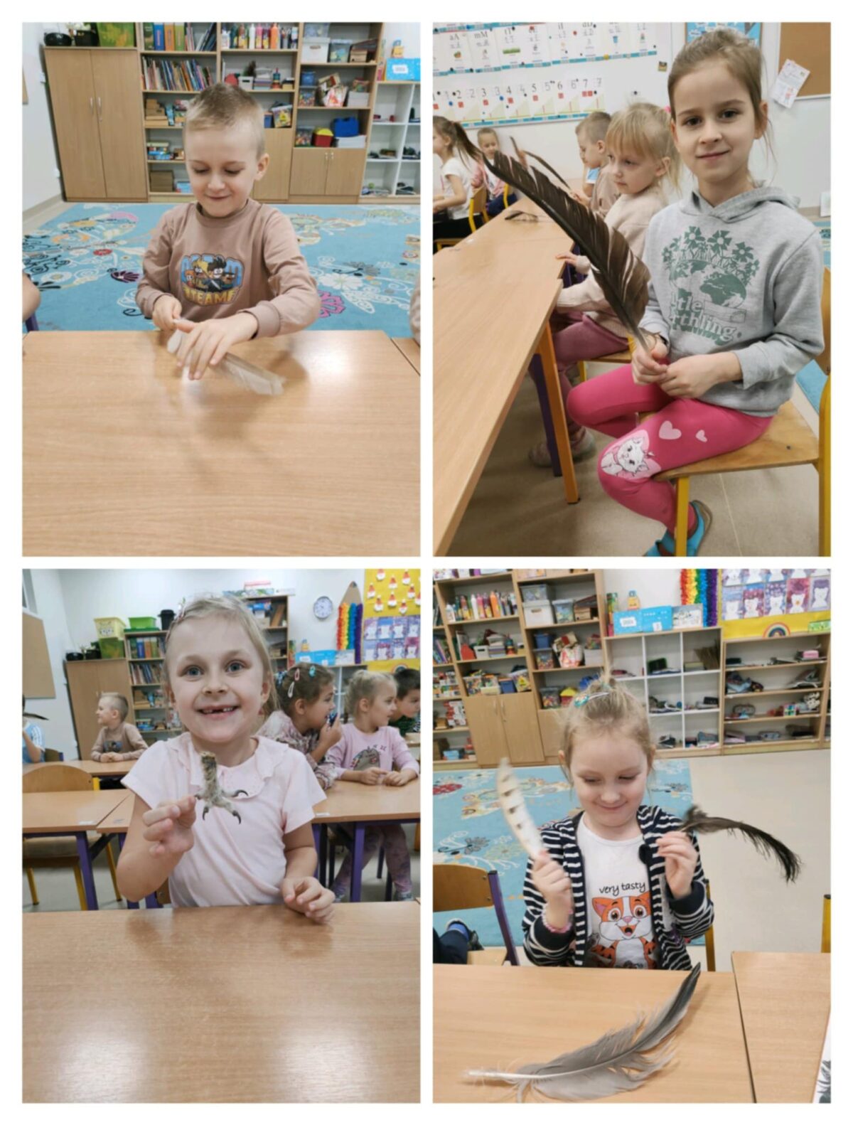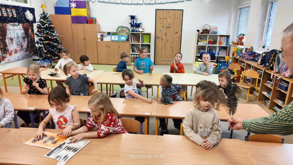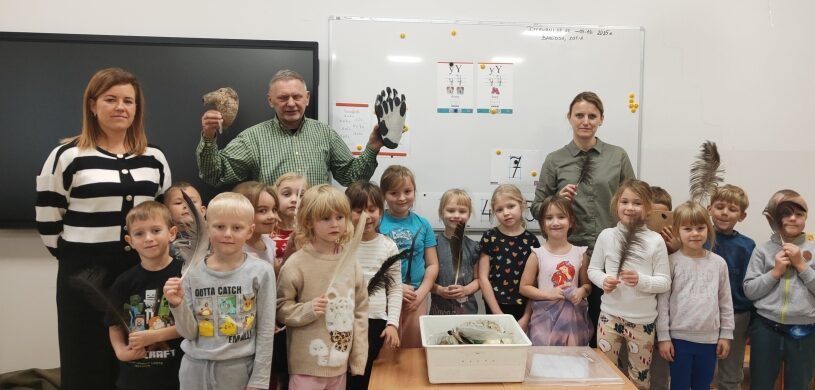 Dużą atrakcją była możliwość obejrzenia z bliska prawdziwych piór, łapek ptaków oraz odcisków śladów leśnych zwierząt. Dzieci z ogromnym zaciekawieniem porównywały je i próbowały zgadywać, do jakich zwierząt należą.