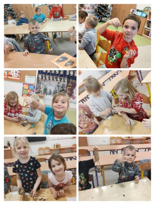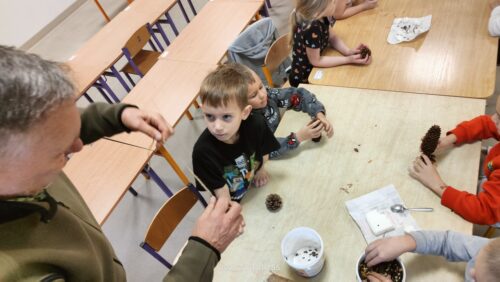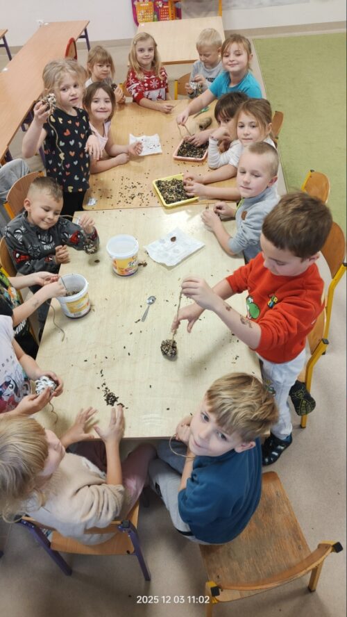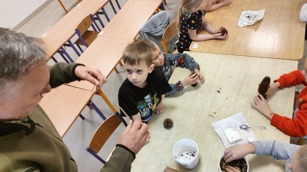 Na zakończenie warsztatów każdy przedszkolak wykonał własny „ptasi smakołyk” – naturalną karmę przygotowaną z szyszek, smalcu i mieszanki ziaren. Gotowe przysmaki dzieci zabrały, by zawiesić je w szkolnym ogrodzie lub w pobliżu swoich domów.