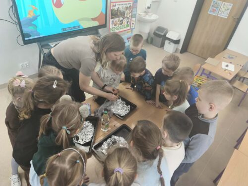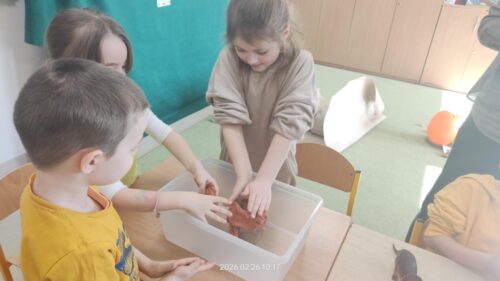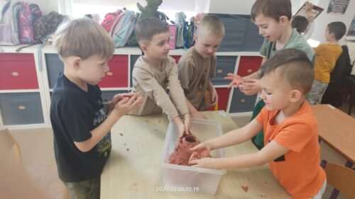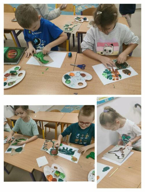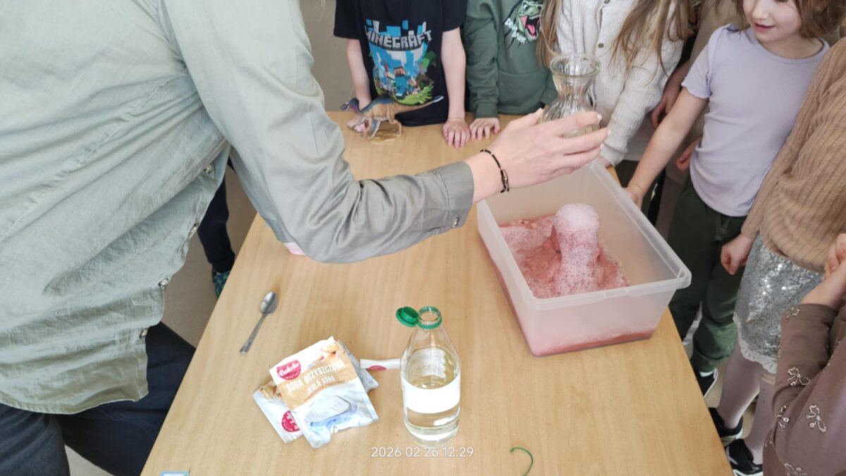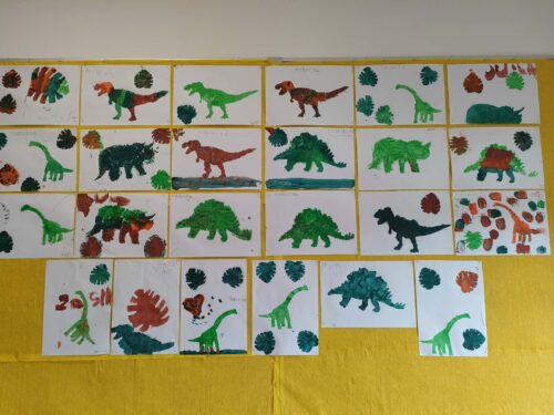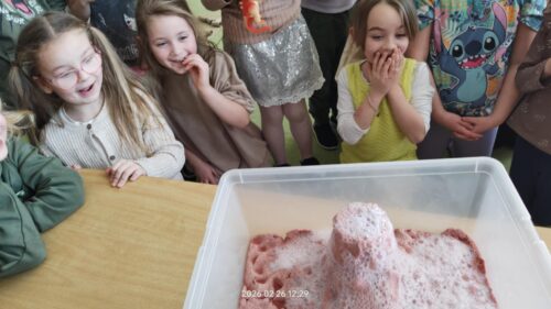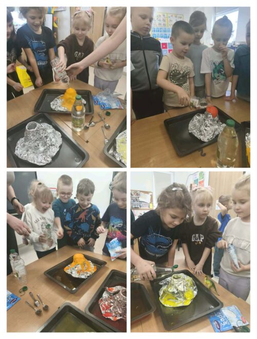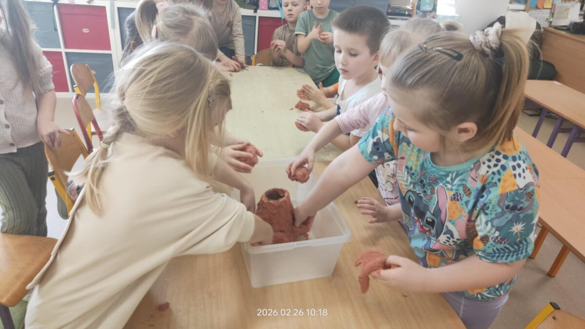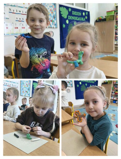 Nie zabrakło również działań plastycznych, które wzbudziły ogromny entuzjazm. Dzieci tworzyły kolorowe dinozaury z plasteliny, wykonały imponujący szkielet z rolek po papierze, a także budowały wulkany. Najwięcej emocji wzbudził jednak moment, gdy wulkany „wybuchały” w ramach eksperymentu chemicznego z wykorzystaniem octu i sody oczyszczonej. Dzieci mogły obserwować reakcję chemiczną, podczas której powstawała pieniąca się „lawa”. Dużo radości sprawiło także malowanie dinozaurów metodą stemplowania – powstały pełne barw i fantazji prace.
