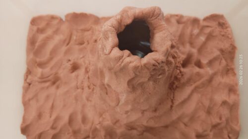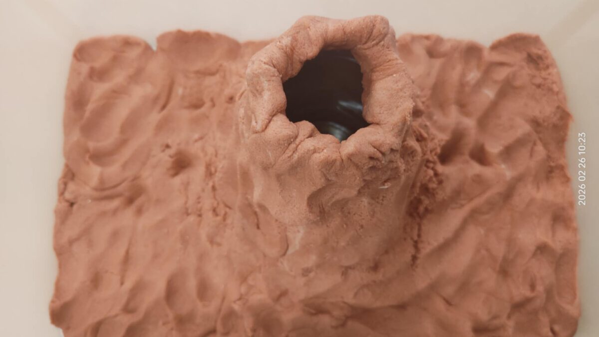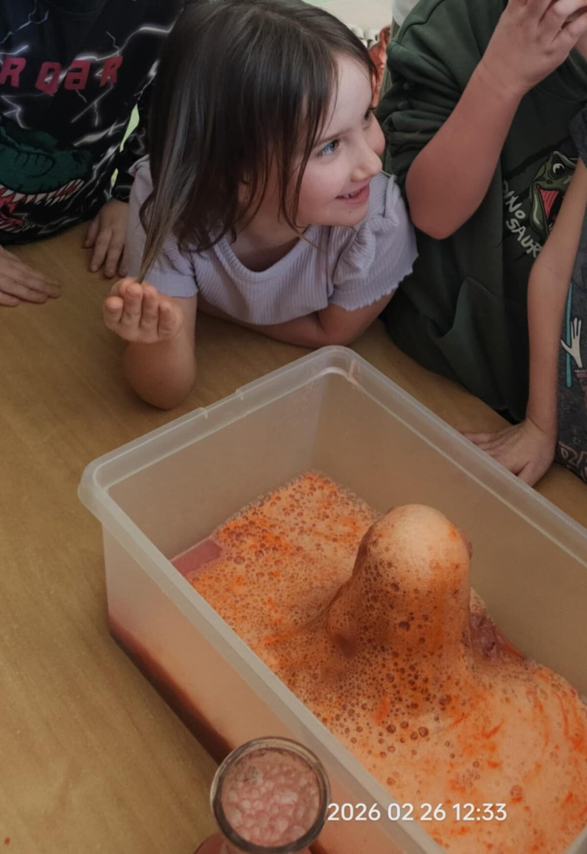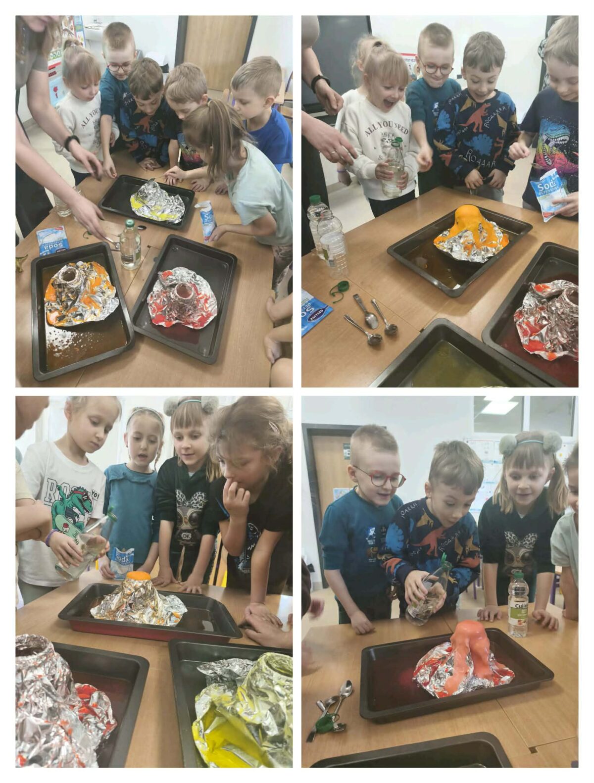 Nie zabrakło również działań plastycznych, które wzbudziły ogromny entuzjazm. Dzieci tworzyły kolorowe dinozaury z plasteliny, wykonały imponujący szkielet z rolek po papierze, a także budowały wulkany. Najwięcej emocji wzbudził jednak moment, gdy wulkany „wybuchały” w ramach eksperymentu chemicznego z wykorzystaniem octu i sody oczyszczonej. Dzieci mogły obserwować reakcję chemiczną, podczas której powstawała pieniąca się „lawa”. Dużo radości sprawiło także malowanie dinozaurów metodą stemplowania – powstały pełne barw i fantazji prace.
