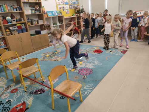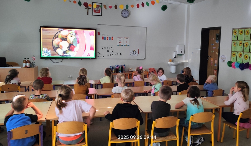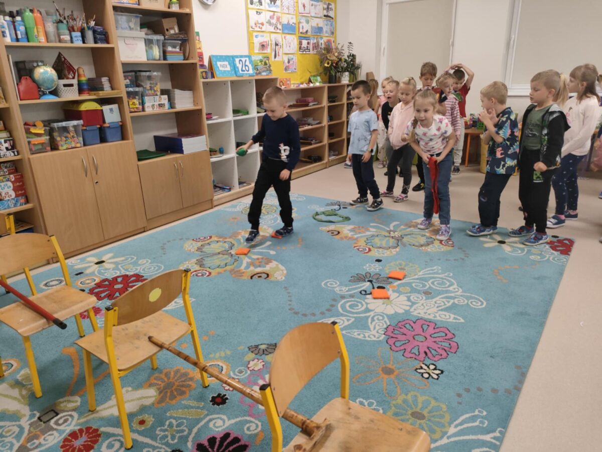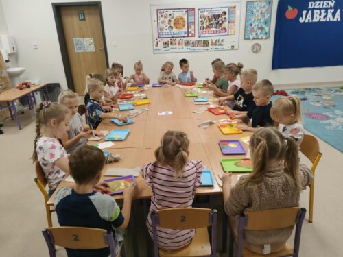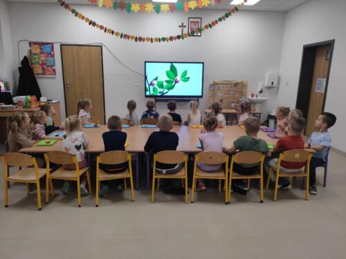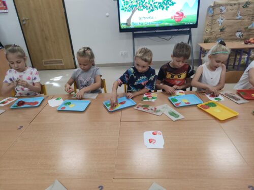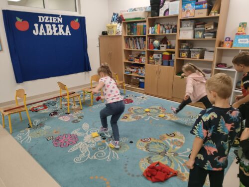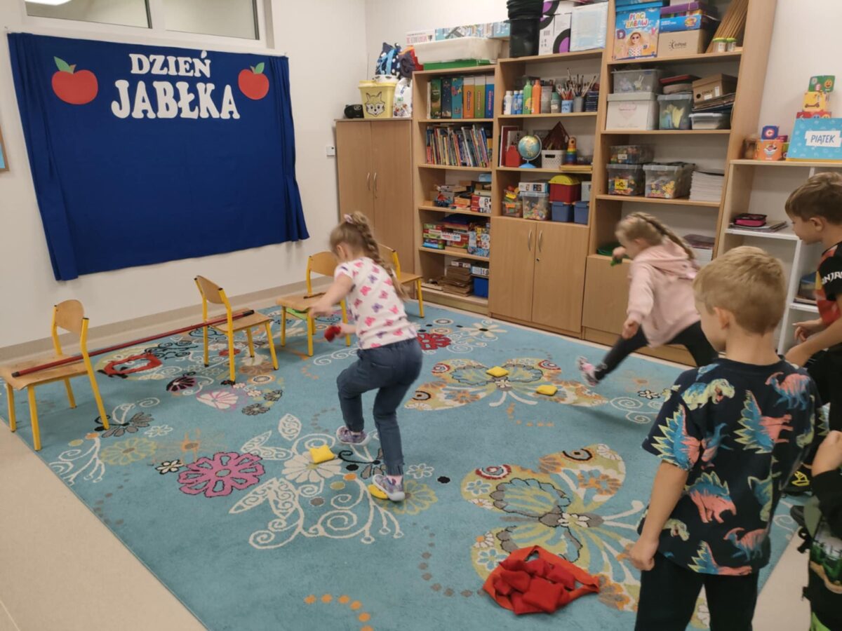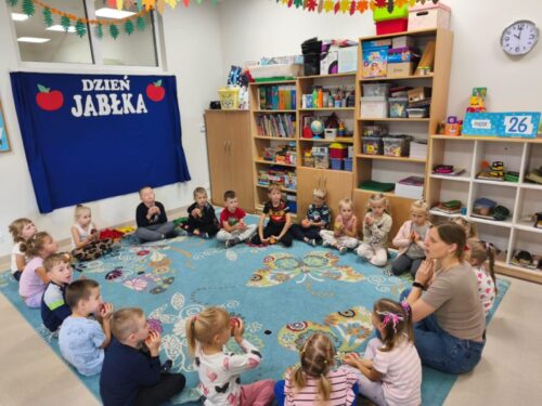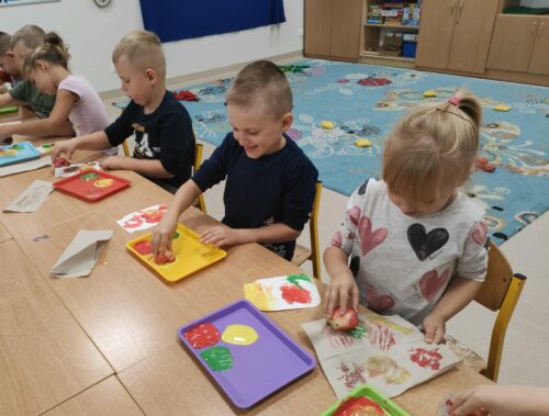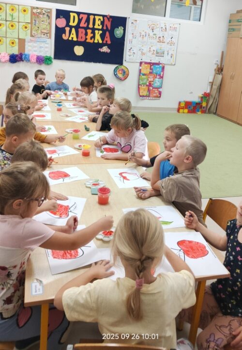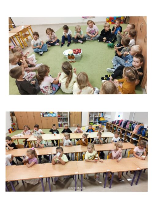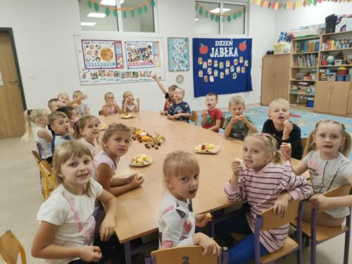 W zerówkach obchodziliśmy owocowe święto – Dzień Jabłka. Zajęcia rozpoczęliśmy od ćwiczenia uważności – dzieci odbierały jabłko wieloma zmysłami: dotykiem, wzrokiem, węchem i oczywiście smakiem, rozwijając umiejętność skupienia na chwili obecnej. Następnie obejrzeliśmy krótki film edukacyjny, dzięki któremu najmłodsi dowiedzieli się, jak wygląda cykl życiowy jabłka i dlaczego warto je jeść. Dzieci rozwijały także swoją kreatywność, wykonując prace plastyczne inspirowane jabłkiem – stemplowanie oraz malowanie. Nie zabrakło również aktywności ruchowych, które wprowadziły wiele radości i śmiechu. Podczas wyścigu rzędów dzieci mogły sprawdzić swoją zręczność i współpracę w grupie. Dzięki tym różnorodnym aktywnościom dzieci nie tylko świetnie się bawiły, ale również uczyły się świadomego i zdrowego podejścia do jedzenia.