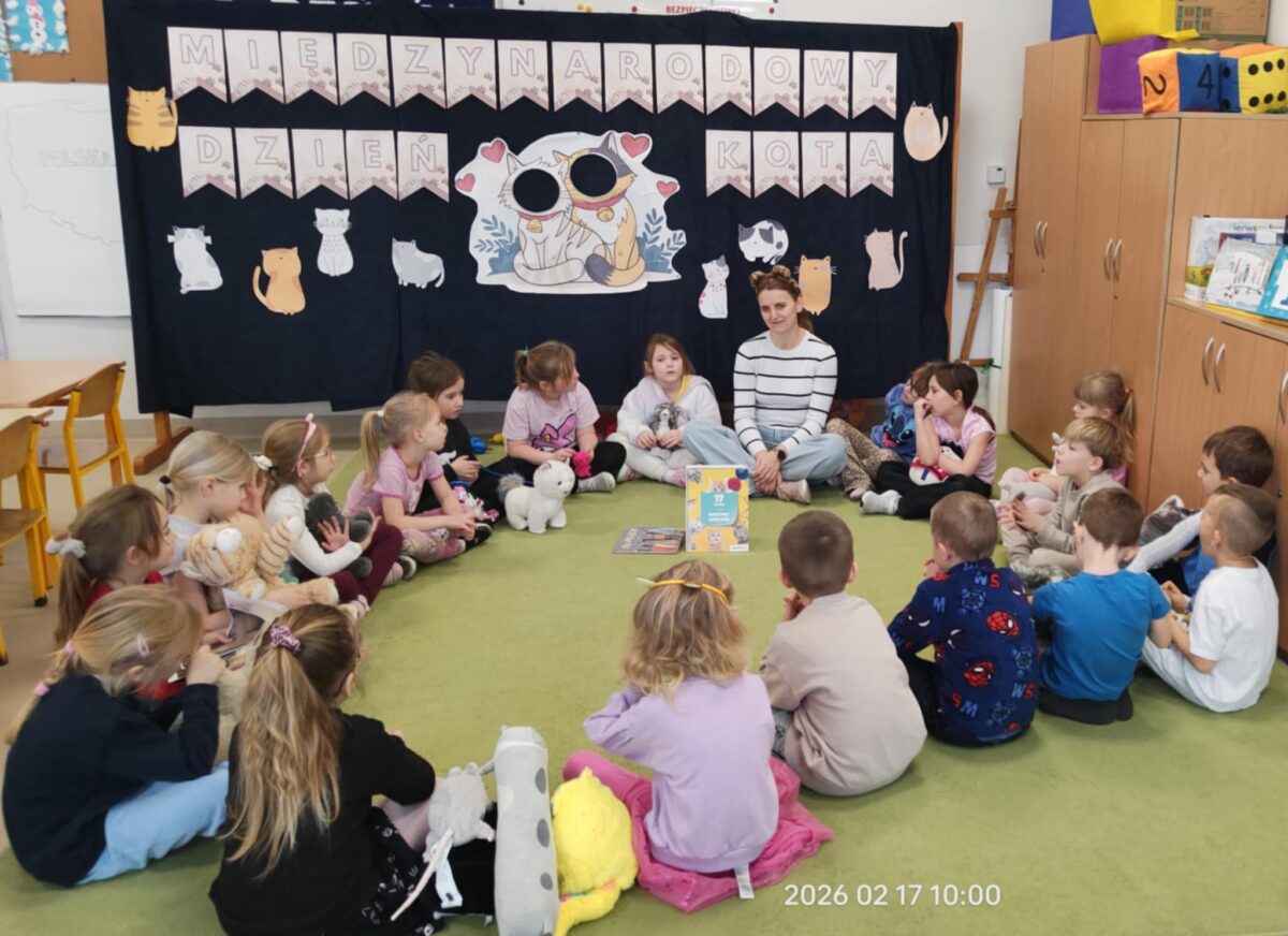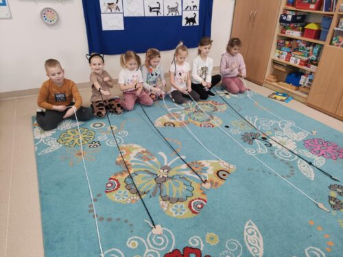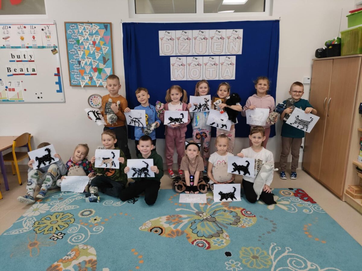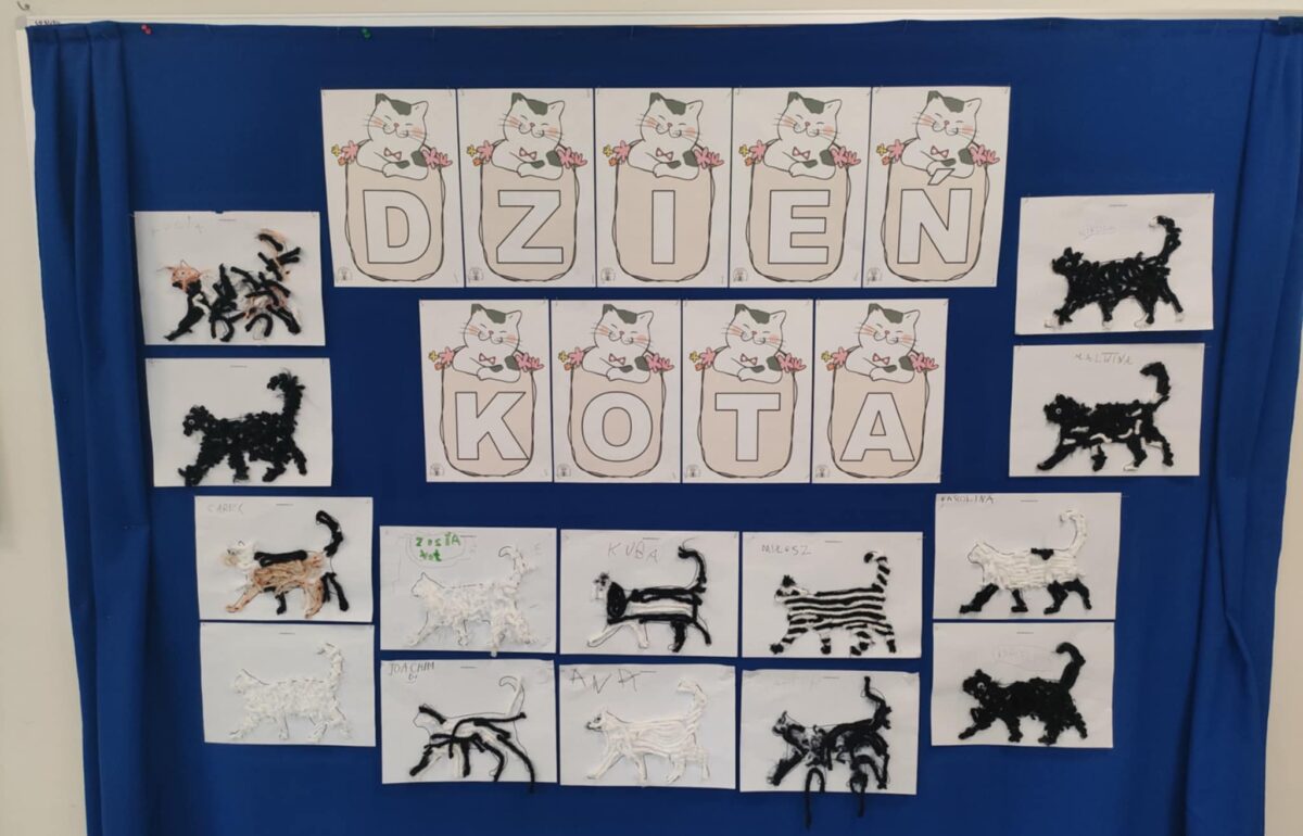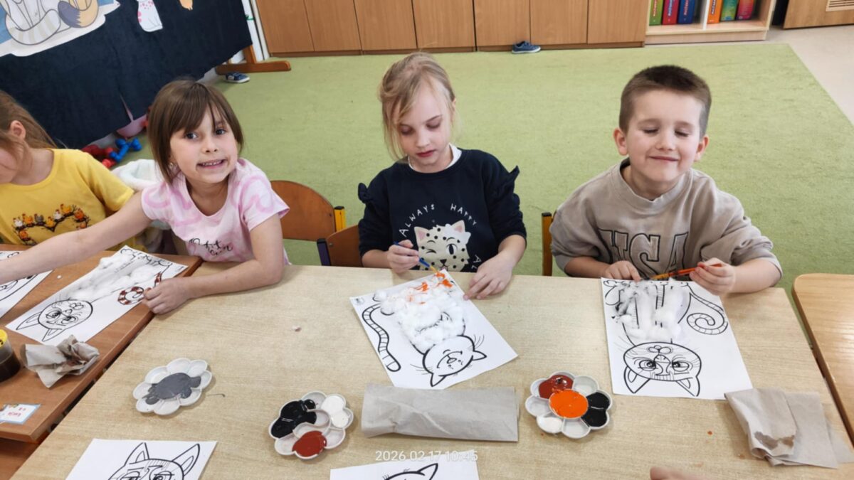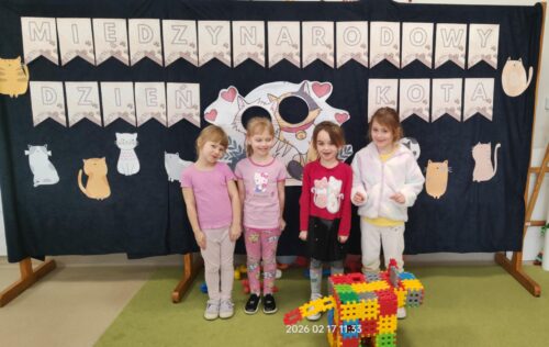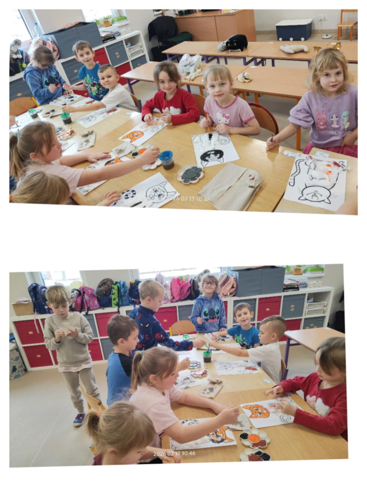 17 lutego w zerówkach obchodziliśmy Dzień Kota. Już od rana sala wypełniła się „kocią” atmosferą. Dzieci z entuzjazmem opowiadały o swoich domowych pupilach i dzieliły się kocimi ciekawostkami. Podczas zajęć wspólnie poszerzały wiedzę o kotach — dowiedziały się, jak koty się poruszają, co lubią jeść i jak się komunikują. Pani czytała książeczki o kotach, a dzieci słuchały z zaciekawieniem, śledząc przygody bohaterów o miękkich łapkach i długich ogonach. Nie zabrakło także działań plastycznych. Z włóczki czy waty powstawały niezwykłe ilustracje kotów — puszyste, kolorowe, czasem zabawne, a czasem bardzo dostojne. Każda praca była inna, tak jak różne są koty. W ciągu dnia pojawiły się również zabawy rozwijające motorykę małą. Dzieci konstruowały koty z klocków, a także ćwiczyły zręczność i precyzję podczas „gonienia myszki” – zwijania włóczki, co wywoływało mnóstwo śmiechu i emocji. Małe paluszki miały okazję do aktywnej pracy, a wyobraźnia do kocich harców.