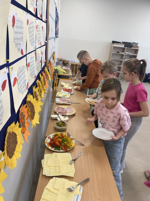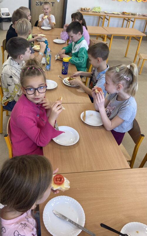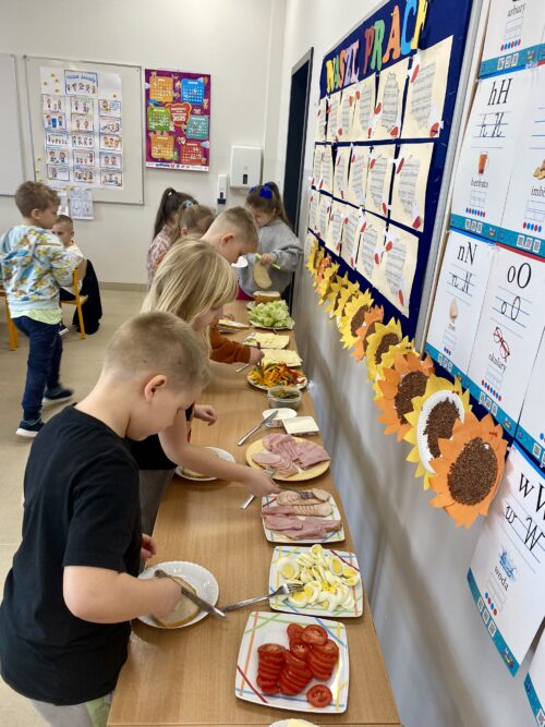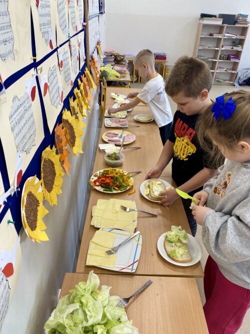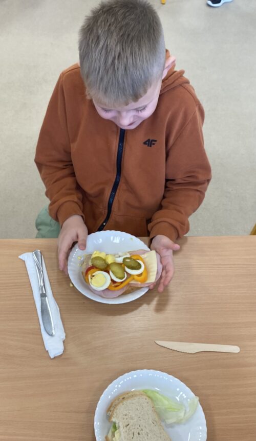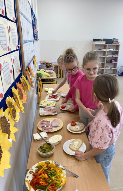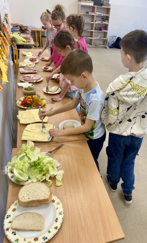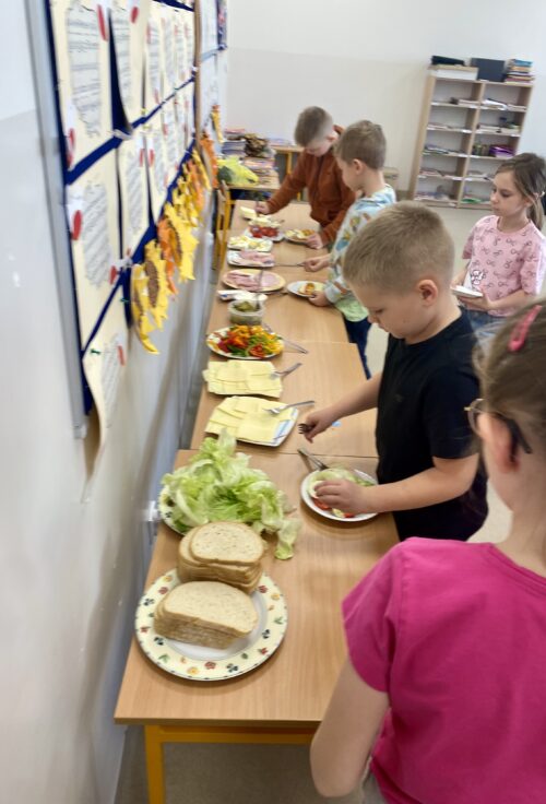 Na wspólnie przygotowanym stole znalazło się świeże pieczywo, chrupiące warzywa, chude wędliny, sery, jajka oraz zdrowe tłuszcze. Uczniowie z dużym zaangażowaniem i radością komponowali własne kanapki, kierując się zarówno smakiem, jak i poznanymi zasadami zdrowego żywienia.