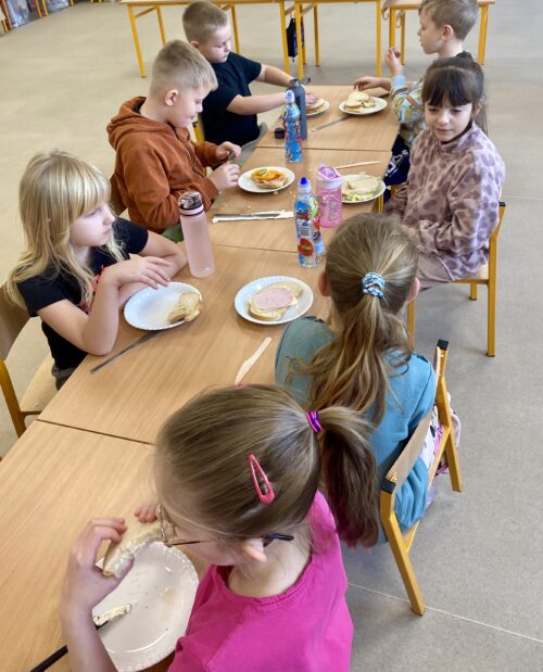 Po zakończonej pracy wszyscy zasiedli do wspólnego posiłku, ciesząc się efektami swoich kulinarnych starań. Chwile spędzone przy zdrowym śniadaniu nie tylko zintegrowały grupę, ale także pozwoliły dzieciom poczuć dumę z samodzielnie przygotowanych kanapek.