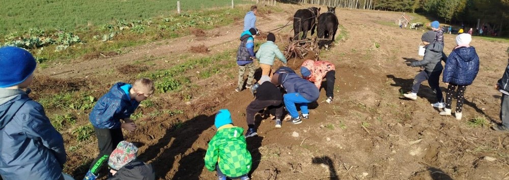 Nie zabrakło też nauki przez doświadczenie – dzieci poznały dawne sposoby pracy w gospodarstwie rolnym, a następnie samodzielnie zbierały ziemniaki, które zostały wykopane 60-letnią kopaczką gwiazdową. Następnie przyszedł czas na degustację świeżo przyrządzonych placków ziemniaczanych oraz ziemniaków na patyku. Nasza wycieczka zakończyła się radosną i pełną energii zabawą na świeżym powietrzu.