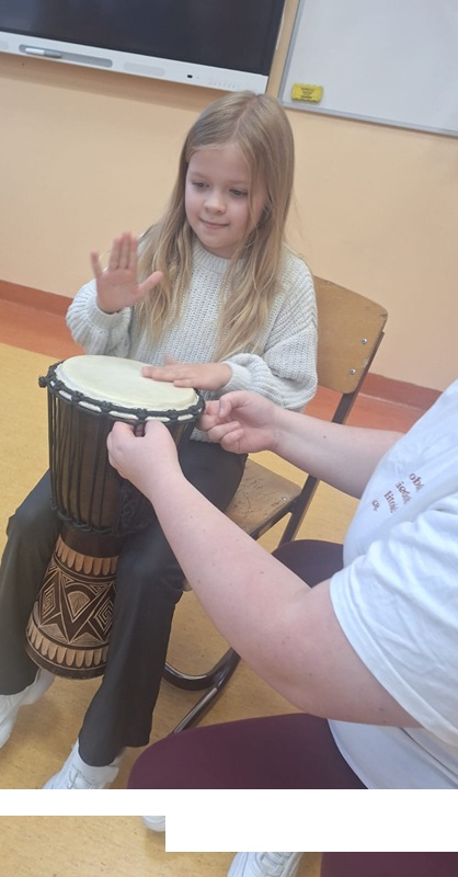 Ponadto dzięki absolwentce naszej szkoły- Pani Wiktorii Kupieckiej dzieci poznały i wysłuchały brzmienia dwóch nietypowych instrumentów: zanzy (kalibmy) oraz djebme.