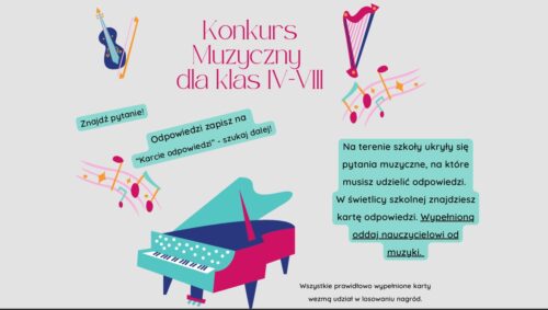 Kolejnym wydarzeniem muzycznym był konkurs, w którym udział mogły wziąć klasy IV-VIII. Była ta to już II edycja szkolnego konkursu muzycznego, w którym można nie tylko sprawdzić swoje umiejętności z zakresu wiedzy o muzyce, ale również zdobyć fantastyczne nagrody, których fundatorem między innymi była Rada Rodziców. Udział w konkursie wzięło 38 uczniów. 10 osób przeszło do finału. Zwycięzcami II edycji szkolnego konkursu muzycznego zostali: Amelia Hinc oraz Patryk Repliński.