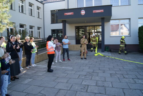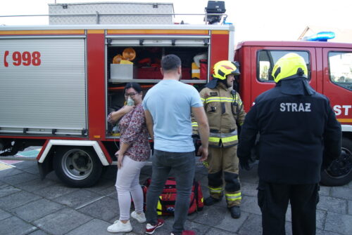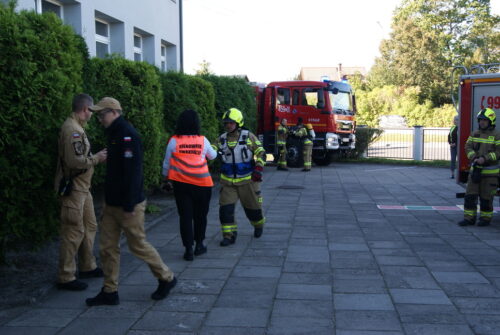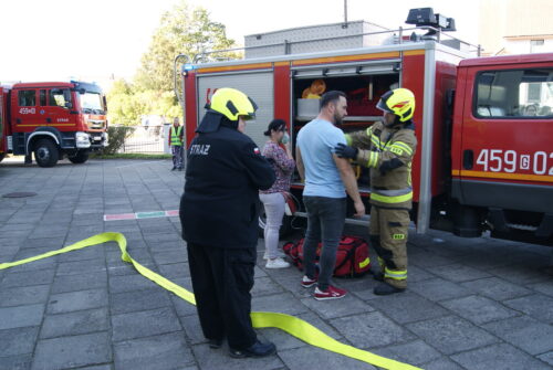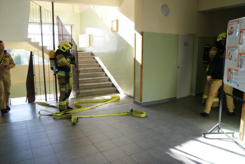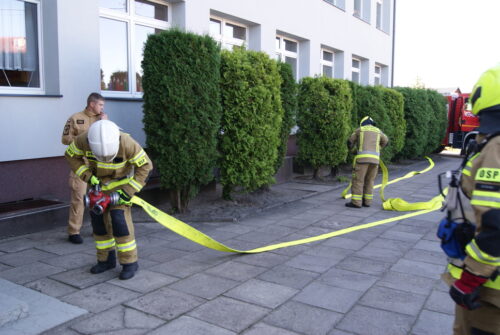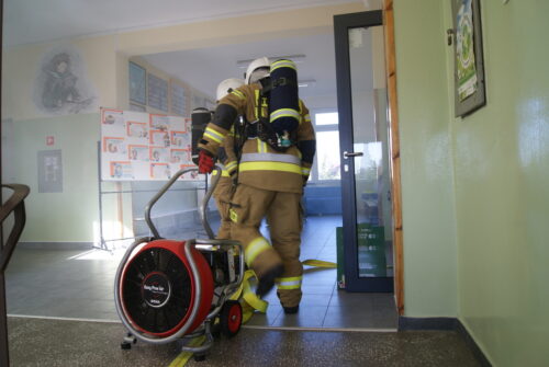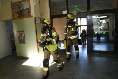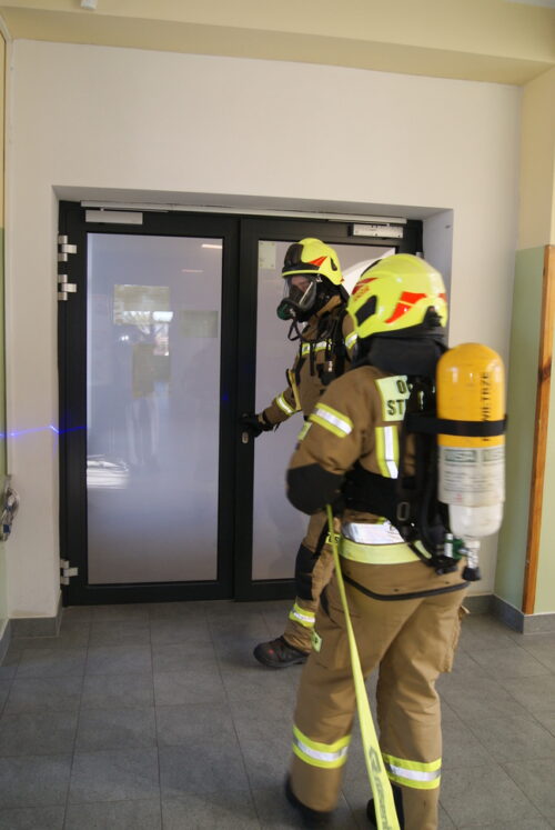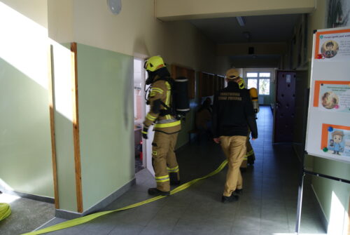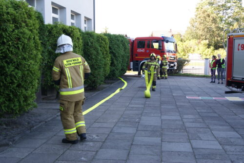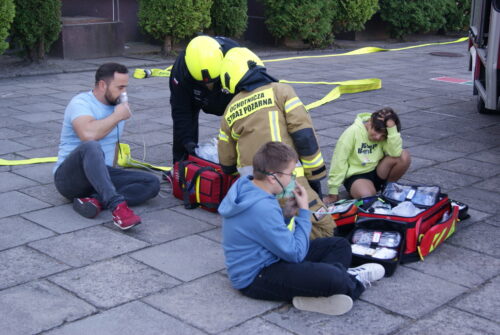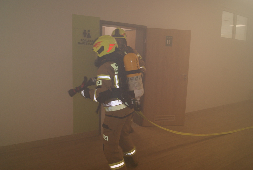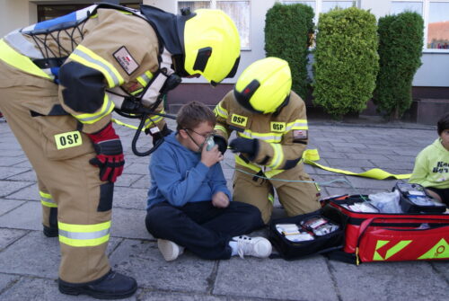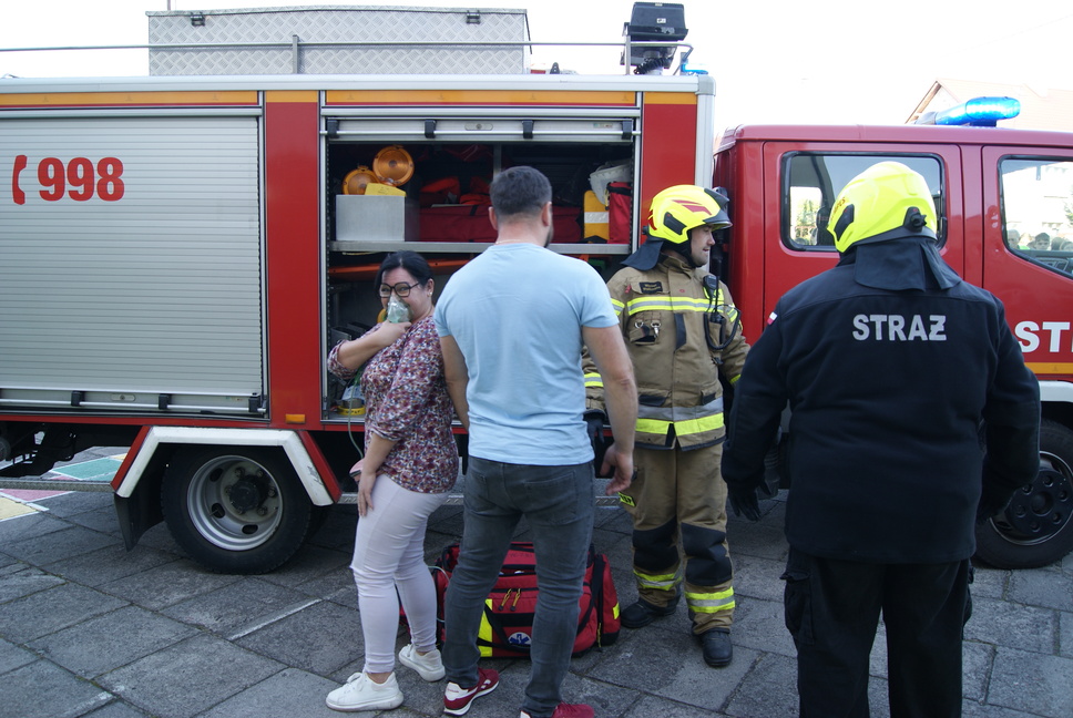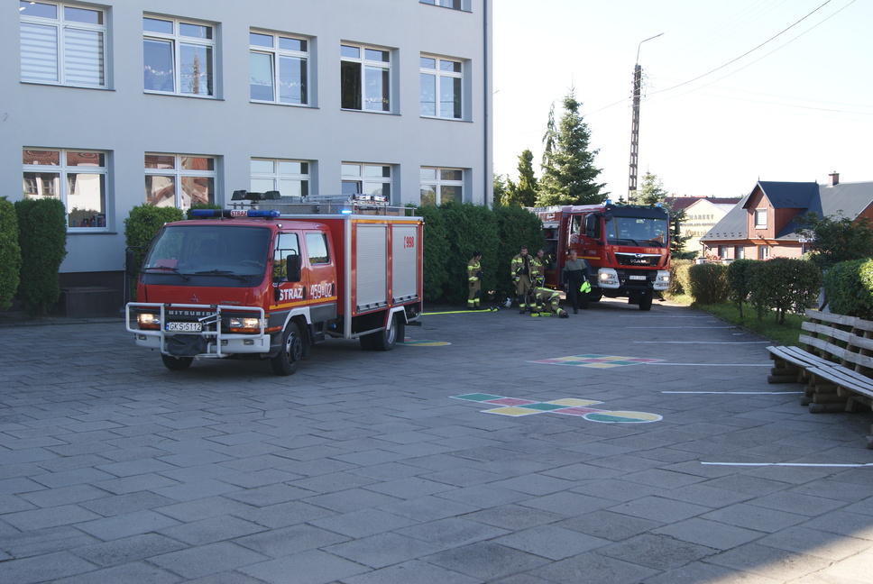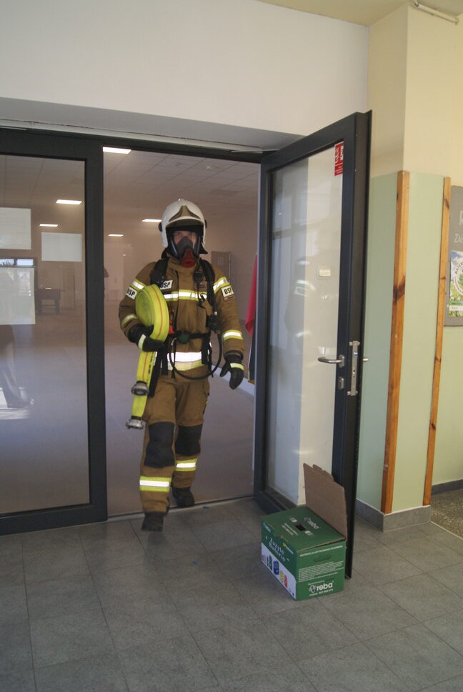 Całą akcją dowodziła dyrektor szkoły, pani Beata Grau, czuwając nad sprawnym i bezpiecznym przebiegiem działań. Niespełna kilka minut później pod szkołę z syrenami przybyły wozy strażackie. Strażacy rozłożyli sprzęt i natychmiast wbiegli do zadymionego budynku, by sprawdzić źródło zagrożenia i poszukać osób, które mogły pozostać w środku. Po chwili wszyscy z zapartym tchem obserwowali, jak strażacy wyprowadzają kolejne osoby – panią woźną, ucznia i nauczyciela. Każdemu z poszkodowanych natychmiast udzielono pomocy medycznej.
