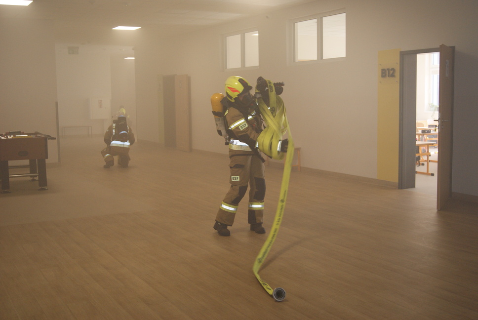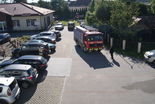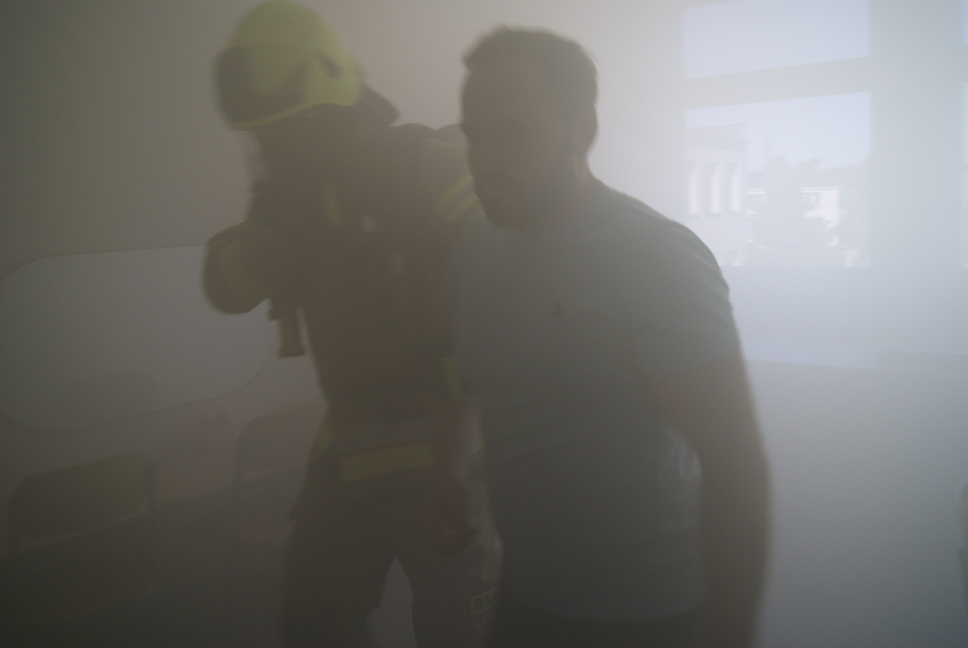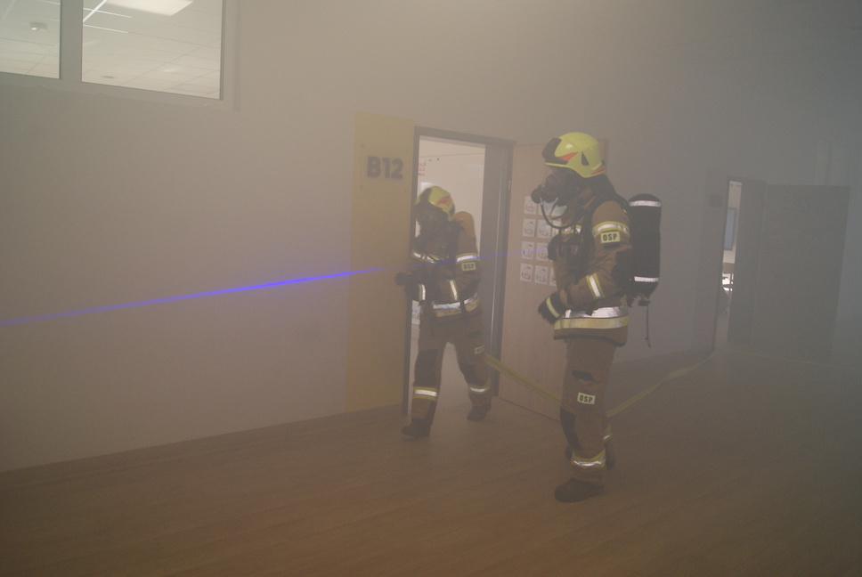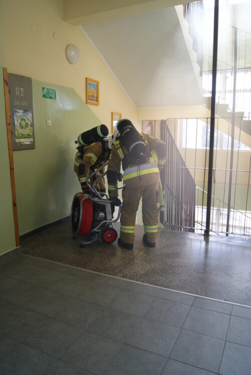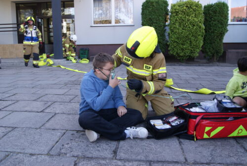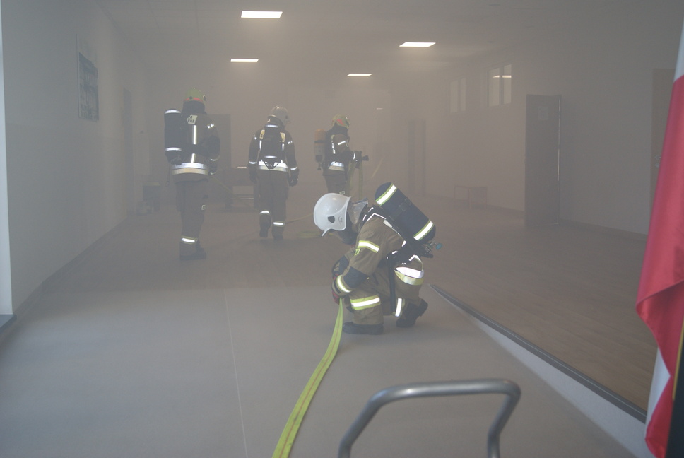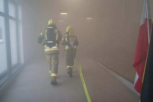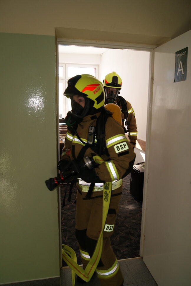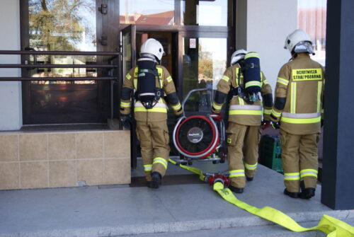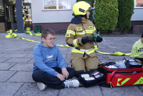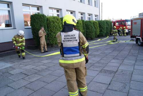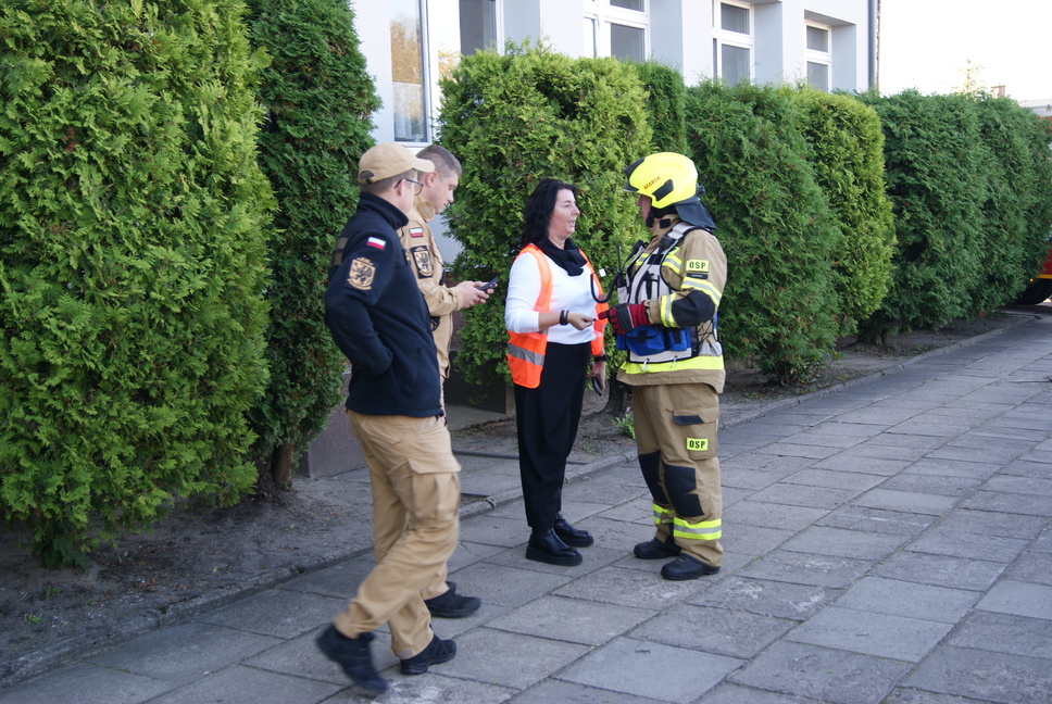 Całą akcją dowodziła dyrektor szkoły, pani Beata Grau, czuwając nad sprawnym i bezpiecznym przebiegiem działań. Niespełna kilka minut później pod szkołę z syrenami przybyły wozy strażackie. Strażacy rozłożyli sprzęt i natychmiast wbiegli do zadymionego budynku, by sprawdzić źródło zagrożenia i poszukać osób, które mogły pozostać w środku. Po chwili wszyscy z zapartym tchem obserwowali, jak strażacy wyprowadzają kolejne osoby – panią woźną, ucznia i nauczyciela. Każdemu z poszkodowanych natychmiast udzielono pomocy medycznej.