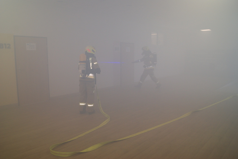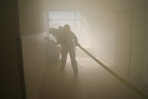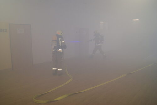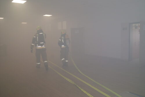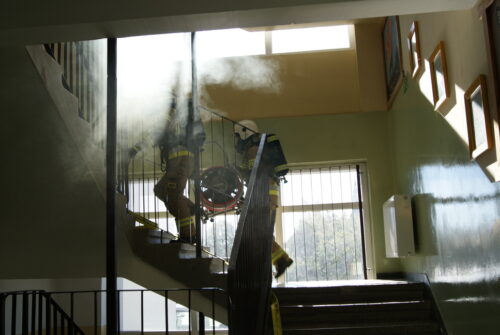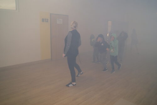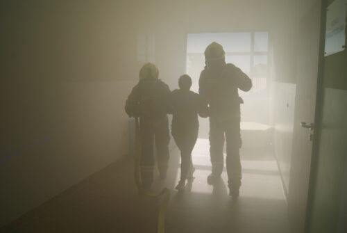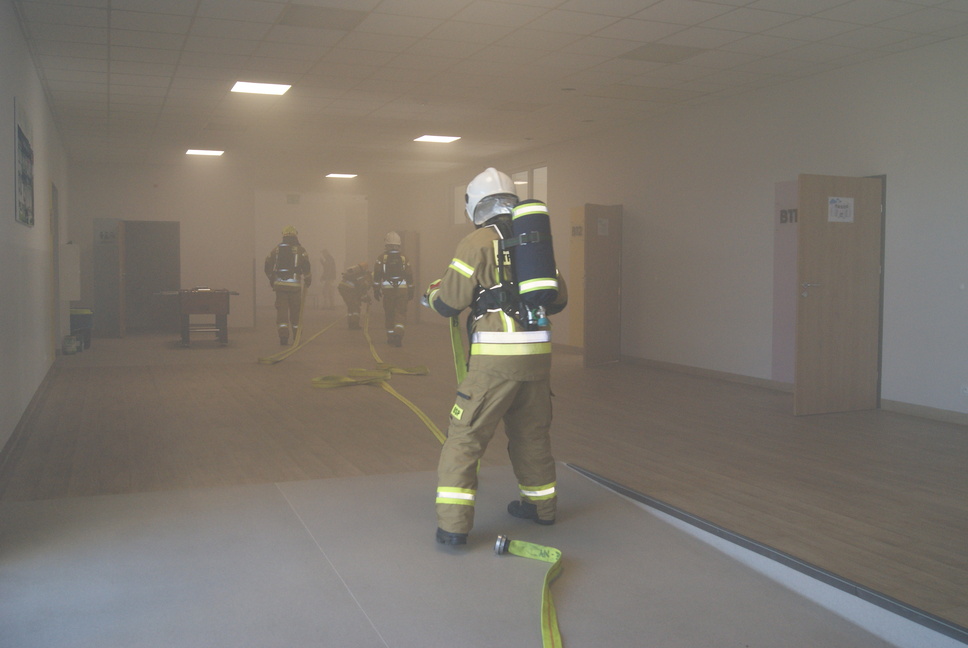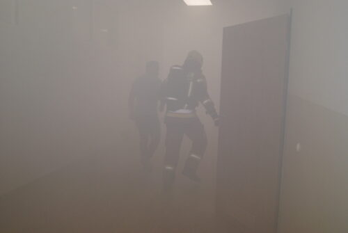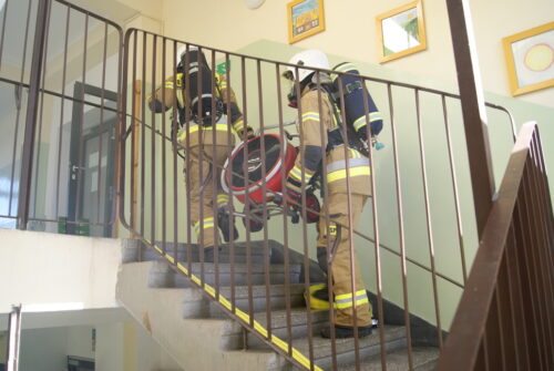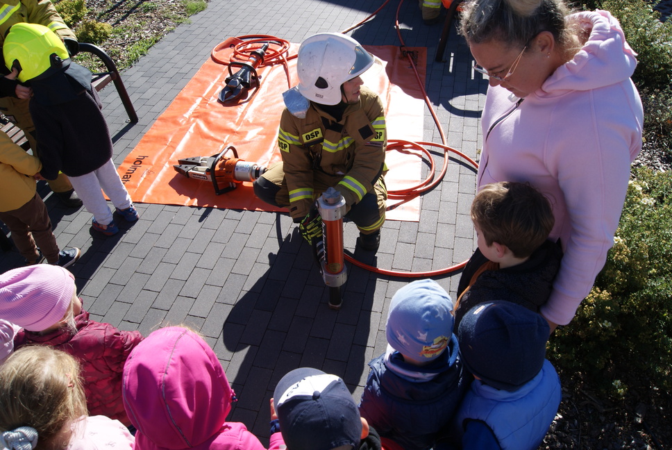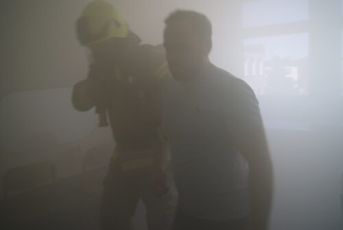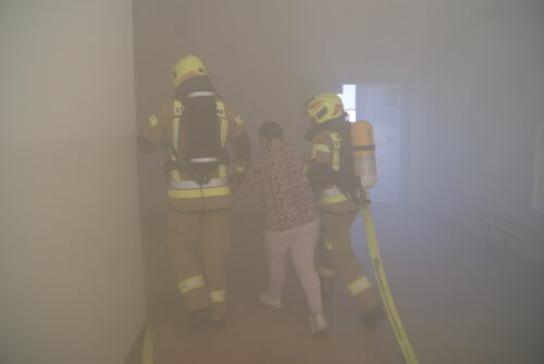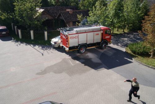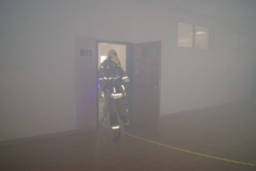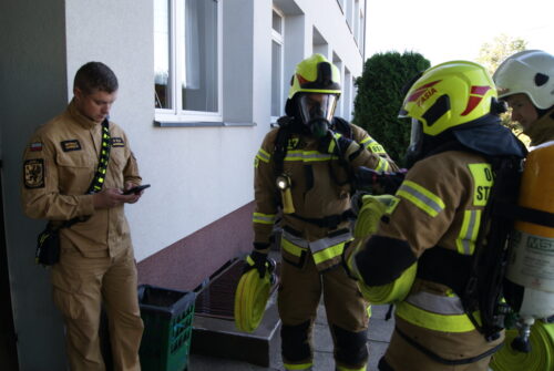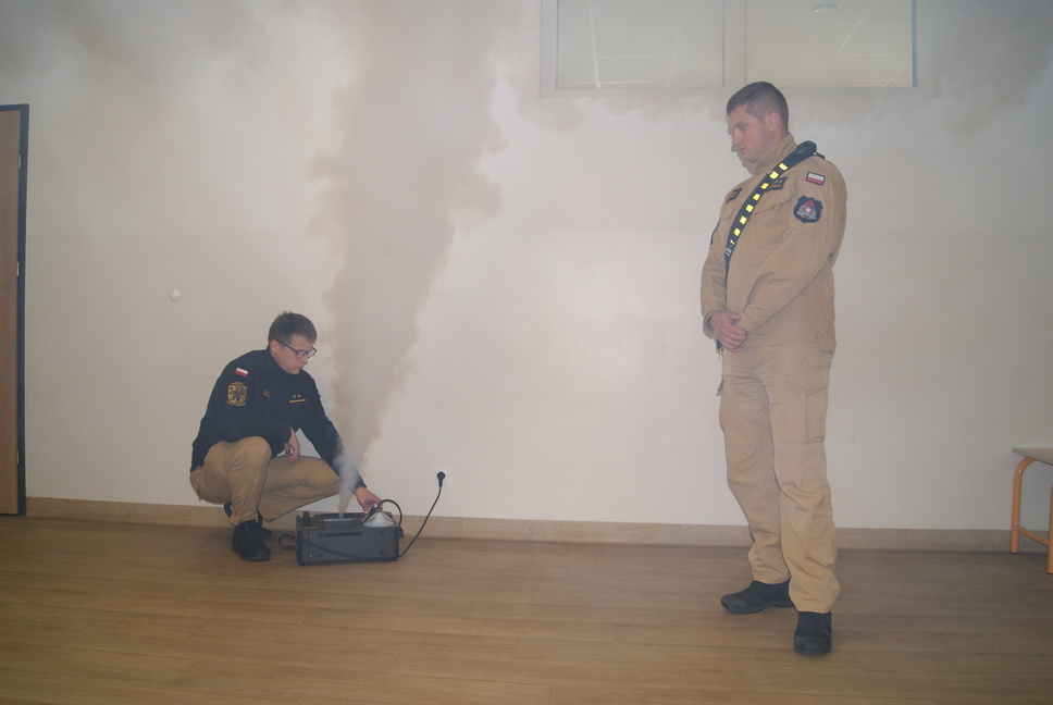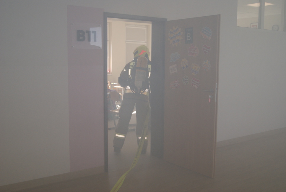 Całą akcją dowodziła dyrektor szkoły, pani Beata Grau, czuwając nad sprawnym i bezpiecznym przebiegiem działań. Niespełna kilka minut później pod szkołę z syrenami przybyły wozy strażackie. Strażacy rozłożyli sprzęt i natychmiast wbiegli do zadymionego budynku, by sprawdzić źródło zagrożenia i poszukać osób, które mogły pozostać w środku. Po chwili wszyscy z zapartym tchem obserwowali, jak strażacy wyprowadzają kolejne osoby – panią woźną, ucznia i nauczyciela. Każdemu z poszkodowanych natychmiast udzielono pomocy medycznej.