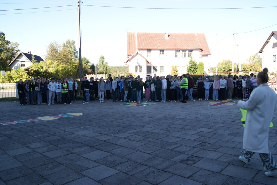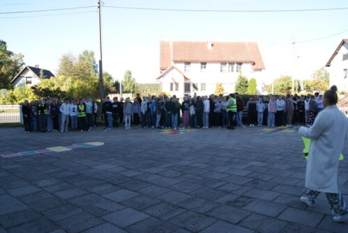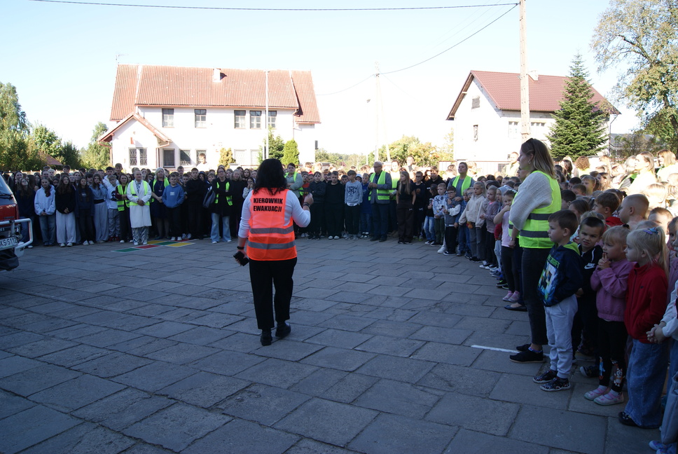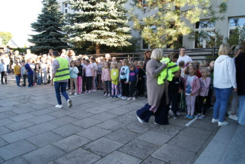 Kilka minut po godzinie 10 szkolne korytarze przeszył dźwięk syreny. Głośny, niepokojący alarm natychmiast poderwał uczniów i nauczycieli z miejsc. W jednej chwili lekcje zostały przerwane, a cała społeczność szkolna rozpoczęła ewakuację. Pod opieką wychowawców i nauczycieli wszyscy uczniowie udali się na boisko – wyznaczone miejsce zbiórki. Tam, zgodnie z procedurami, nauczyciele meldowali wyznaczonej osobie liczbę uczniów powierzonych ich opiece. Z kolei dzieci z naszego przedszkola zostały bezpiecznie ewakuowane na pobliskie boisko Orlik, gdzie również odbyło się sprawdzenie obecności i meldunek o liczbie dzieci.