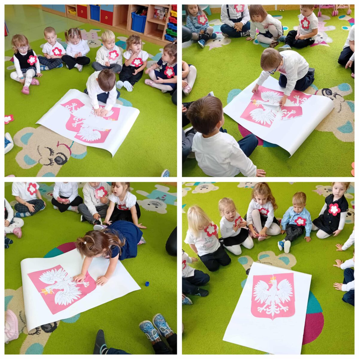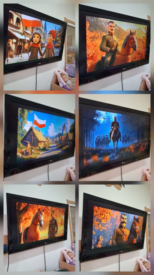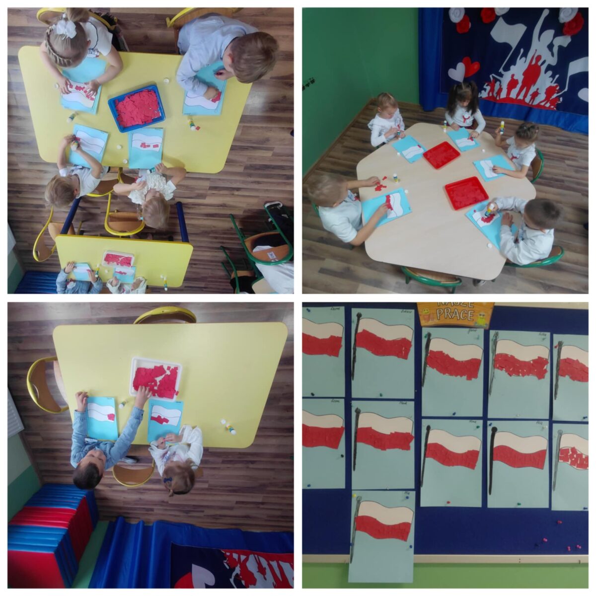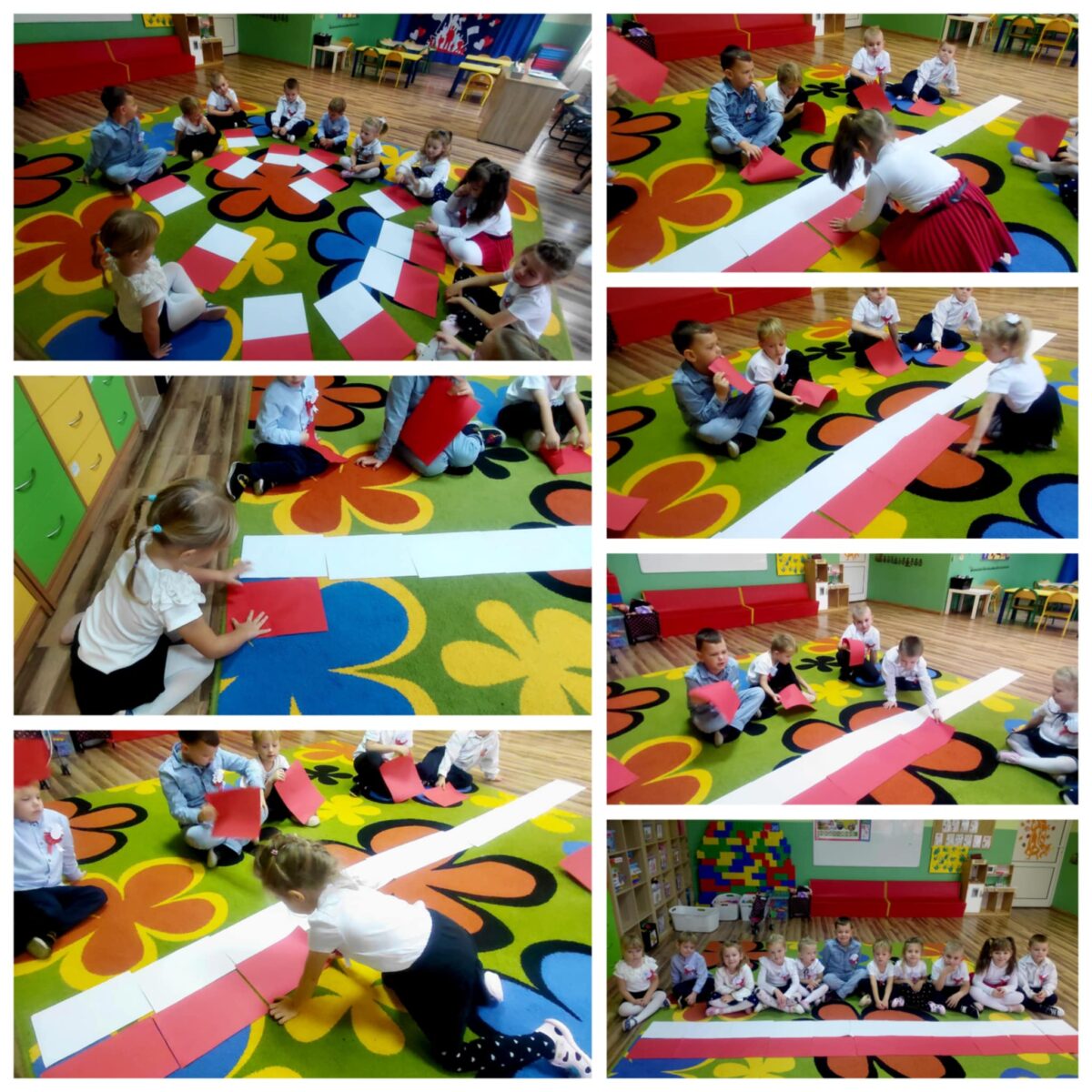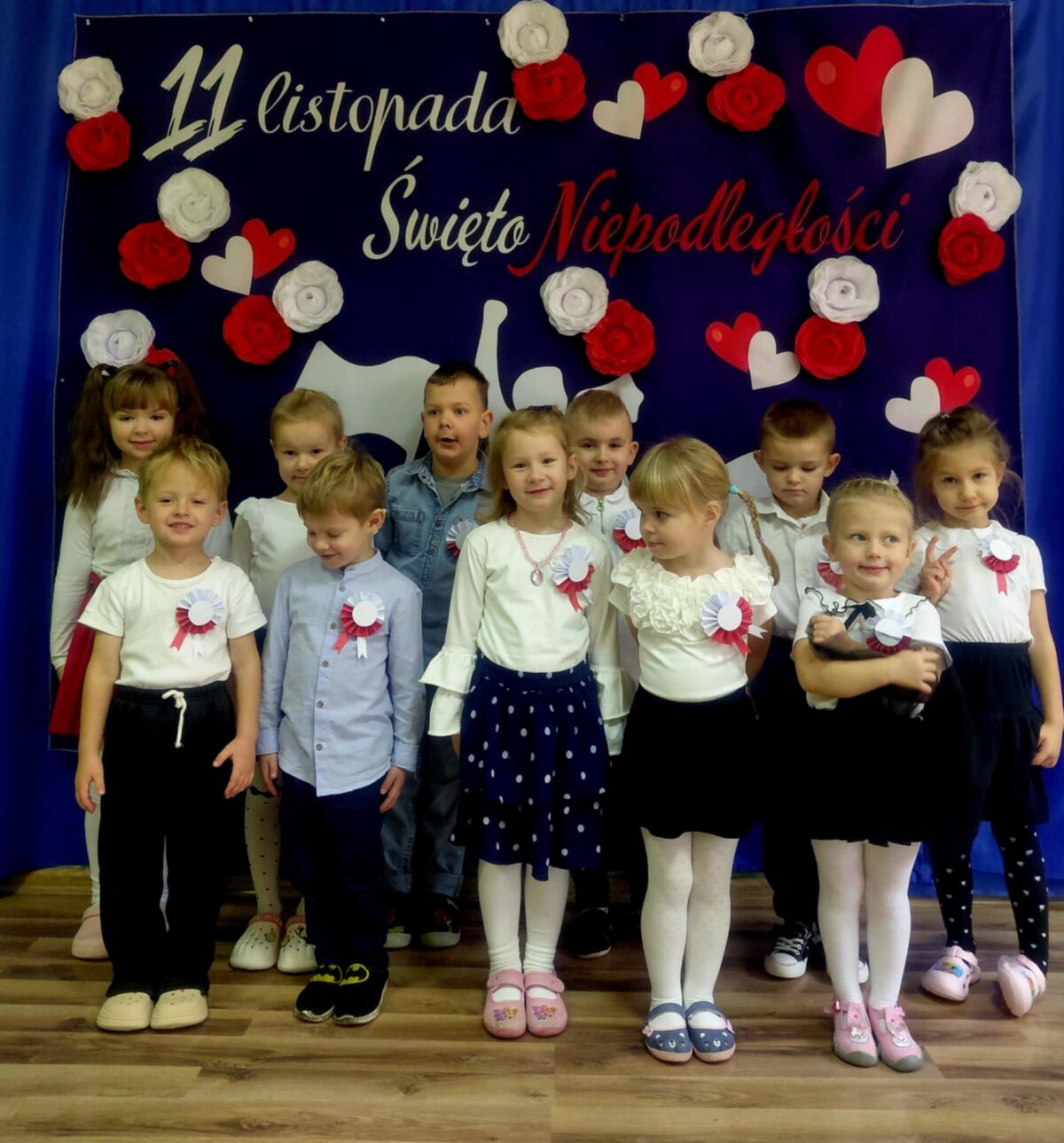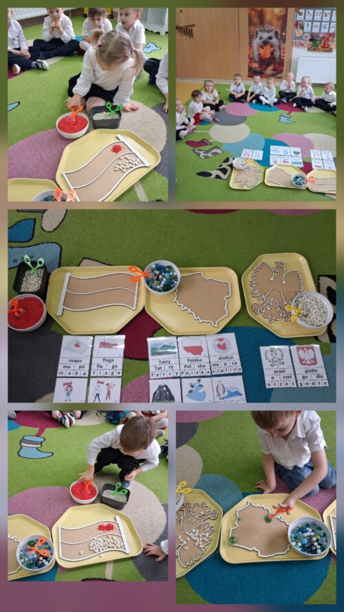 Przedszkolaki z ogromnym zaangażowaniem wykonywały prace plastyczne o tematyce patriotycznej, tworząc biało-czerwone flagi, kotyliony i godła. Kulminacyjnym punktem dnia było uroczyste odśpiewanie hymnu narodowego – „Mazurka Dąbrowskiego”, w którym dzieci uczestniczyły z dumą i powagą.
