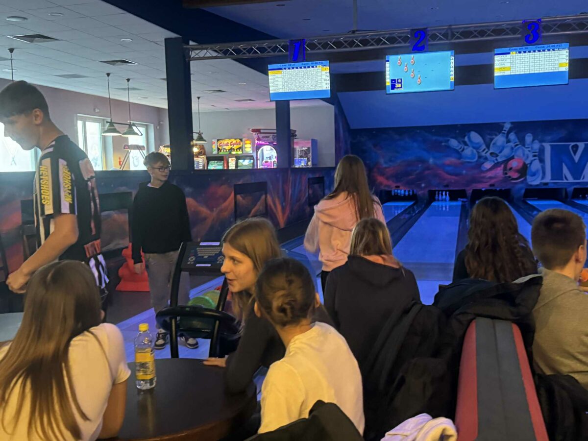 Po części kulturalnej uczniowie udali się do kręgielni, gdzie spędzili czas na wspólnej zabawie. Integracja sprzyjała budowaniu relacji rówieśniczych, współpracy oraz aktywnemu wypoczynkowi. Wyjazd był doskonałą okazją do połączenia edukacji kulturalnej z rekreacją i integracją zespołów klasowych.