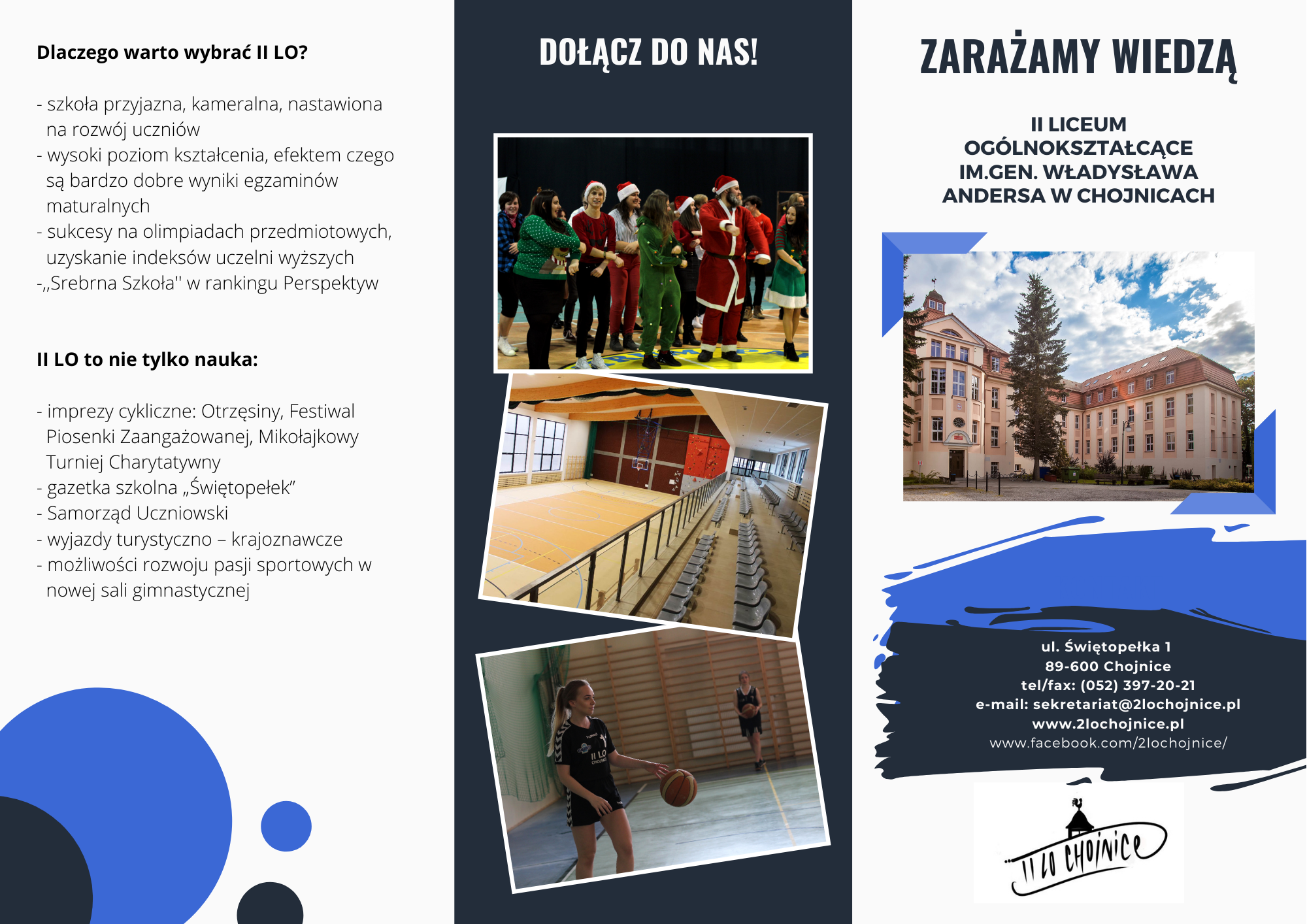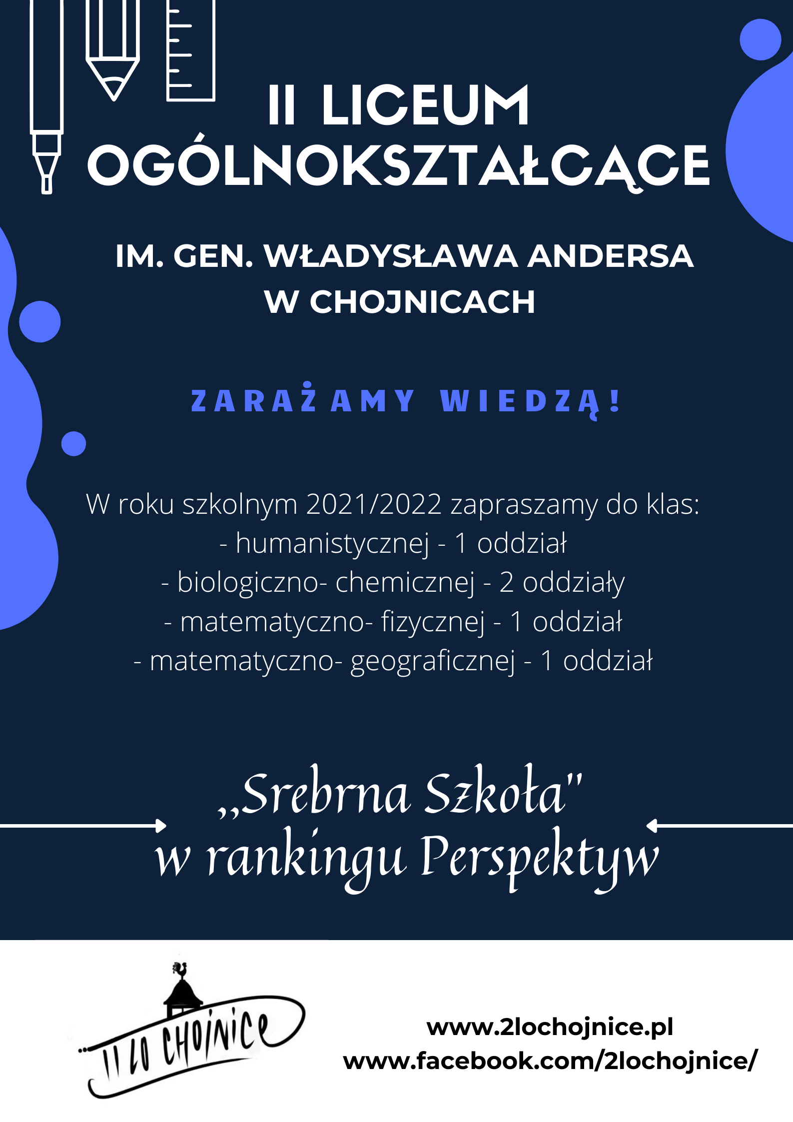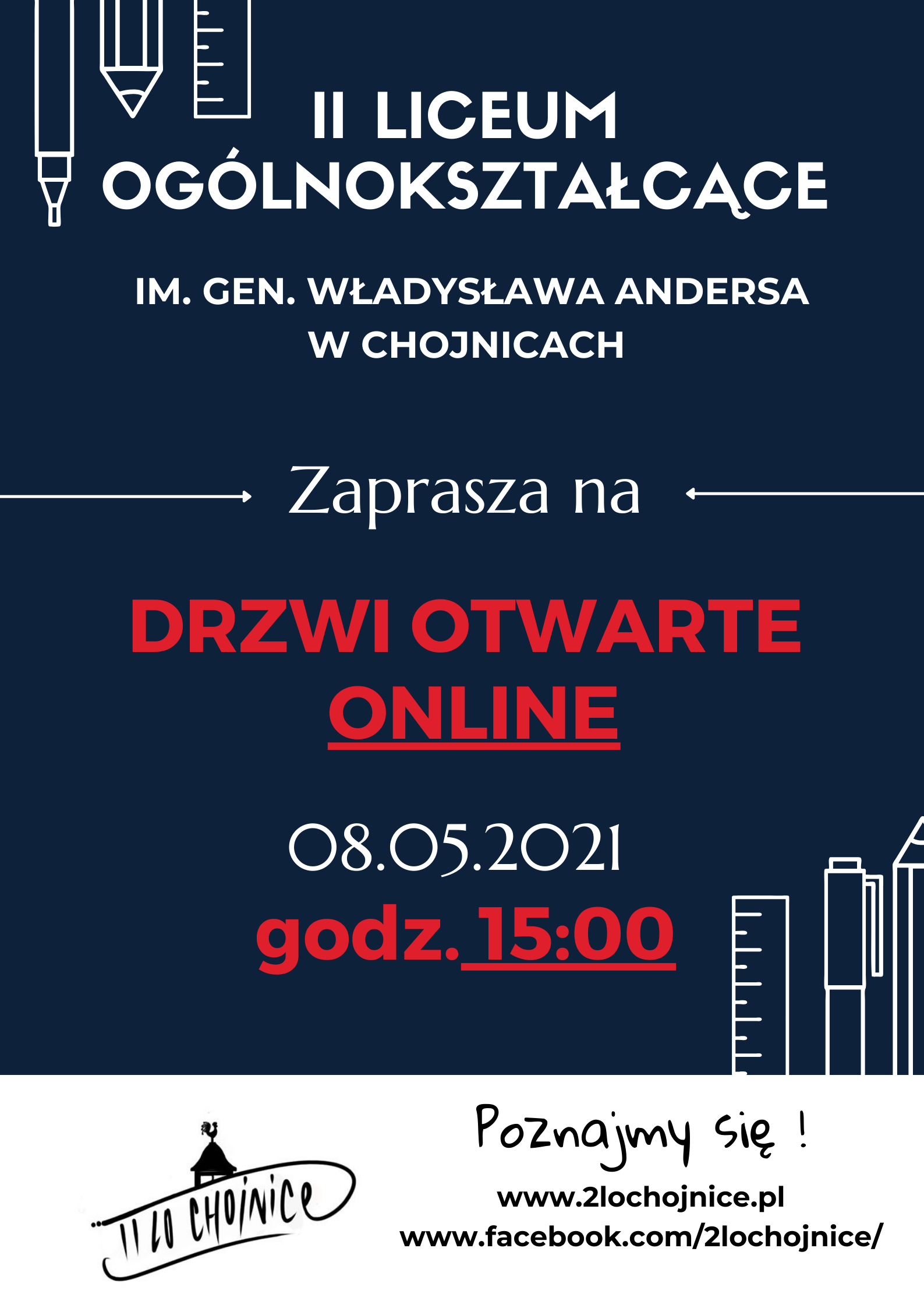 Zapraszamy Was serdecznie do udziału w wirtualnym dniu otwartym II Liceum Ogólnokształcącego im. gen. W. Andersa w Chojnicach. Dołączcie do nas 8 maja 2021 roku o godzinie 15.00 na naszym profilu www.facebook.com/2lochojnice/ oraz na naszym szkolnym Instagramie.