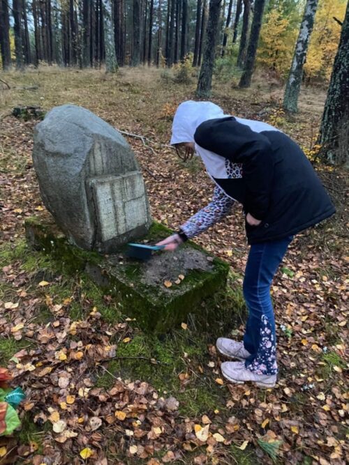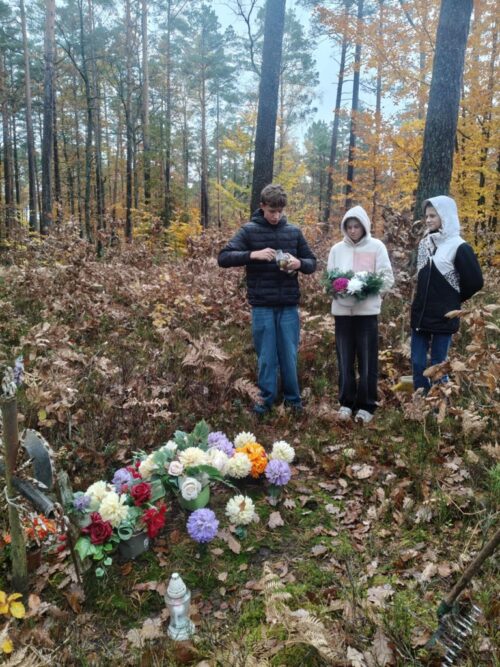 Uporządkowaliśmy łącznie 10 „leśnych grobów” i miejsc pamięci, na których złożyliśmy wykonane przez młodzież ozdobne stroiki oraz zapaliliśmy symboliczne znicze.