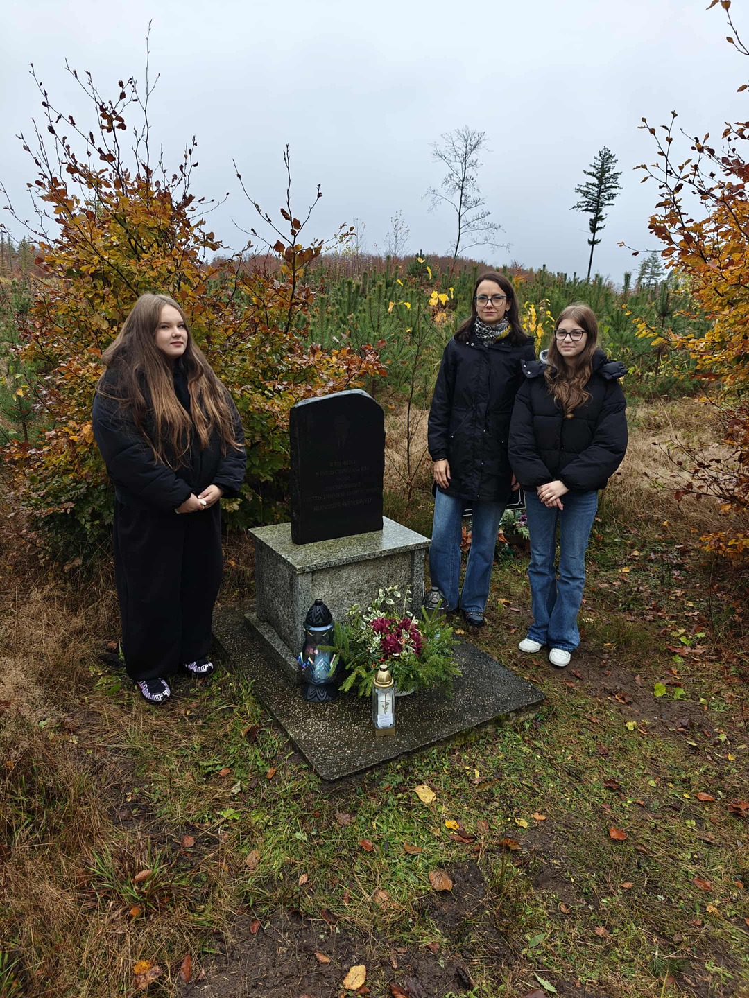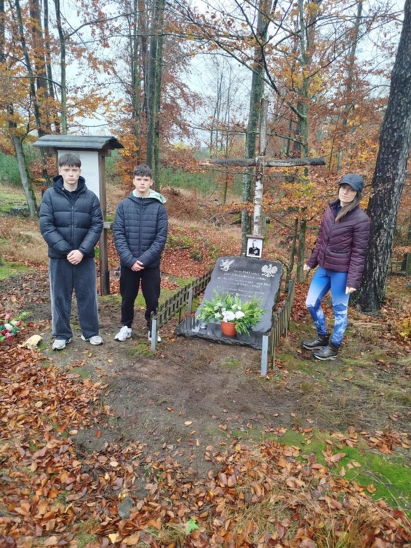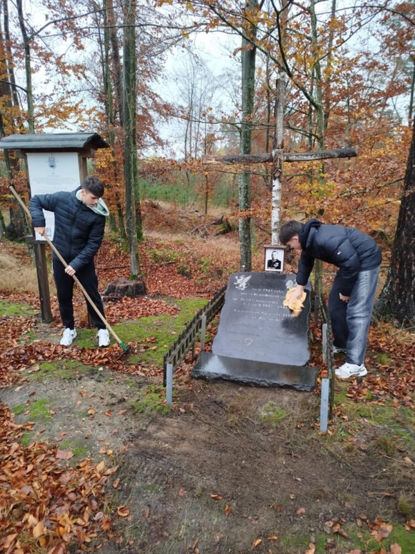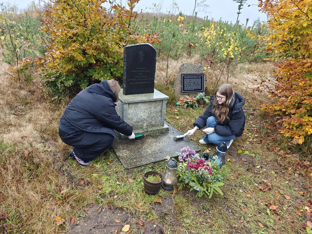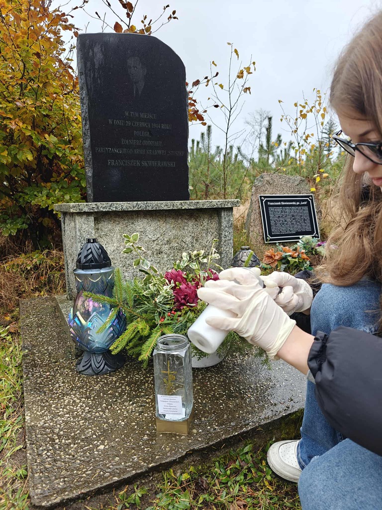 Uporządkowaliśmy łącznie 10 „leśnych grobów” i miejsc pamięci, na których złożyliśmy wykonane przez młodzież ozdobne stroiki oraz zapaliliśmy symboliczne znicze.