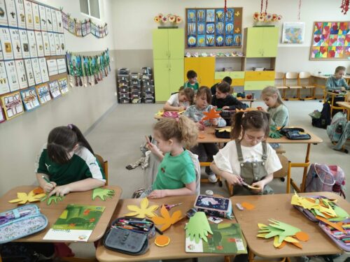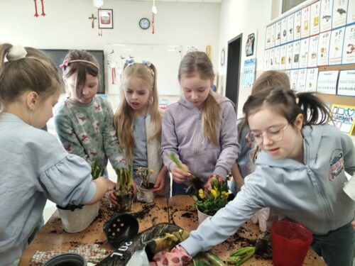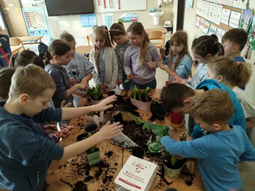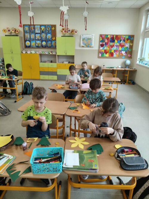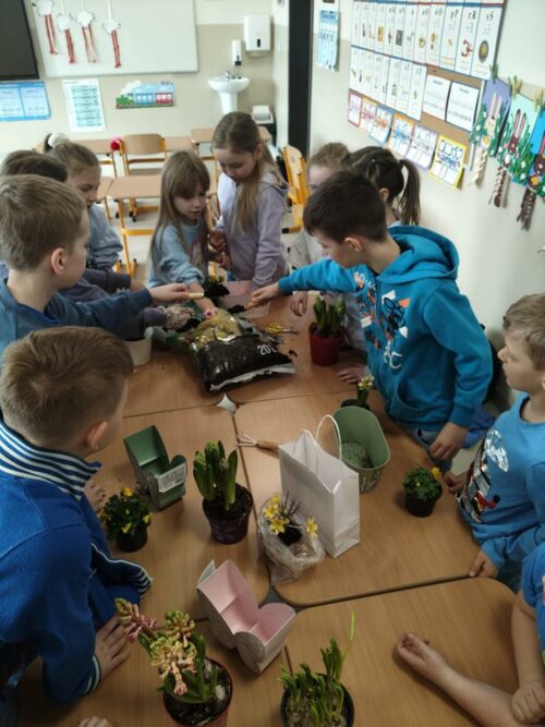 Pierwszy dzień wiosny w naszej szkole upłynął w radosnej i pełnej energii atmosferze. Uczniowie klas I-III z zaangażowaniem uczestniczyli w różnorodnych aktywnościach związanych z nadejściem nowej pory roku. Podczas zajęć uczniowie poszukiwali oznak wiosny, dzielili się swoimi spostrzeżeniami, rozmawiali o zmianach zachodzących w przyrodzie oraz zakładali wiosenną hodowlę roślin. Następnie rozwijały swoją kreatywność, wykonując barwne prace plastyczne inspirowane wiosną. Powstałe dekoracje wprowadziły do sal lekcyjnych wyjątkowy, pogodny nastrój. Nie zabrakło także gier i zabaw, które dostarczyły uczniom wiele radości i uśmiechu. Wspólne aktywności sprzyjały integracji oraz budowaniu pozytywnych relacji w grupie. To był dzień pełen wrażeń, który wprowadził wszystkich w pogodny, wiosenny nastrój.