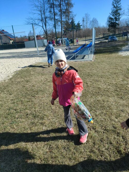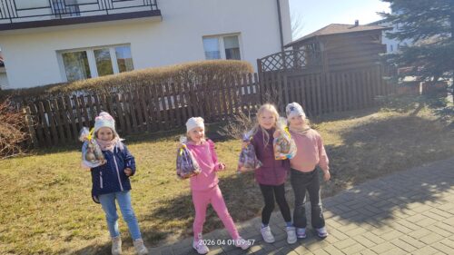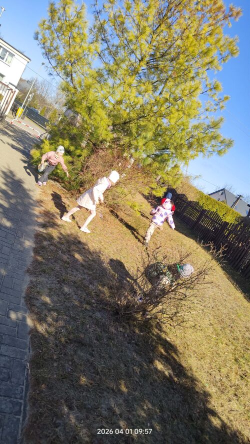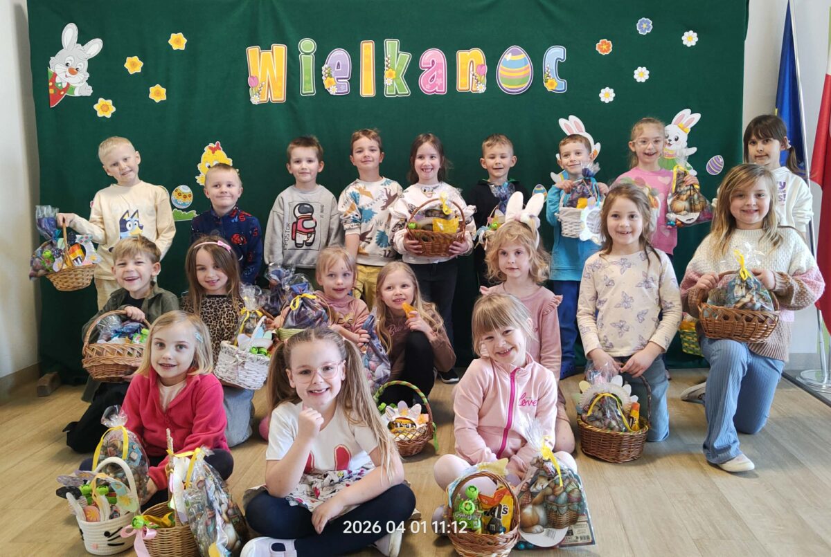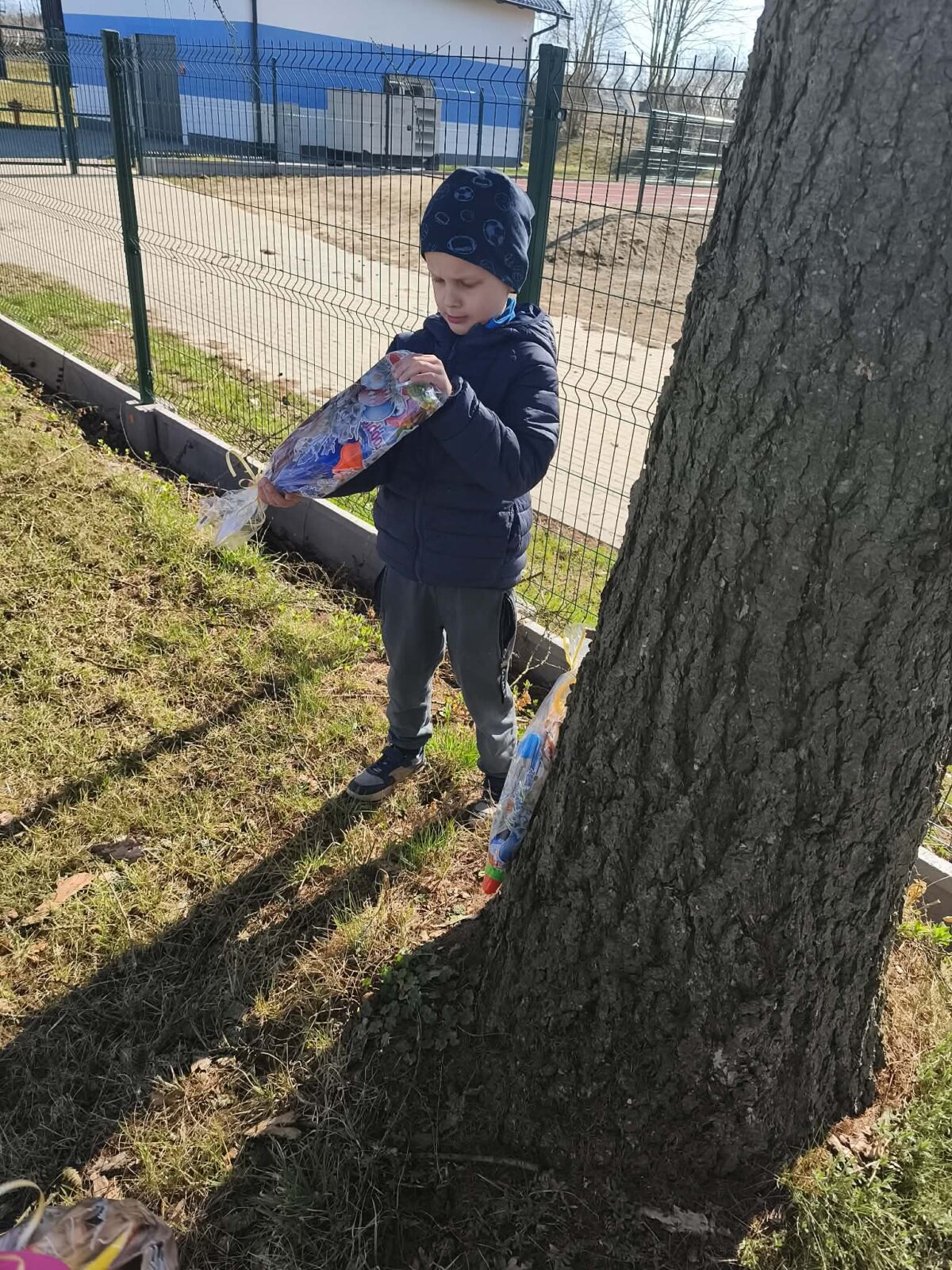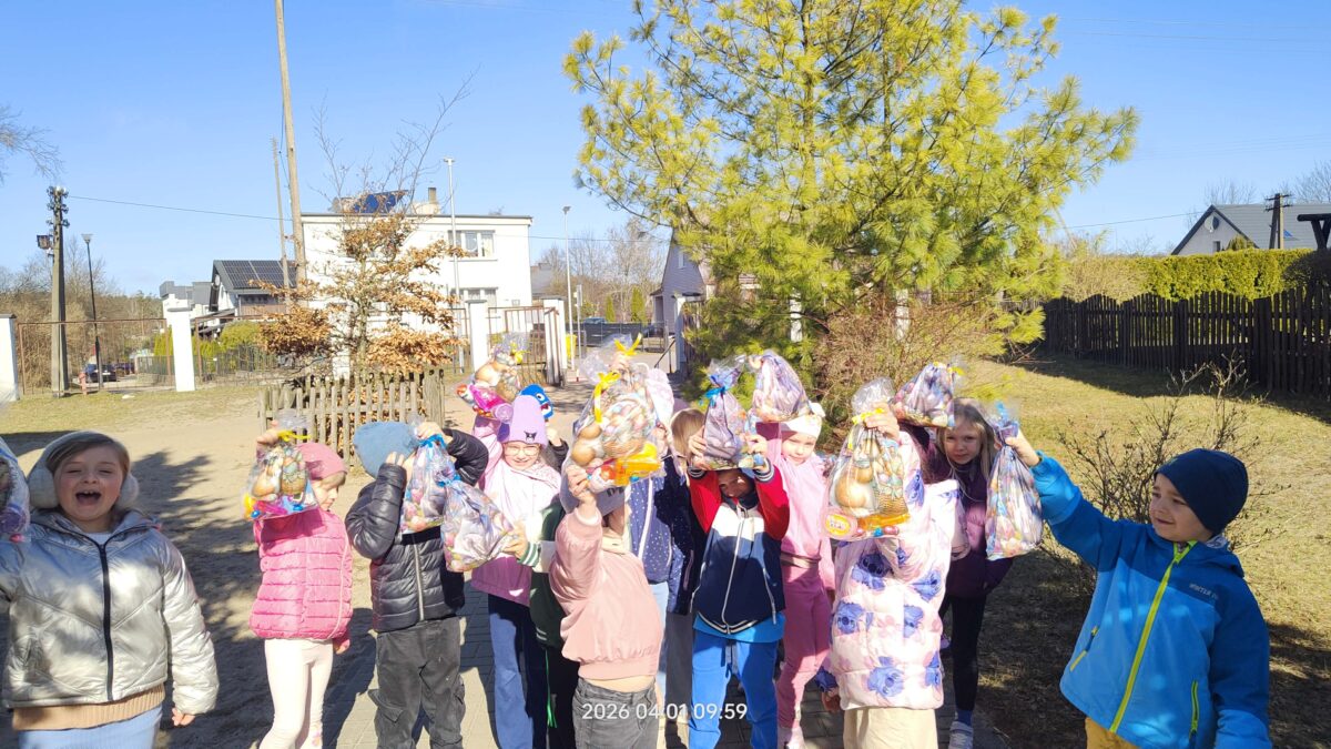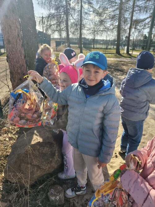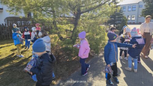 W środę 1.04.2026 r. dzieci z zerówek wzięły udział w wyjątkowej, pełnej radości zabawie – poszukiwaniu upominków pozostawionych przez wielkanocnego Zajączka! Po śniadaniu dzieci wyruszyły na teren wokół szkoły, gdzie – jak się okazało – czekało na nie mnóstwo niespodzianek. Wśród drzew, krzewów i szkolnych zakamarków ukryte były kolorowe paczuszki, które dzieci z ogromnym zaangażowaniem i uśmiechem odnajdywały. Nie zabrakło emocji, współpracy i świetnej zabawy! Każde znalezione znalezisko wywoływało wiele radości, a wspólne poszukiwania stały się doskonałą okazją do integracji i aktywności na świeżym powietrzu.