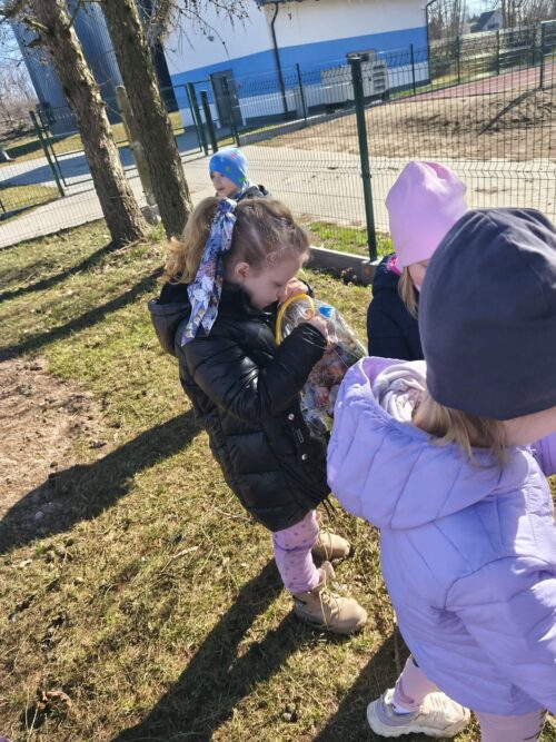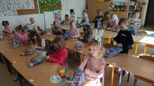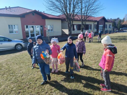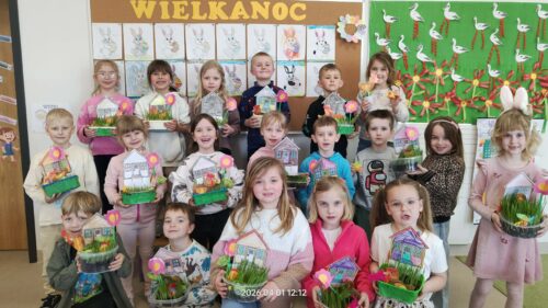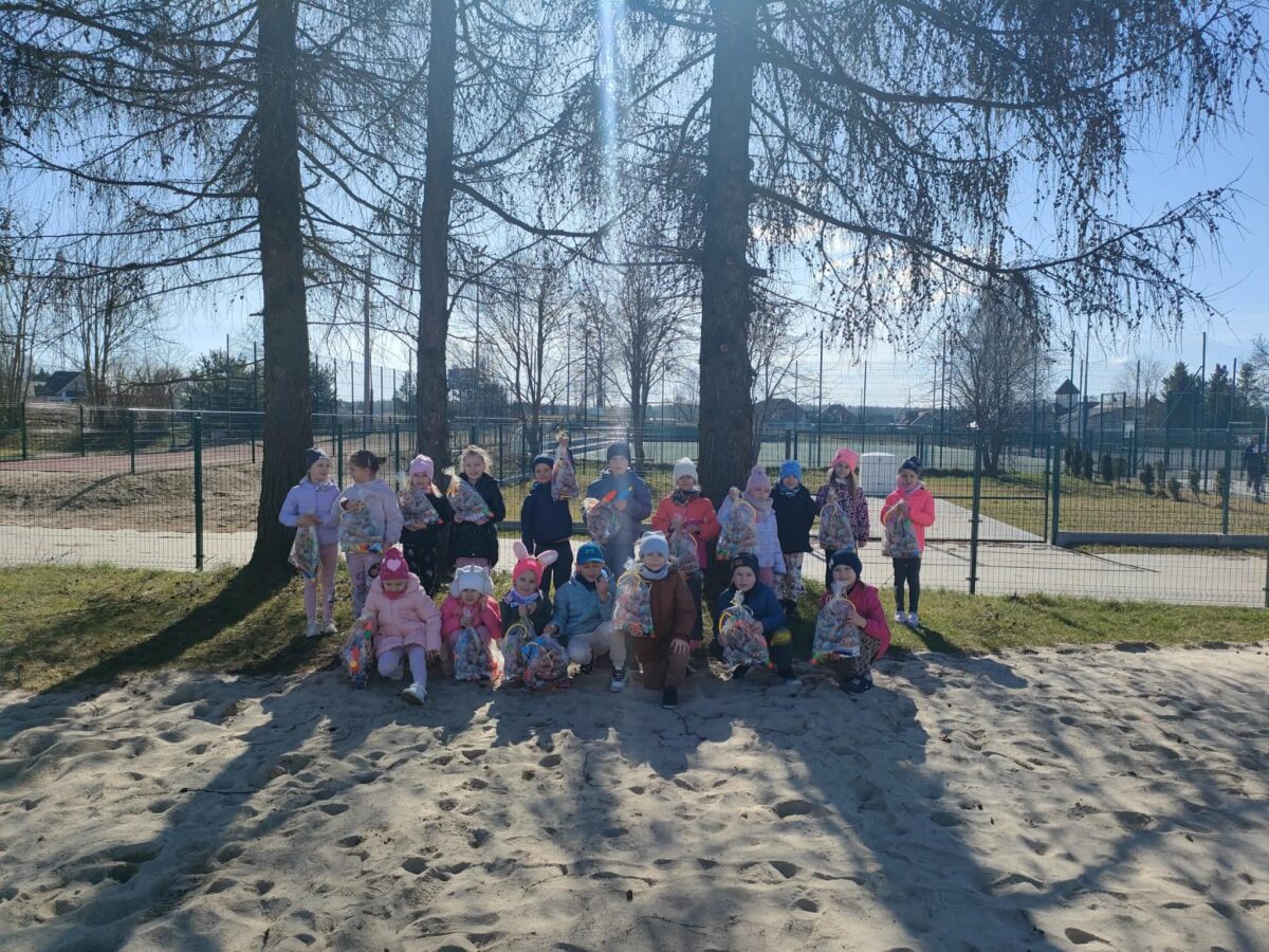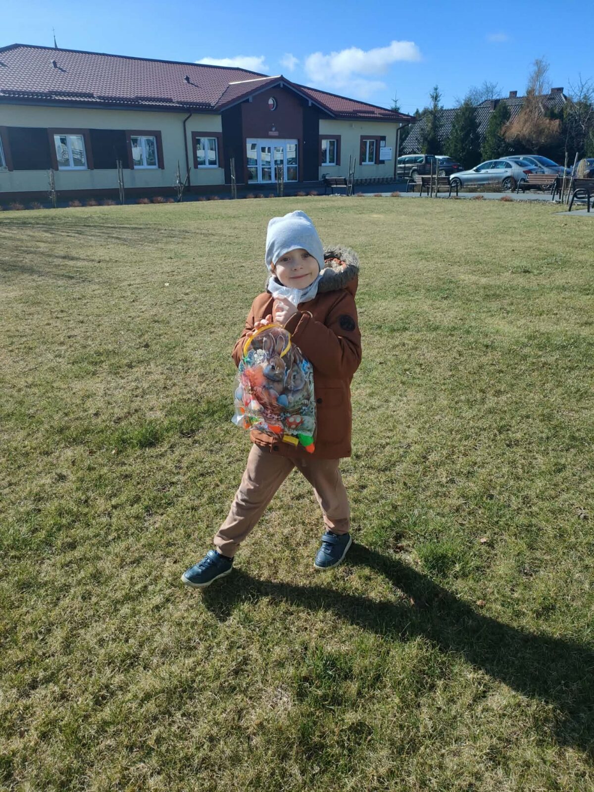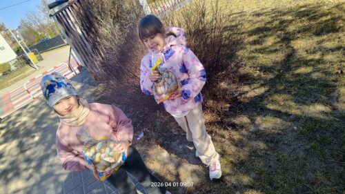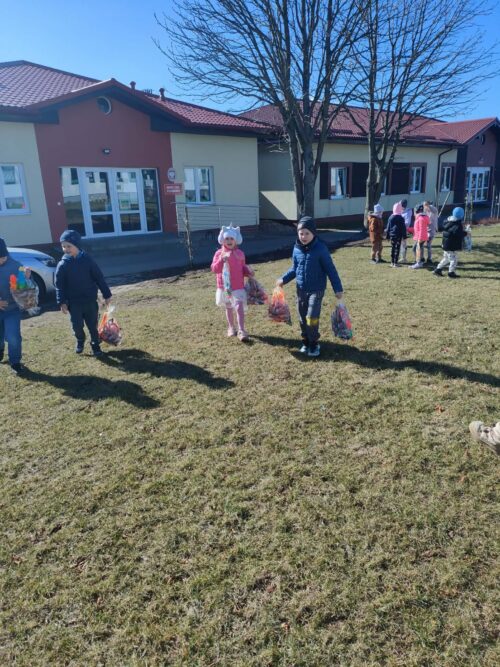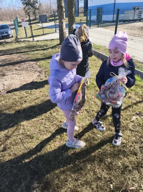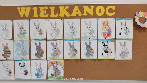 W środę 1.04.2026 r. dzieci z zerówek wzięły udział w wyjątkowej, pełnej radości zabawie – poszukiwaniu upominków pozostawionych przez wielkanocnego Zajączka! Po śniadaniu dzieci wyruszyły na teren wokół szkoły, gdzie – jak się okazało – czekało na nie mnóstwo niespodzianek. Wśród drzew, krzewów i szkolnych zakamarków ukryte były kolorowe paczuszki, które dzieci z ogromnym zaangażowaniem i uśmiechem odnajdywały. Nie zabrakło emocji, współpracy i świetnej zabawy! Każde znalezione znalezisko wywoływało wiele radości, a wspólne poszukiwania stały się doskonałą okazją do integracji i aktywności na świeżym powietrzu.