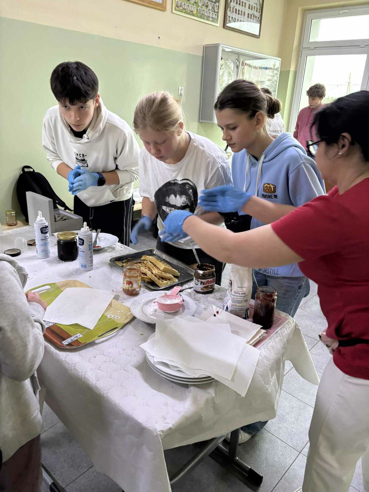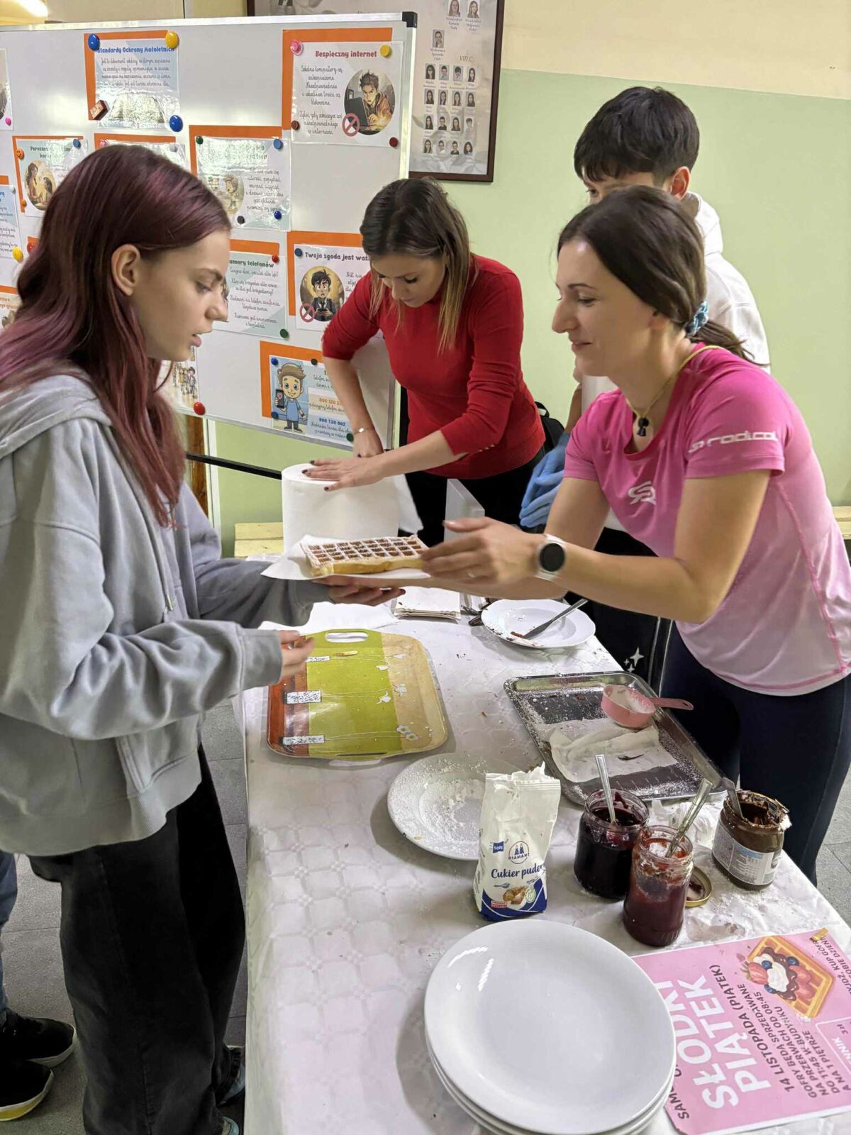 Nad całością wydarzenia czuwały opiekunki Samorządu – pani Natalia Kuklińska oraz pani Joanna Stachowicz, które koordynowały przygotowania oraz wspierały uczniów w trakcie akcji. W działania aktywnie włączyły się także pani Magdalena Klemann oraz pani Weronika Stankowska, pomagając zarówno przy przygotowaniu gofrów, jak i przy obsłudze stanowiska.