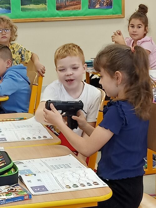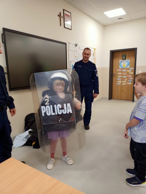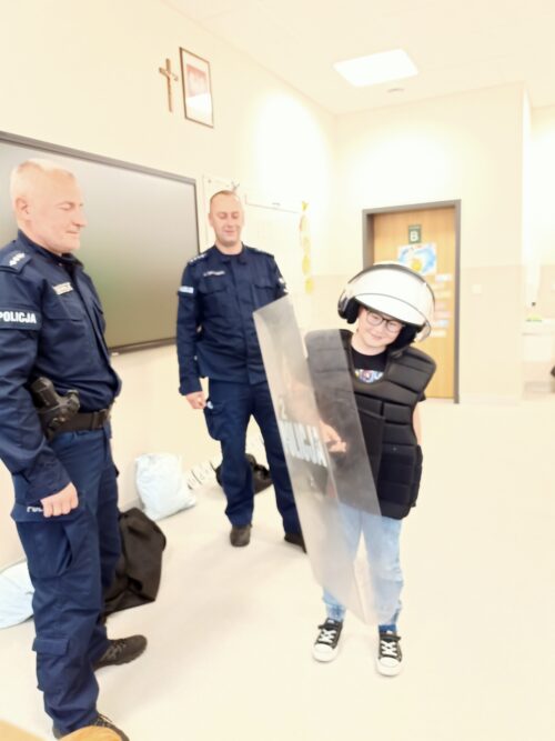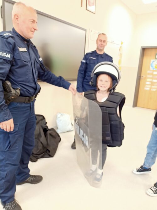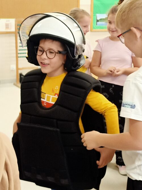 Duże zainteresowanie wzbudziła część praktyczna spotkania. Pierwszoklasiści mogli z bliska obejrzeć policyjny ekwipunek – m.in. kask ochronny, kamizelkę oraz tarczę ochronną używaną podczas interwencji. Chętne dzieci miały okazję przymierzyć elementy umundurowania i choć przez chwilę poczuć się jak prawdziwi policjanci!