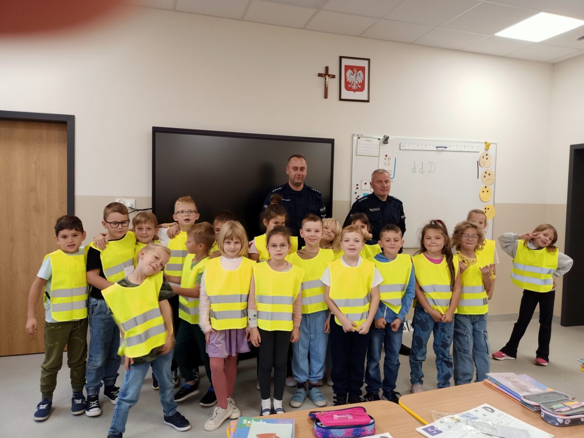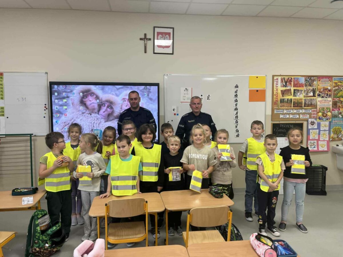 Na zakończenie spotkania funkcjonariusze wręczyli każdemu uczniowi kamizelkę odblaskową, aby dzieci były dobrze widoczne i bezpieczne na drodze podczas jesiennych spacerów i powrotów ze szkoły.