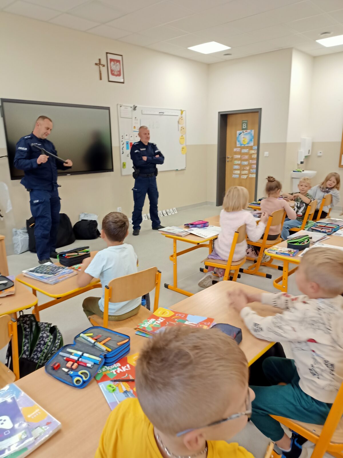 8 października uczniowie klas pierwszych uczestniczyli w wyjątkowym spotkaniu z funkcjonariuszami Policji. Goście opowiedzieli dzieciom o swojej odpowiedzialnej pracy oraz przypomnieli najważniejsze zasady bezpiecznego poruszania się po drodze – zarówno jako piesi, jak i pasażerowie.