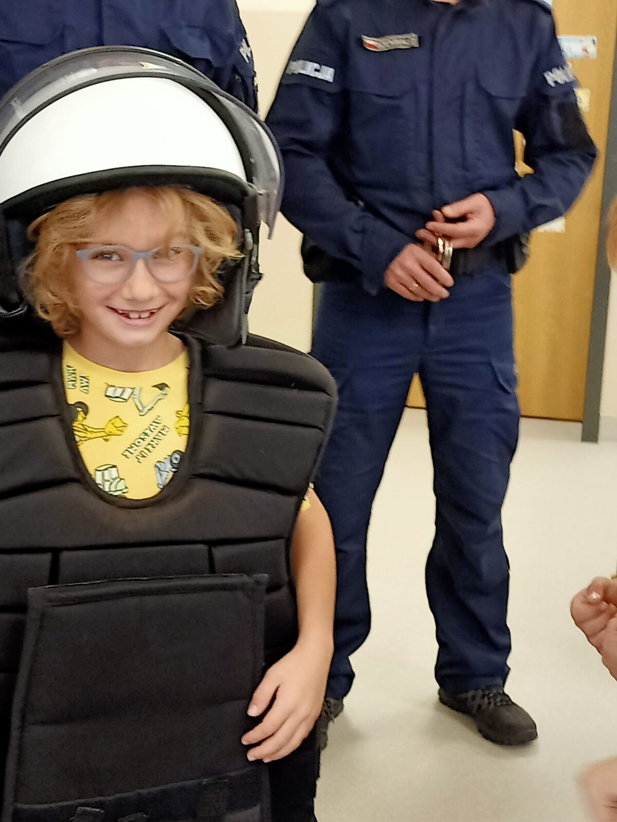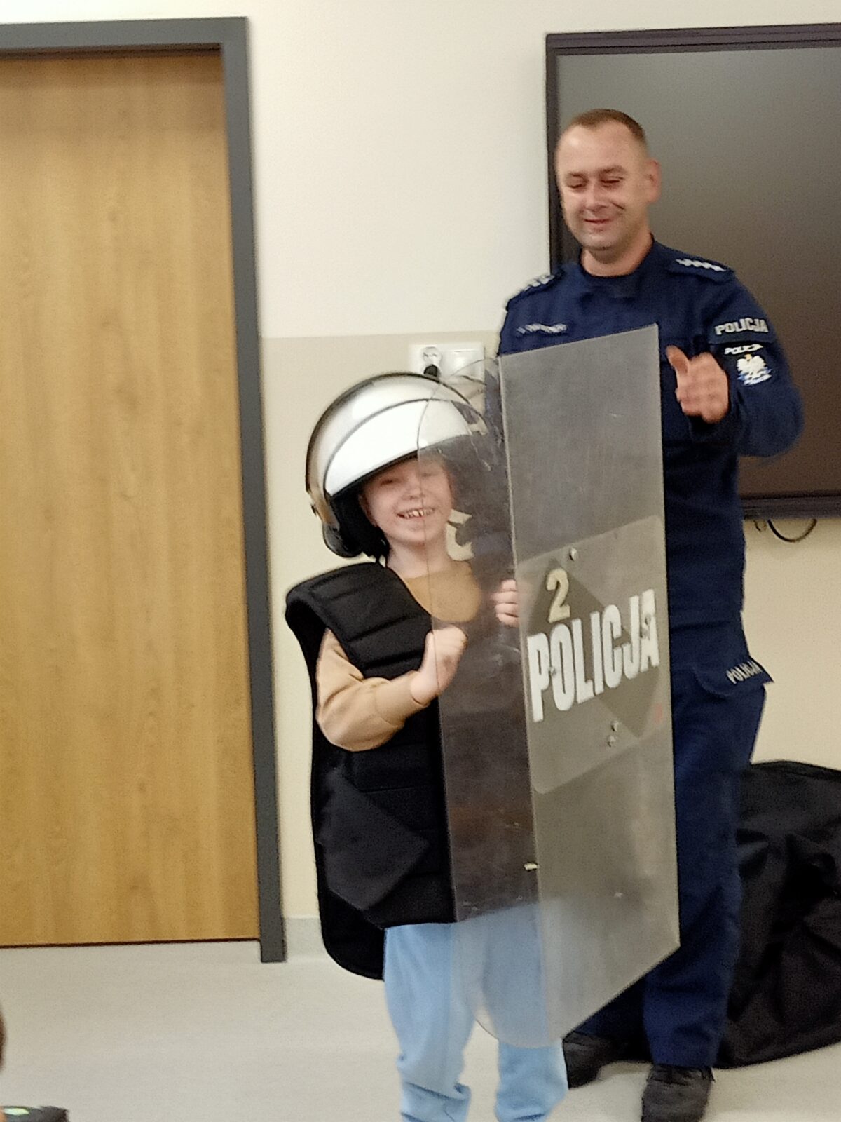 Duże zainteresowanie wzbudziła część praktyczna spotkania. Pierwszoklasiści mogli z bliska obejrzeć policyjny ekwipunek – m.in. kask ochronny, kamizelkę oraz tarczę ochronną używaną podczas interwencji. Chętne dzieci miały okazję przymierzyć elementy umundurowania i choć przez chwilę poczuć się jak prawdziwi policjanci!