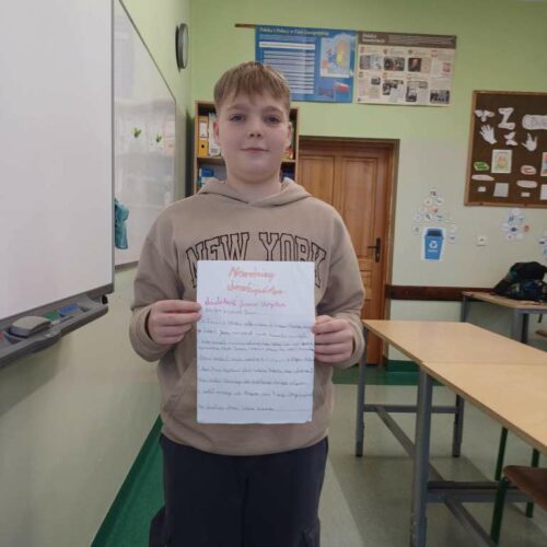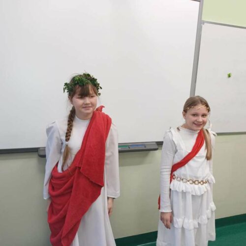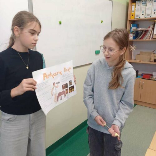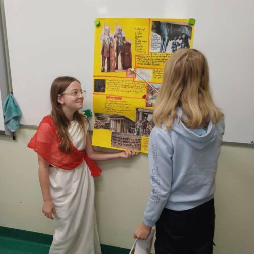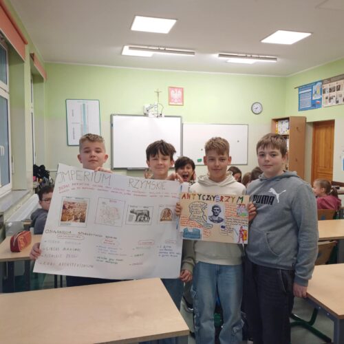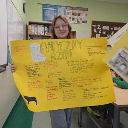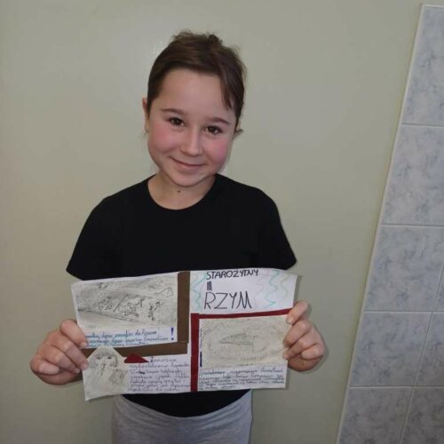 Uczniowie klas 5a i 5b na lekcjach historii wzięli udział w przedsięwzięciu edukacyjnym, który zastąpił tradycyjny sprawdzian. Ich zadaniem było stworzenie kreatywnego popisu zdobytych wiadomości łącząc naukę z pracą zespołową i rozwijaniem zdolności artystycznych. Uczniowie zaprezentowali szeroki zakres tematów: od położenia geograficznego Rzymu i legendy o Romulusie i Remusie, przez funkcjonowanie republiki i początki cesarstwa, aż po największe osiągnięcia Rzymian w dziedzinie architektury, prawa i literatury. Mieli okazję zaprezentować swoją pracę na forum klasy, co pozwoliło nie tylko podsumować zdobytą wiedzę, ale również wymienić się pomysłami i inspiracjami. Projekt okazał się ogromnym sukcesem. Uczniowie nie tylko poszerzyli swoją wiedzę historyczną, ale również rozwinęli umiejętności pracy zespołowej – wspólnie dzielili się zadaniami, podejmowali decyzje i wspierali się nawzajem. Kreatywność i staranność, z jaką wykonano prace, były imponujące, a możliwość publicznej prezentacji pozwoliła dzieciom doskonalić swoje zdolności komunikacyjne.