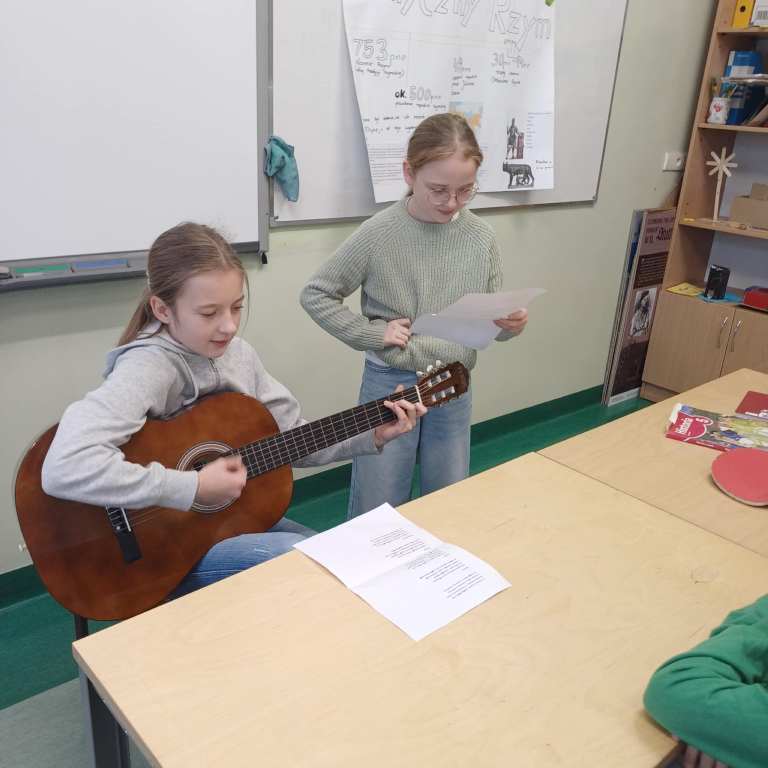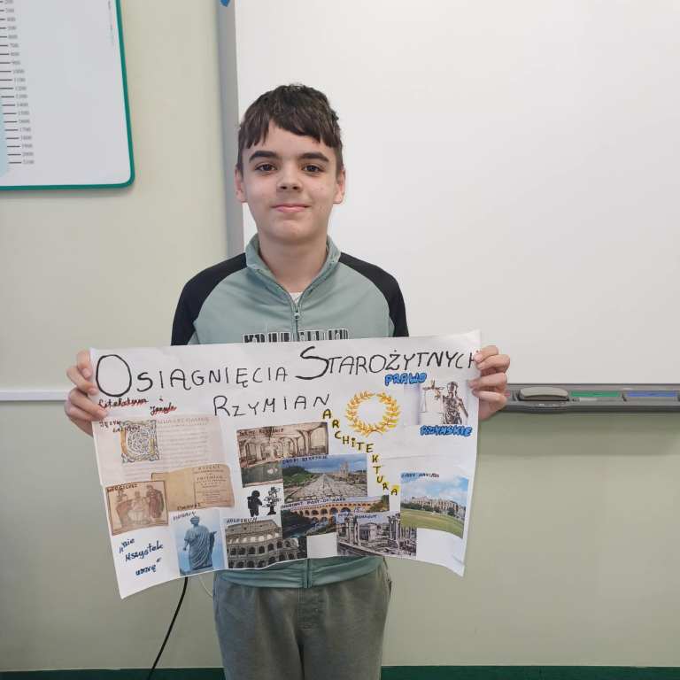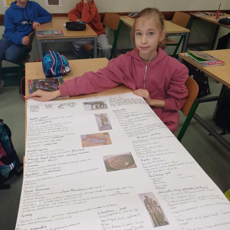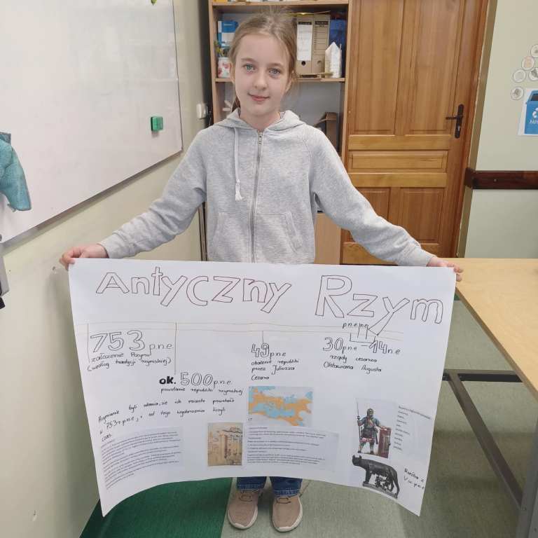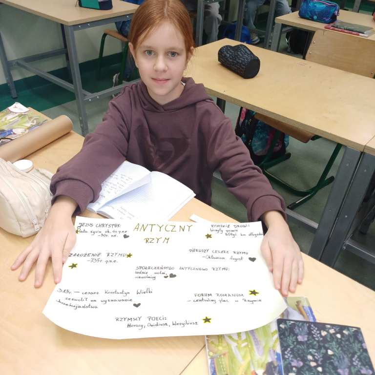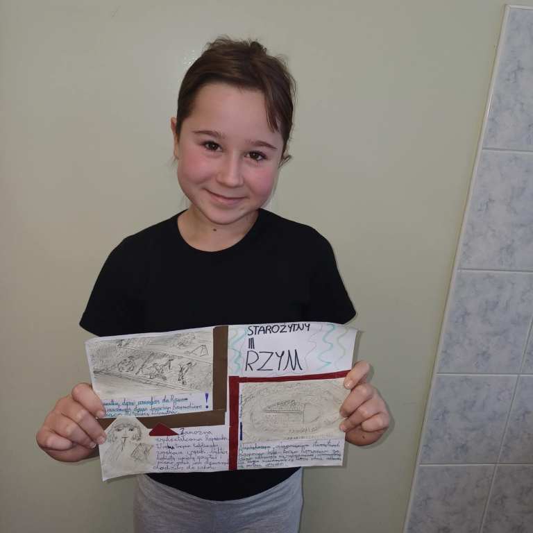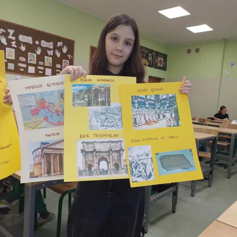 Uczniowie klas 5a i 5b na lekcjach historii wzięli udział w przedsięwzięciu edukacyjnym, który zastąpił tradycyjny sprawdzian. Ich zadaniem było stworzenie kreatywnego popisu zdobytych wiadomości łącząc naukę z pracą zespołową i rozwijaniem zdolności artystycznych. Uczniowie zaprezentowali szeroki zakres tematów: od położenia geograficznego Rzymu i legendy o Romulusie i Remusie, przez funkcjonowanie republiki i początki cesarstwa, aż po największe osiągnięcia Rzymian w dziedzinie architektury, prawa i literatury. Mieli okazję zaprezentować swoją pracę na forum klasy, co pozwoliło nie tylko podsumować zdobytą wiedzę, ale również wymienić się pomysłami i inspiracjami. Projekt okazał się ogromnym sukcesem. Uczniowie nie tylko poszerzyli swoją wiedzę historyczną, ale również rozwinęli umiejętności pracy zespołowej – wspólnie dzielili się zadaniami, podejmowali decyzje i wspierali się nawzajem. Kreatywność i staranność, z jaką wykonano prace, były imponujące, a możliwość publicznej prezentacji pozwoliła dzieciom doskonalić swoje zdolności komunikacyjne.