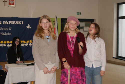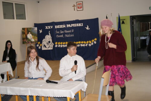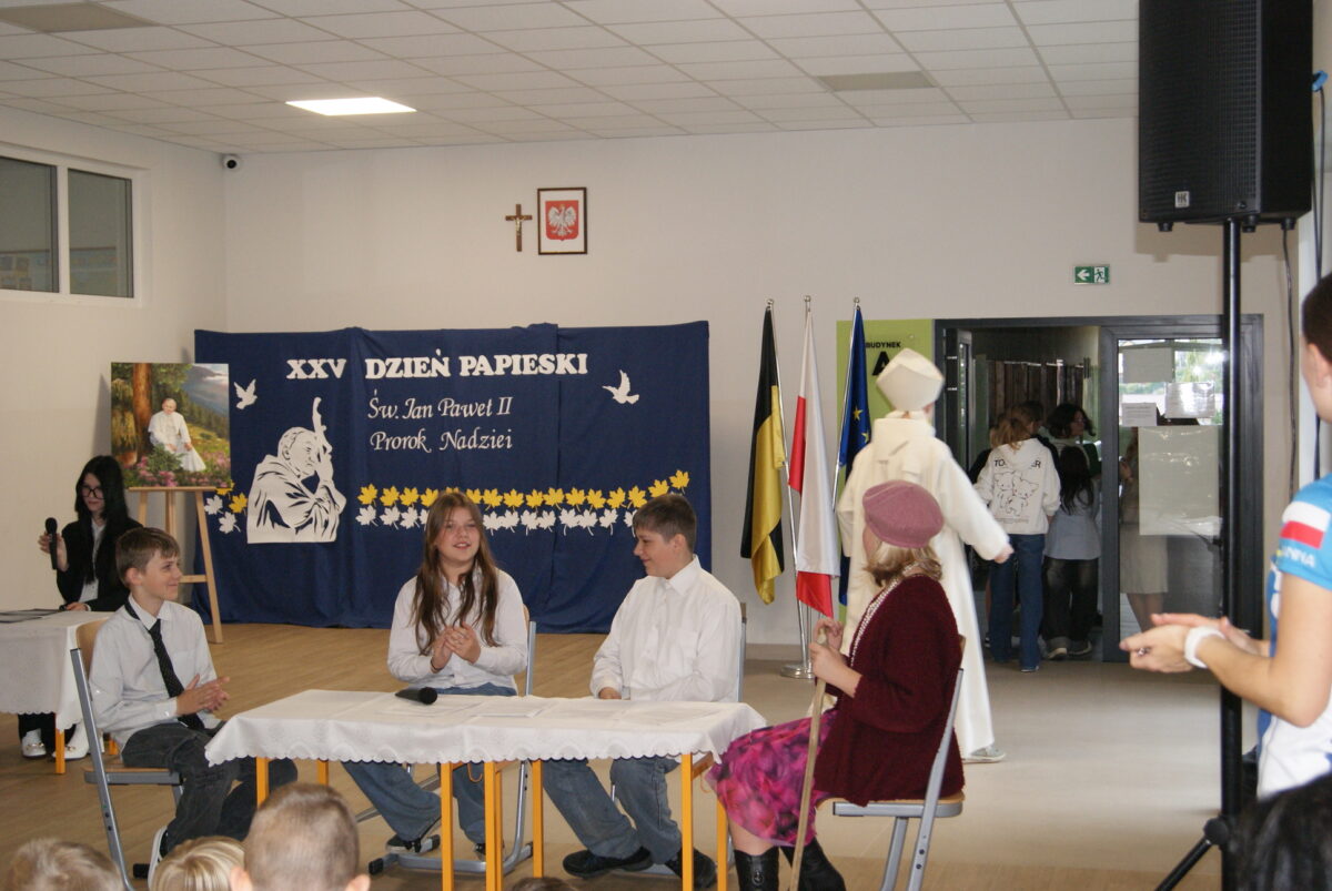 Apel rozpoczęła nasza Pani Dyrektor przypominając nam jak wyjątkowy w dziejach historii był wybór naszego Rodaka na Papieża. Następnie uczniowie z klasy 6b oraz uczeń z 6a pod opieką ks. Marcina Brząkały, s. Rozalii Modzelewskiej i p. Agnieszki Płotki przygotowali interesujące przedstawienie, podczas którego widzowie mogli poczuć się jak w prawdziwym studio telewizyjnym. Podczas specjalnego wydania dziennika, w którym nasi uczniowie byli prezenterami i reporterami, można było dowiedzieć się ciekawych faktów z życia naszego Ojca Świętego. Zaproszeni goście dzielili się osobistym doświadczeniem spotkania się z Papieżem. Oczywiście nie zabrakło ulubionej pieśni św. Jana Pawła II, czyli “Barki”.