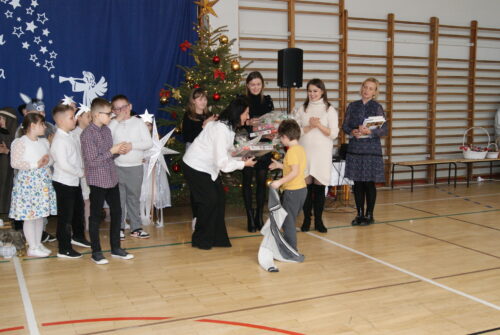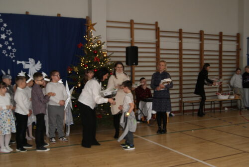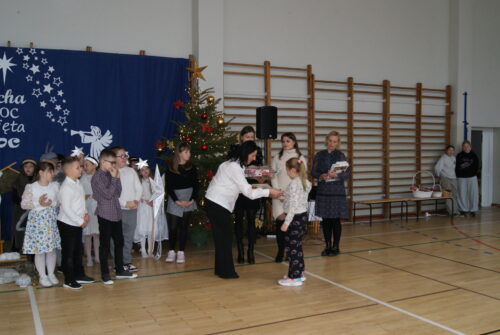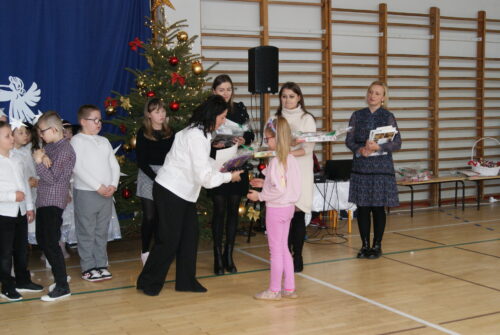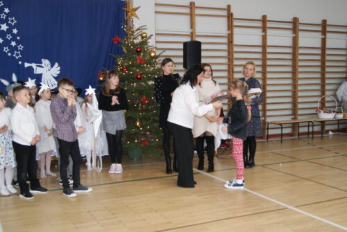 Nagrody dla zwycięzców wręczyła dyrektor szkoły Pani Beata Grau podczas jasełek, co dodatkowo wprowadziło świąteczny nastrój i ucieszyło laureatów.