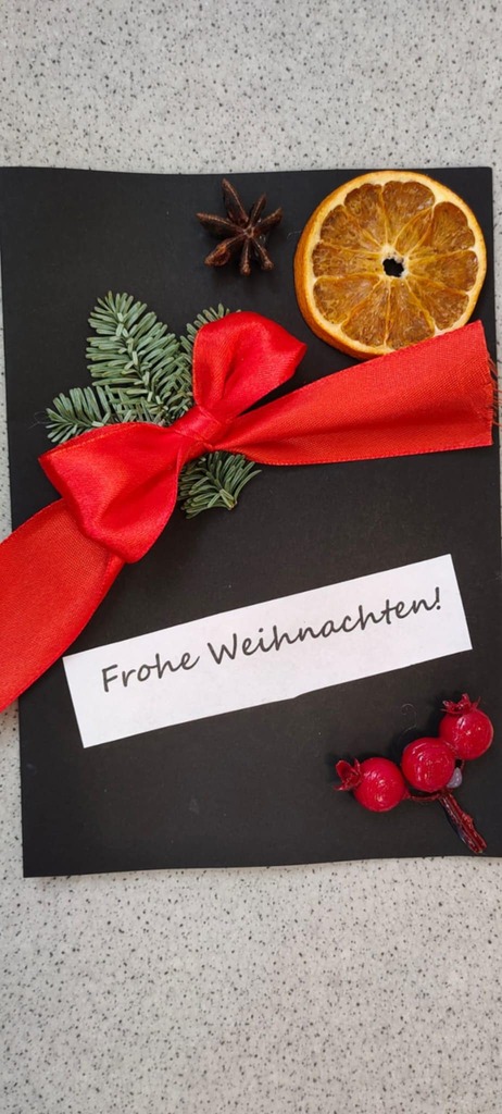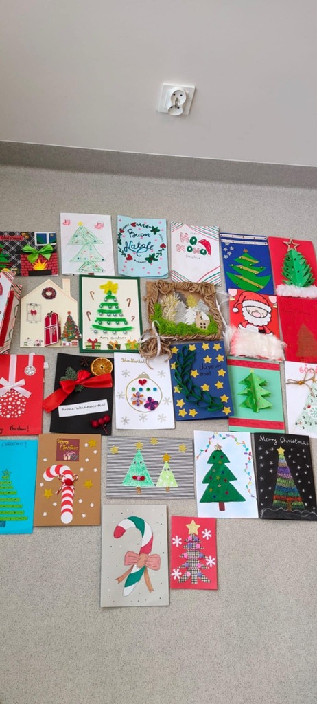 Starsze dzieci wykazały się nie tylko pomysłowością plastyczną, ale także umiejętnościami językowymi, tworząc piękne kartki świąteczne z życzeniami w różnych językach.