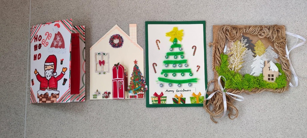 Starsze dzieci wykazały się nie tylko pomysłowością plastyczną, ale także umiejętnościami językowymi, tworząc piękne kartki świąteczne z życzeniami w różnych językach.