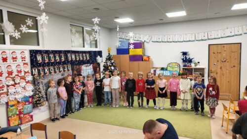 W środę 10 grudnia odbyło się wyjątkowe, pełne ciepła i radości spotkanie świąteczne, w którym udział wzięły dzieci wraz z rodzicami. Uroczystość rozpoczęła się krótkim występem artystycznym – dzieci zaprezentowały przygotowane piosenki oraz układ taneczny, a następnie wspólnie z rodzicami zaśpiewały kolędę, wprowadzając wszystkich w prawdziwie świąteczny nastrój.
