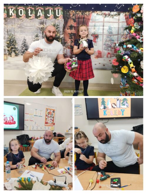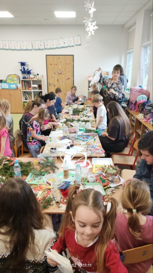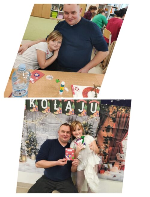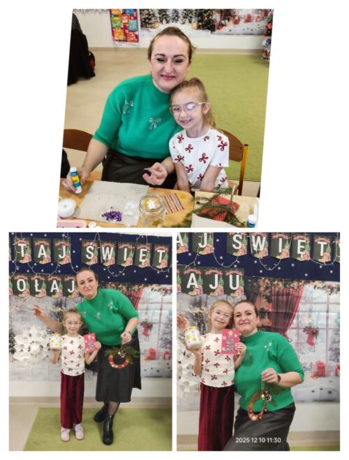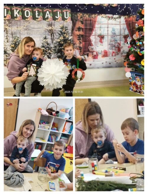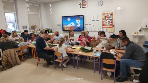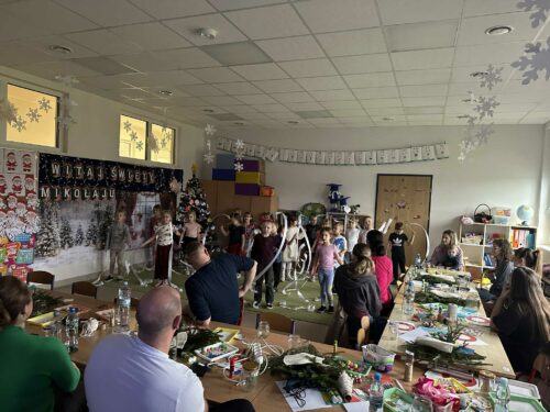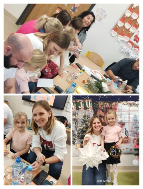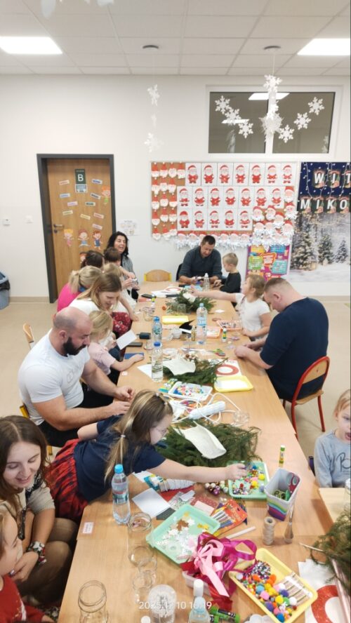 Po części artystycznej rozpoczęły się warsztaty świąteczne, podczas których rodziny mogły wspólnie tworzyć wyjątkowe dekoracje. Powstały piękne lampiony ze słoików, kartki świąteczne, wianki na drzwi oraz papierowe gwiazdy. W sali unosiła się twórcza atmosfera, a uśmiechy dzieci i dorosłych były najlepszym dowodem na to, jak wartościowy był to czas spędzony razem.
