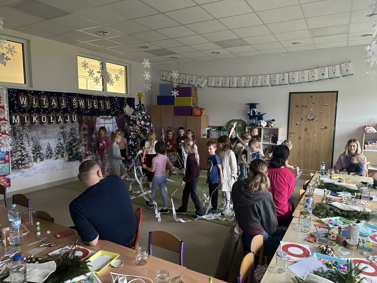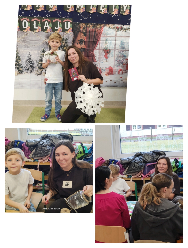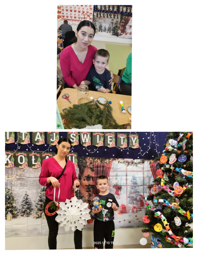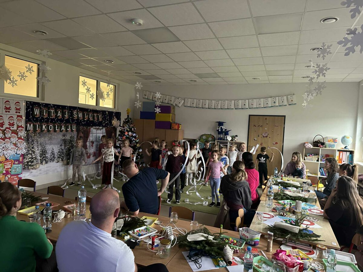Po części artystycznej rozpoczęły się warsztaty świąteczne, podczas których rodziny mogły wspólnie tworzyć wyjątkowe dekoracje. Powstały piękne lampiony ze słoików, kartki świąteczne, wianki na drzwi oraz papierowe gwiazdy. W sali unosiła się twórcza atmosfera, a uśmiechy dzieci i dorosłych były najlepszym dowodem na to, jak wartościowy był to czas spędzony razem.
