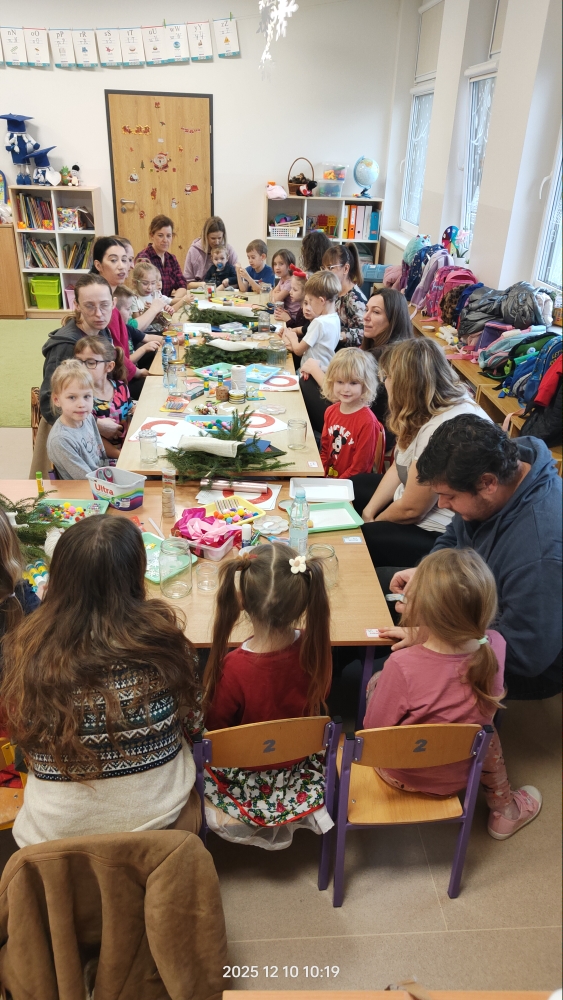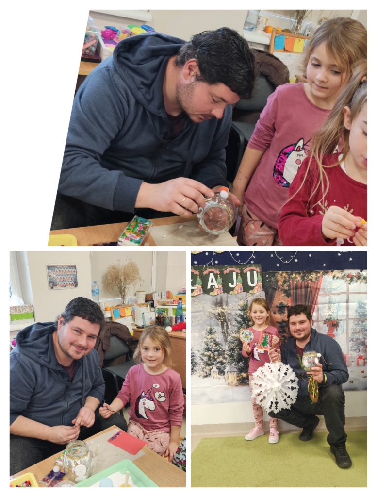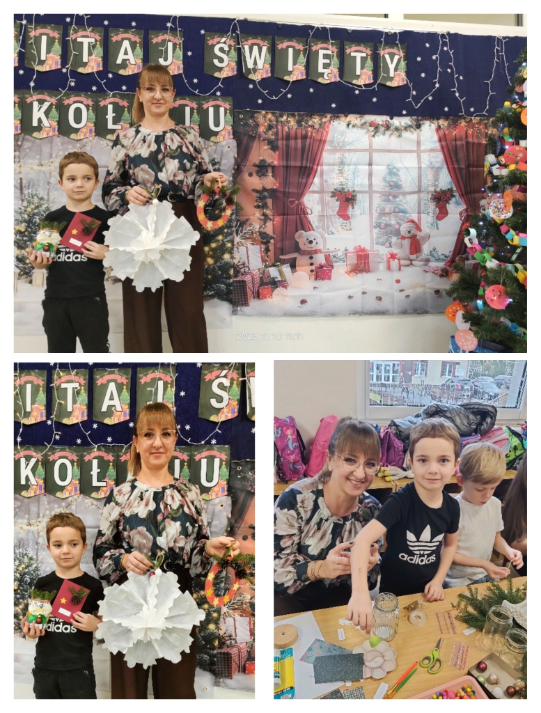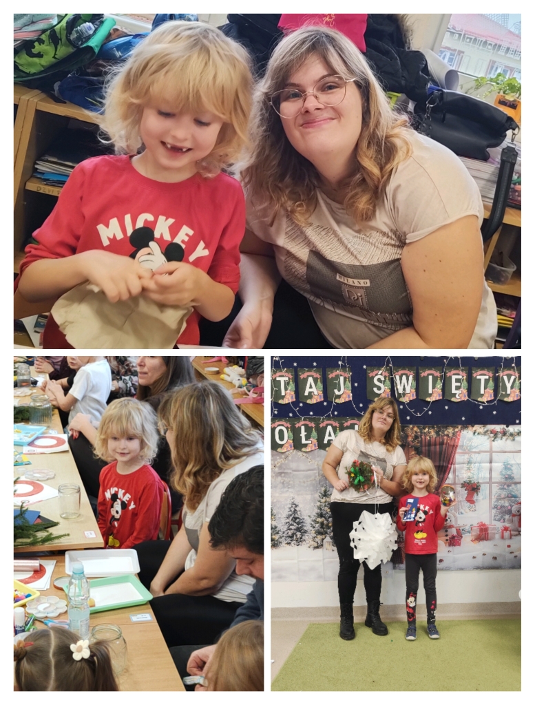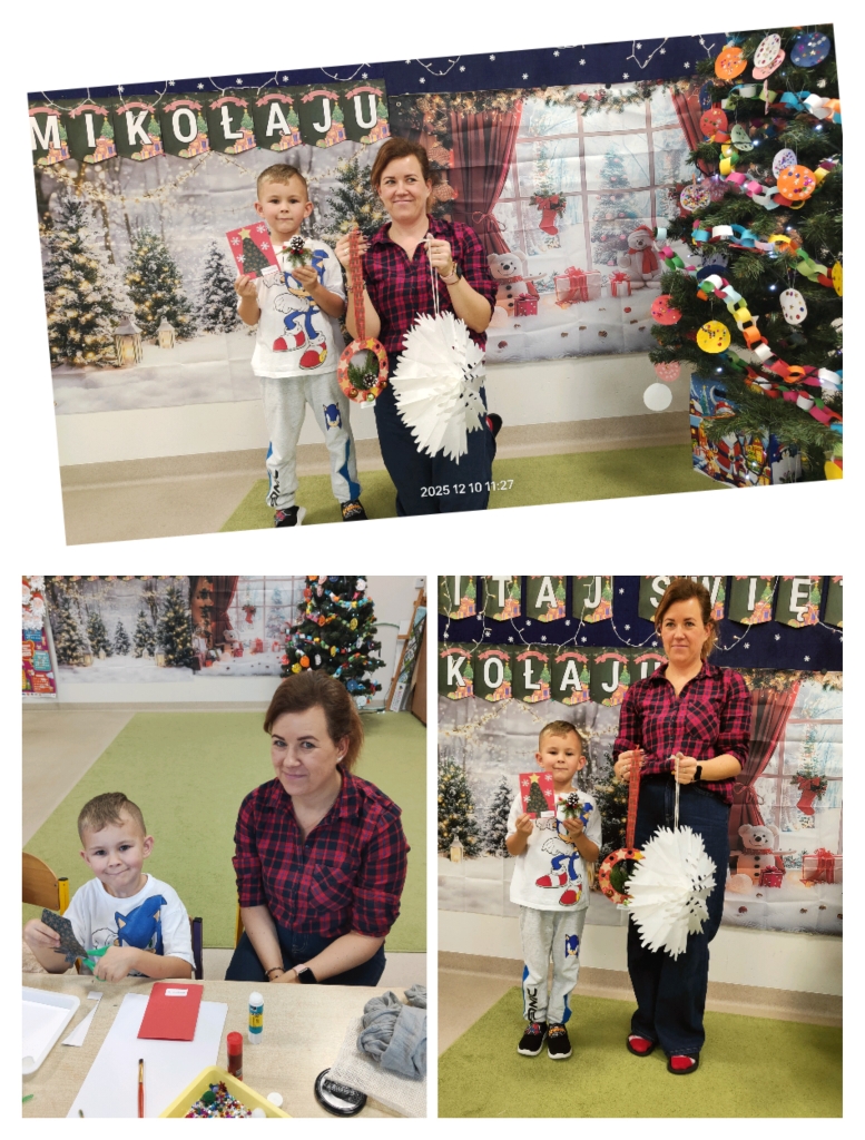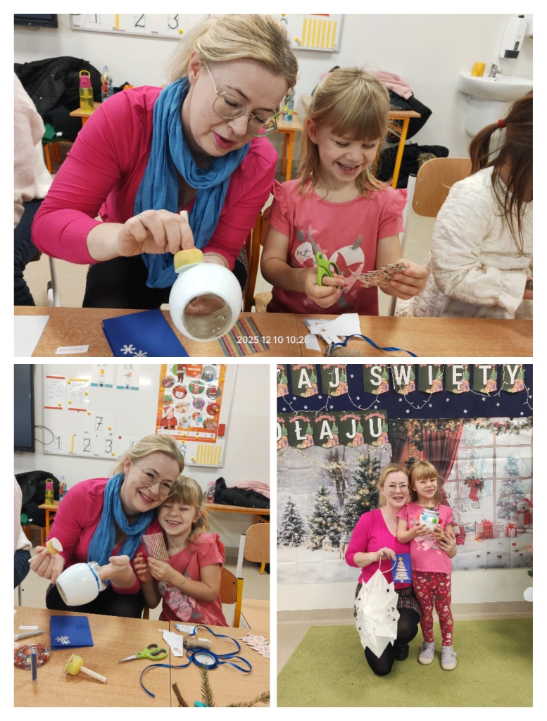 Po części artystycznej rozpoczęły się warsztaty świąteczne, podczas których rodziny mogły wspólnie tworzyć wyjątkowe dekoracje. Powstały piękne lampiony ze słoików, kartki świąteczne, wianki na drzwi oraz papierowe gwiazdy. W sali unosiła się twórcza atmosfera, a uśmiechy dzieci i dorosłych były najlepszym dowodem na to, jak wartościowy był to czas spędzony razem.