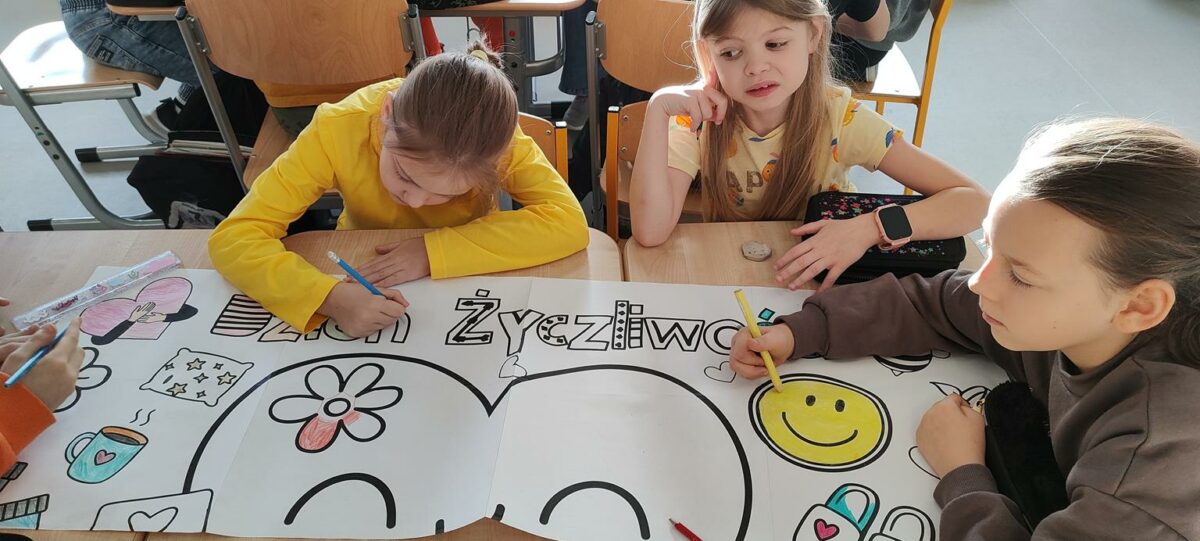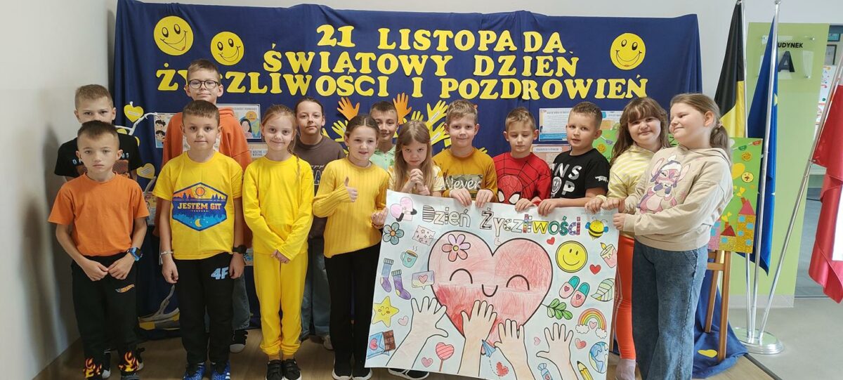 Na dworze jest szaro i ponuro, a wokół nas wszyscy są dla siebie mili, życzliwi i uśmiechnięci. Takie jest założenie i przesłanie święta. Pomysł Światowego Dnia Życzliwości i Pozdrowień narodził się już w 1973 roku pod nazwą World Hello Day w Stanach Zjednoczonych i symbolizuje cel tego dnia, czyli mówienie „Hello” do przynajmniej dziesięciu osób dziennie. Obecnie Dzień Życzliwości i Pozdrowień obchodzony jest w ponad 180 krajach. Jego celem jest uwrażliwienie ludzi na wzajemną życzliwość, wzbudzenie w nich pozytywnych emocji. Jest to apel przeciwko problemom i często smutnej rzeczywistości. Świętowanie tego ważnego dnia zaczęliśmy od rana. W naszej szkole królował kolor żółty – symbol życzliwości, radości i optymizmu a na drzwiach sal lekcyjnych zagościły ”dobre słowa” dla każdego. Dzień ten był okazją do kształtowania pozytywnych postaw wśród dzieci. Nauczyciele w klasach I-III zaplanowali różnorodne aktywności angażujące swoich wychowanków. Były to kreatywne prace plastyczne, kolorowanki, karteczki życzliwości, plakaty promujące życzliwość. Był to dzień pełen miłych słów, pozytywnych emocji i dobrych uczynków.