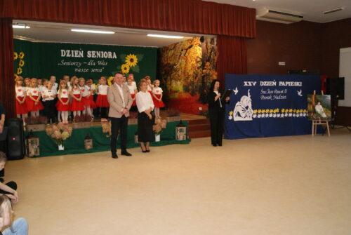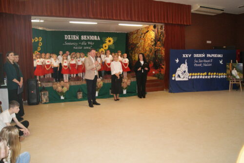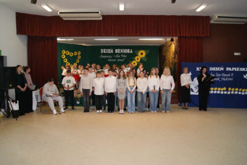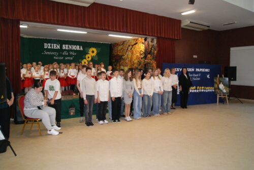 Po części artystycznej drugoklasistów, uczniowie klasy 6B zaśpiewali pieśń „Barka”, nawiązując do obchodzonego niedawno Dnia Papieskiego. Występ został nagrodzony gromkimi brawami i wzruszeniem publiczności. Na zakończenie uroczystości każdy z przybyłych gości otrzymał wyjątkowy upominek – magnes w kształcie serca, własnoręcznie wykonany przez dzieci. Ten drobny gest symbolizował wdzięczność, serdeczność i pamięć o wszystkich seniorach.