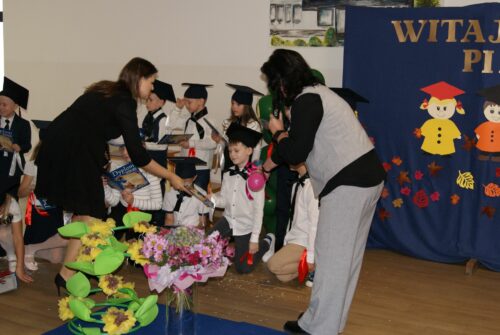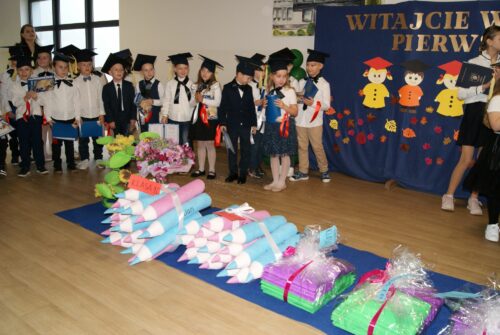 Z okazji uroczystości uczniowie klas pierwszych otrzymali pamiątkowe dyplomy wręczone przez wychowawczynie oraz pierwszy dokument szkolny potwierdzający status ucznia – legitymację szkolną. Zostali także obdarowani licznymi upominkami sponsorowanymi przez rodziców i szkołę. Zwieńczeniem uroczystości były gratulacje i życzenia płynące od Przewodniczącej Rady Szkoły – Pani Danuty Rekowskiej i Dyrektor szkoły Pani Beaty Grau oraz słodki poczęstunek dla każdej z klas pierwszych. Na zakończenie spotkania odbyła się profesjonalna sesja zdjęciowa w wykonaniu Pani Moniki Lipskiej ML STUDIO.