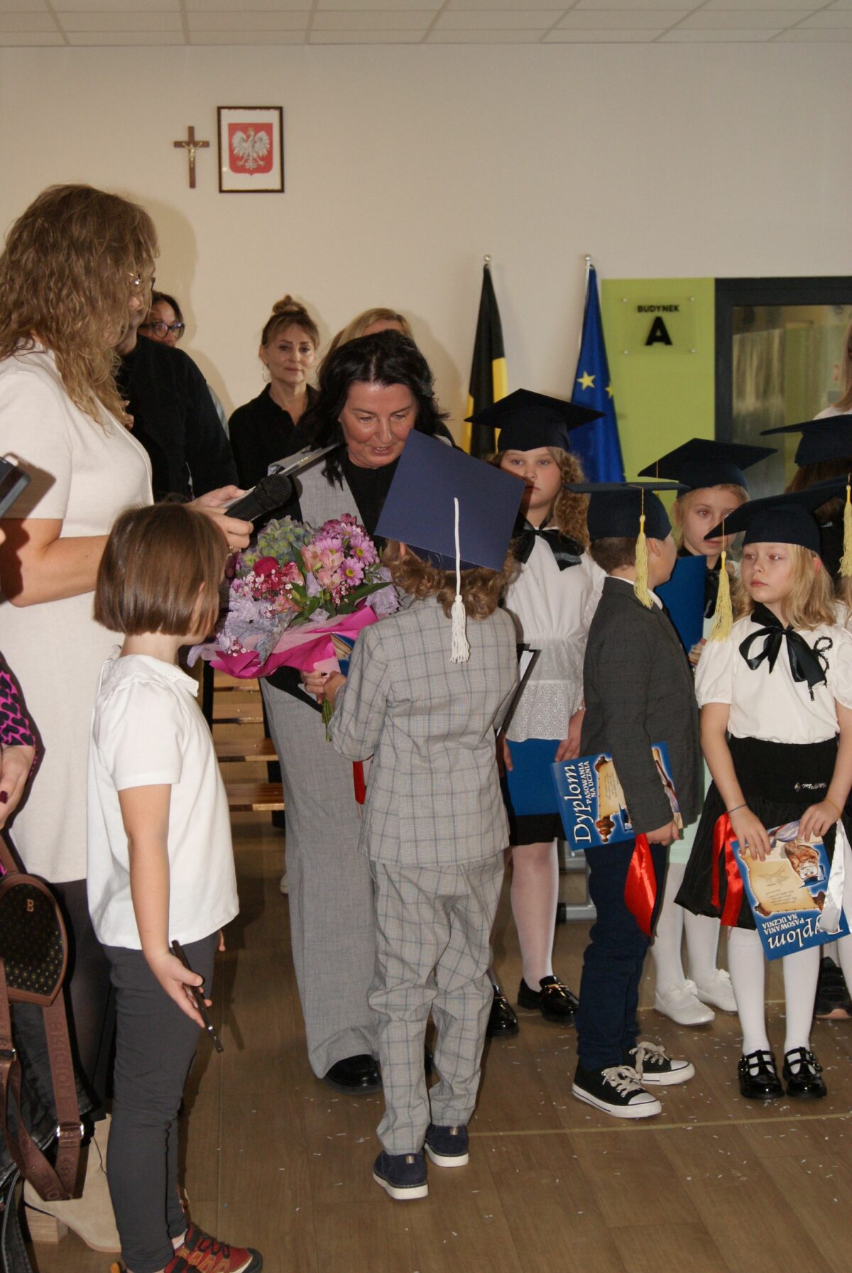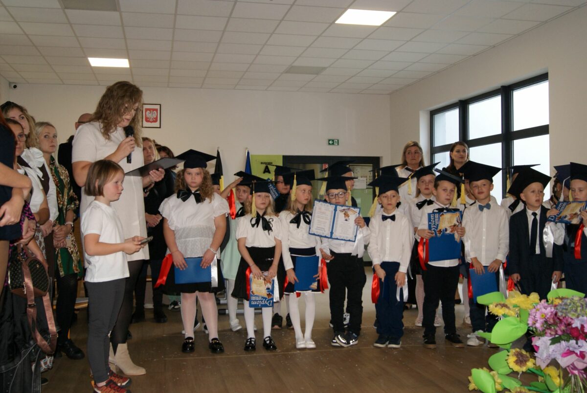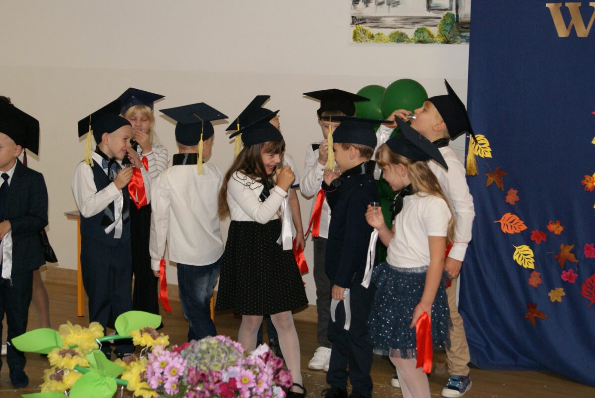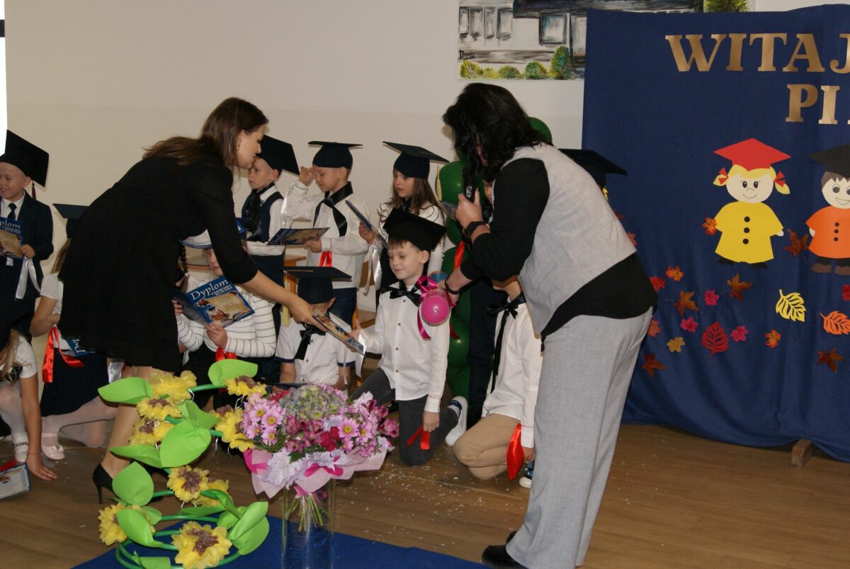 Z okazji uroczystości uczniowie klas pierwszych otrzymali pamiątkowe dyplomy wręczone przez wychowawczynie oraz pierwszy dokument szkolny potwierdzający status ucznia – legitymację szkolną. Zostali także obdarowani licznymi upominkami sponsorowanymi przez rodziców i szkołę. Zwieńczeniem uroczystości były gratulacje i życzenia płynące od Przewodniczącej Rady Szkoły – Pani Danuty Rekowskiej i Dyrektor szkoły Pani Beaty Grau oraz słodki poczęstunek dla każdej z klas pierwszych. Na zakończenie spotkania odbyła się profesjonalna sesja zdjęciowa w wykonaniu Pani Moniki Lipskiej ML STUDIO.
