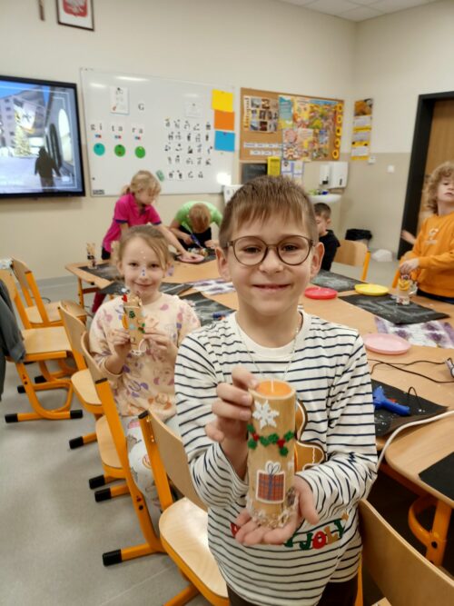 Warsztaty przebiegły w radosnej, pełnej ciepła atmosferze, a wspólna praca nad świątecznym prezentem umocniła integrację klasy oraz stworzyła okazję do rozmów o świątecznych tradycjach. Zajęcia zakończyły się wspólnym podsumowaniem i prezentacją wykonanych świeczników.