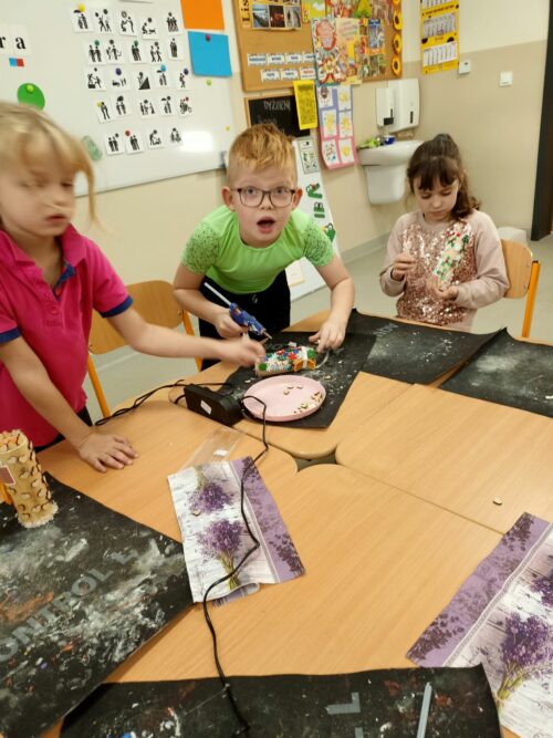 Główną część warsztatów stanowiło wykonywanie świeczników na tealight. Uczniowie pracowali z dużym zaangażowaniem, wykorzystując przygotowane materiały, takie jak: słoiczki, farby, brokat, wstążki, gałązki świerku oraz świąteczne ozdoby. Podczas pracy rozwijali swoje zdolności manualne, kreatywność i cierpliwość, a także uczyli się współpracy oraz porządkowania swojego stanowiska.