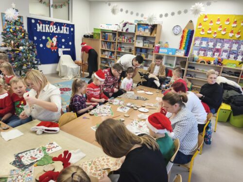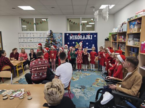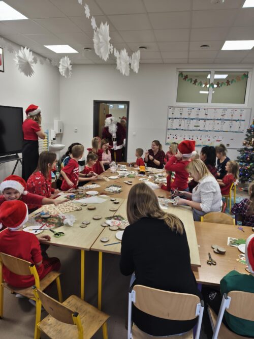 Zanim rozpoczęła się część warsztatowa, dzieci zaprezentowały przygotowane piosenki, wprowadzając wszystkich w świąteczny nastrój. W trakcie spotkania grupę odwiedził również Święty Mikołaj, który obdarował dzieci upominkami, wywołując wiele radości i uśmiechów.