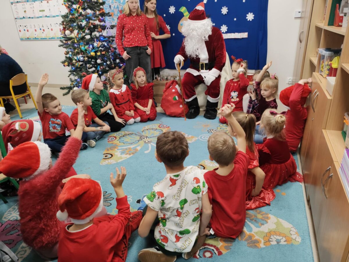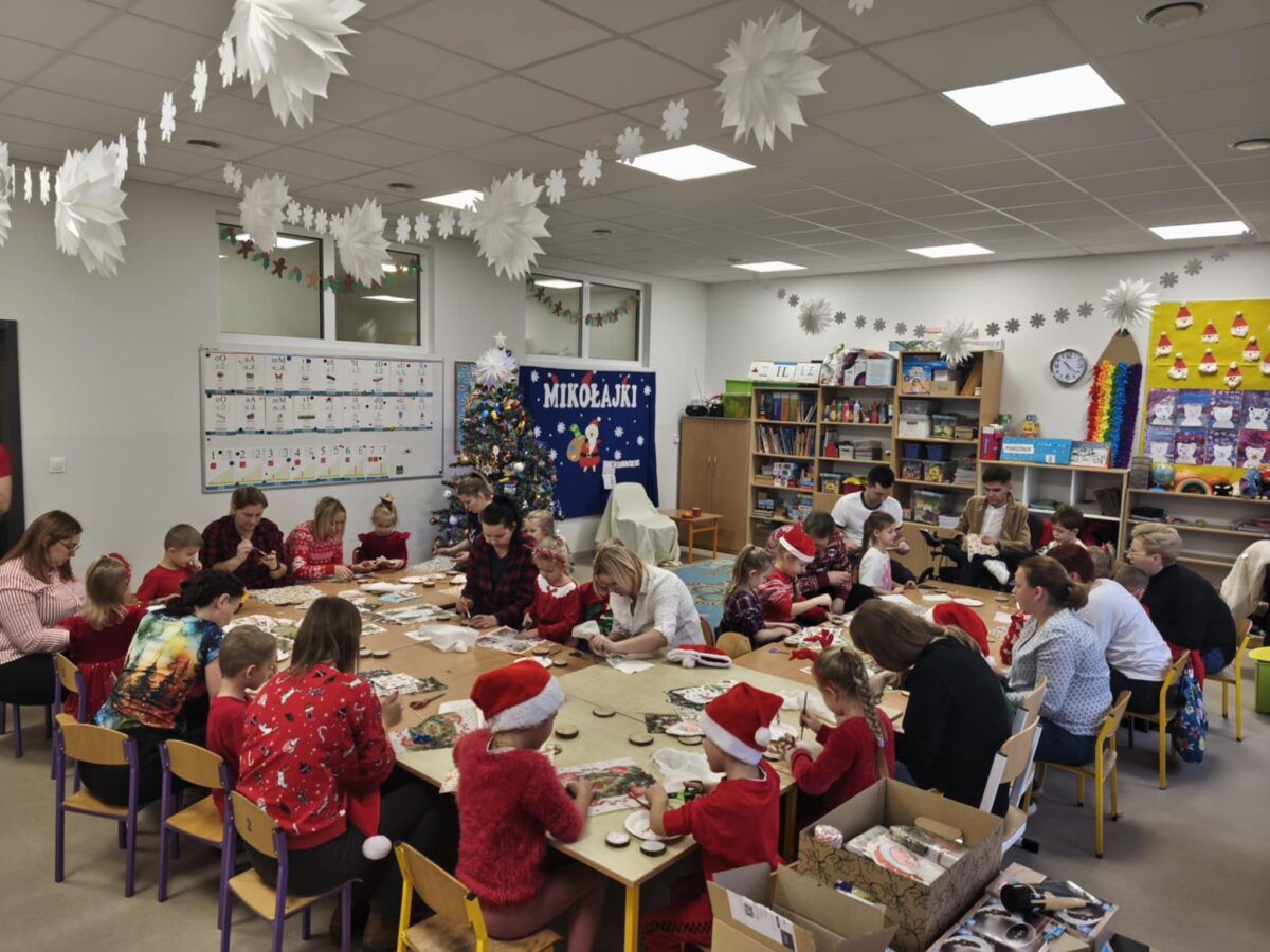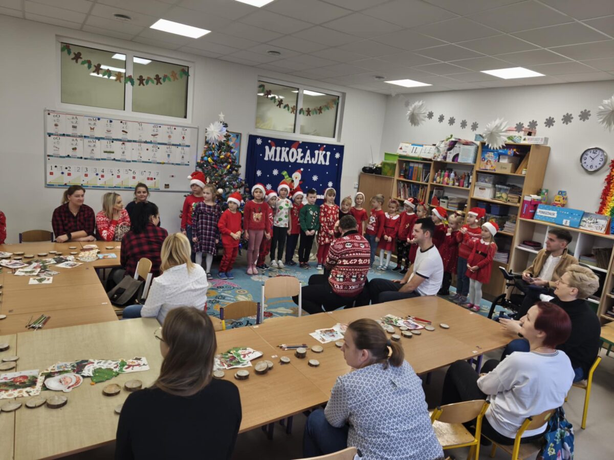 Zanim rozpoczęła się część warsztatowa, dzieci zaprezentowały przygotowane piosenki, wprowadzając wszystkich w świąteczny nastrój. W trakcie spotkania grupę odwiedził również Święty Mikołaj, który obdarował dzieci upominkami, wywołując wiele radości i uśmiechów.