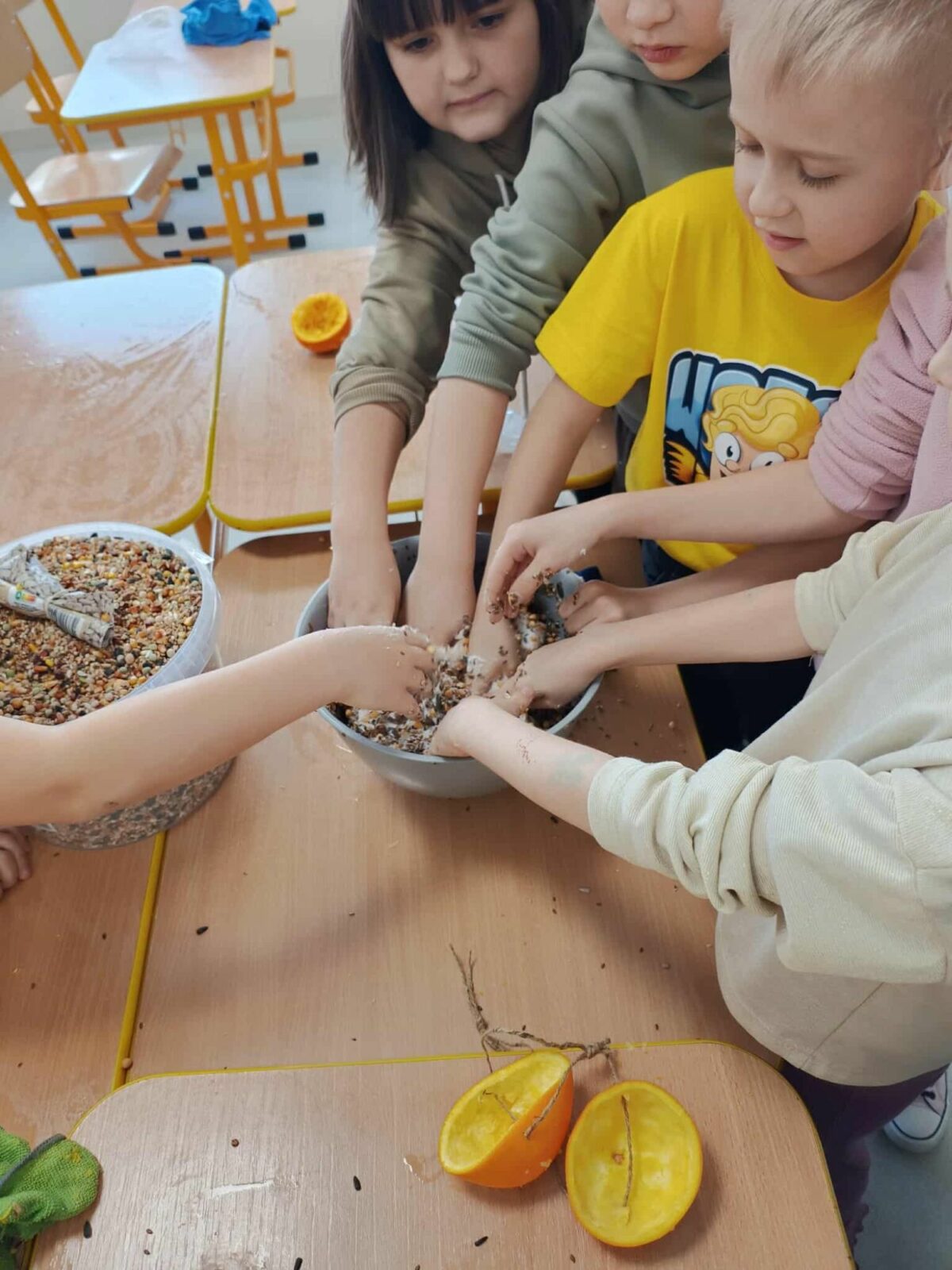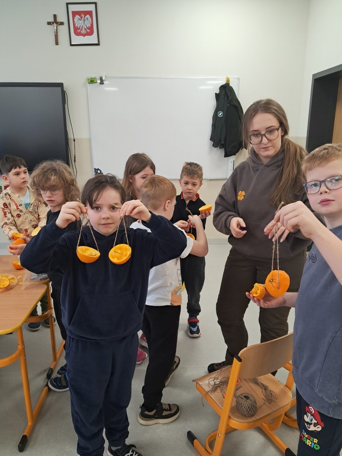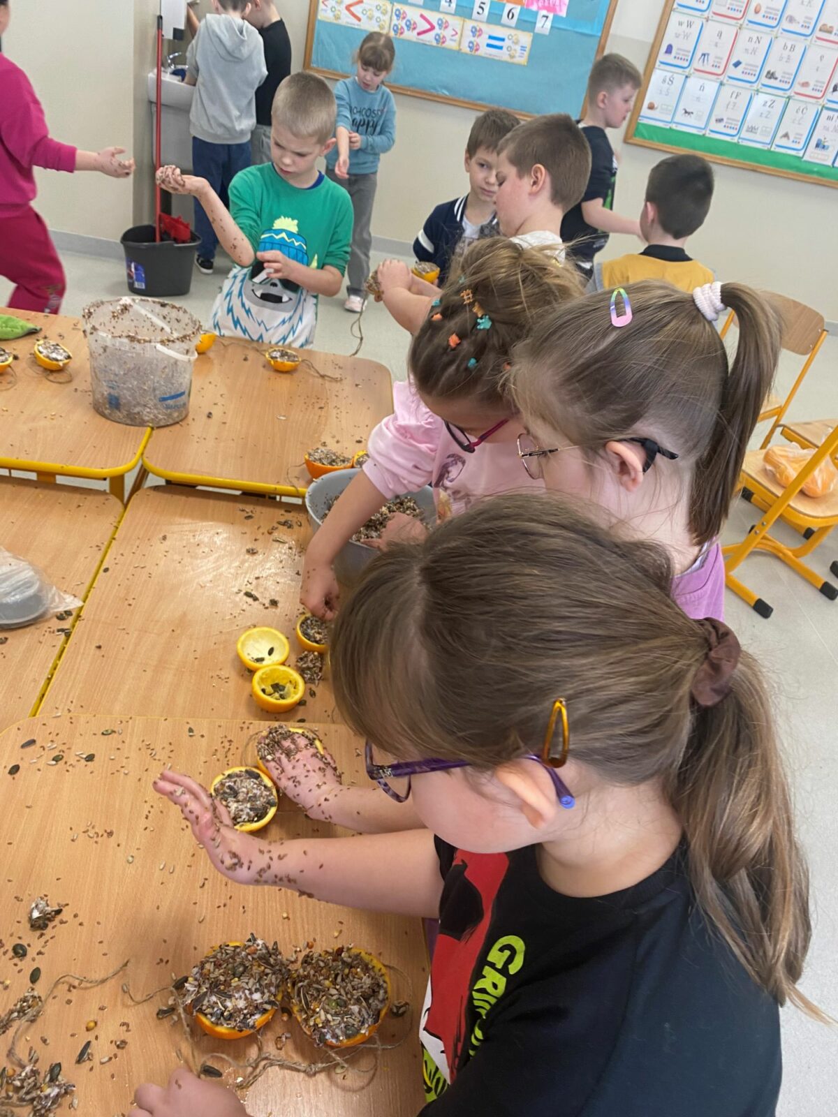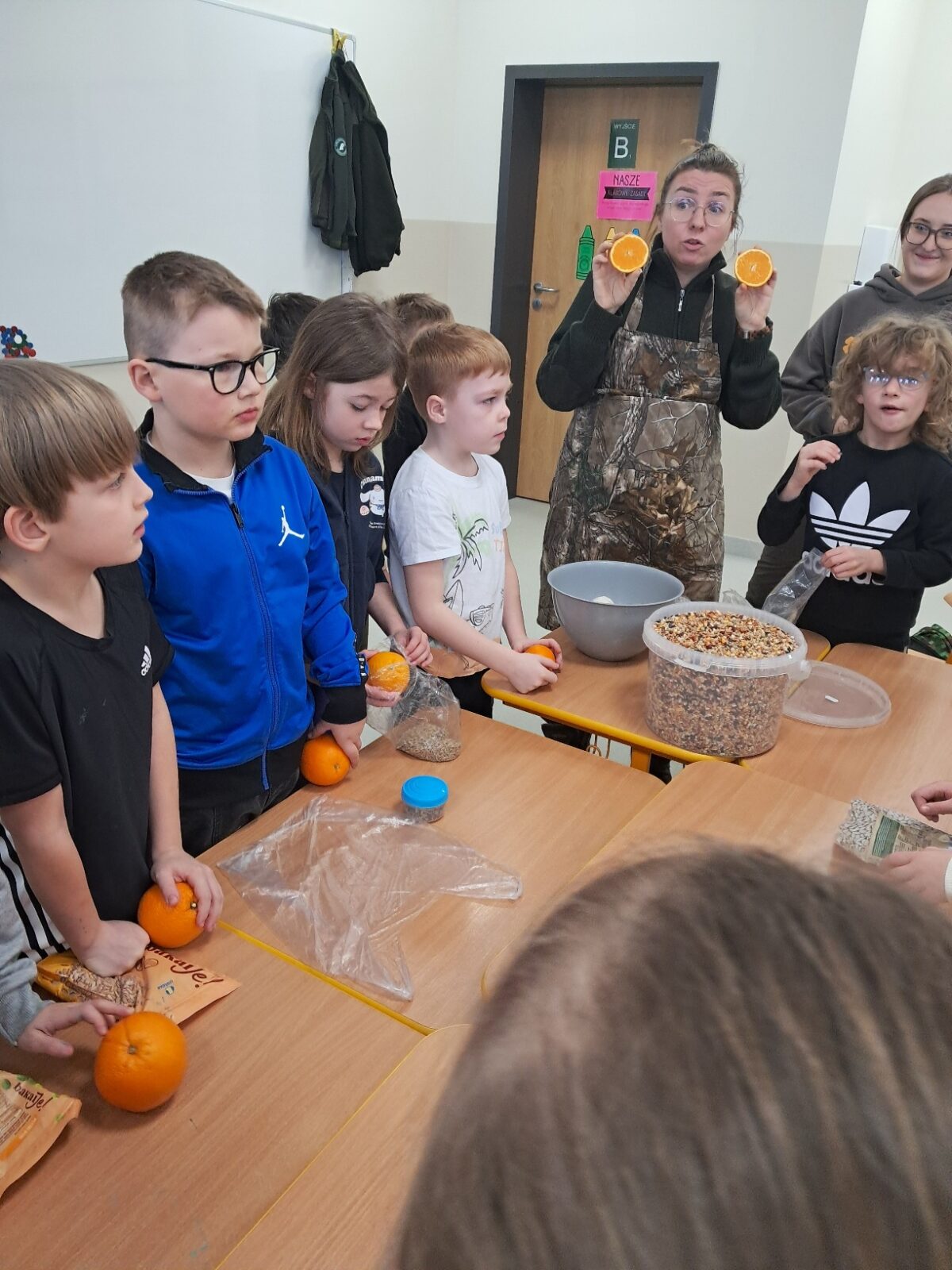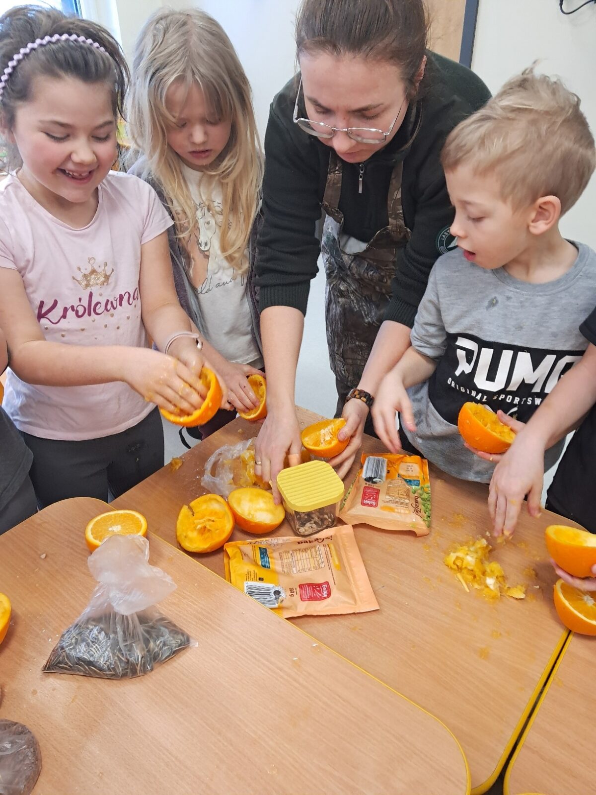 Na początku spotkania uczniowie rozmawiali w jaki sposób można pomagać ptakom zimującym w Polsce oraz omówiono zasady bezpiecznego i odpowiedzialnego dokarmiania ptaków. Następnie uczniowie przystąpili do części praktycznej warsztatów. Wydrążali miąższ z połówek pomarańczy. Skórka pełniła funkcję naturalnego pojemnika na pokarm. Uczniowie mieszali różne rodzaje ziaren (m.in. słonecznik, proso, owies) z przygotowaną wcześniej mieszanką tłuszczową, a następnie napełniali nią pomarańczowe miseczki. Do każdej kuli przymocowany został sznurek, umożliwiający zawieszenie jej na drzewie lub balkonie. Dzieci pracowały z dużym zaangażowaniem i radością. Na zakończenie zajęć omówiono zasady wyboru odpowiedniego miejsca do zawieszenia kul oraz przypomniano o regularnym kontrolowaniu karmników. Gotowe kule zostały zabrane przez uczniów do domów w celu zawieszenia w ogrodach i na balkonach. Warsztaty przebiegły w miłej i twórczej atmosferze. Zrealizowano założone cele dydaktyczne i wychowawcze. Uczniowie zdobyli nową wiedzę oraz praktyczne umiejętności, a także rozwinęli postawę troski o środowisko naturalne.