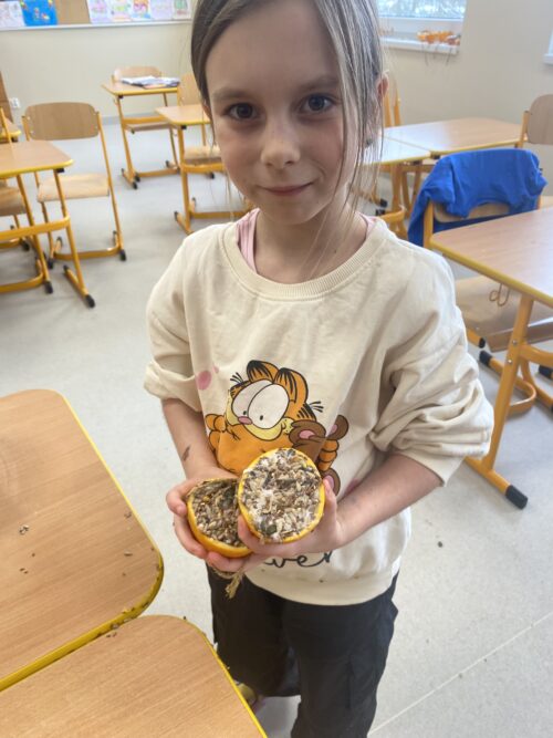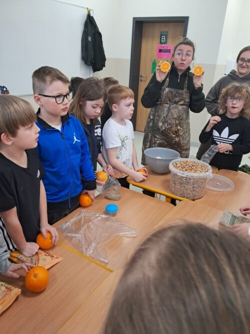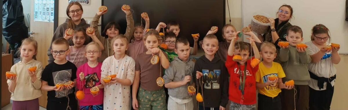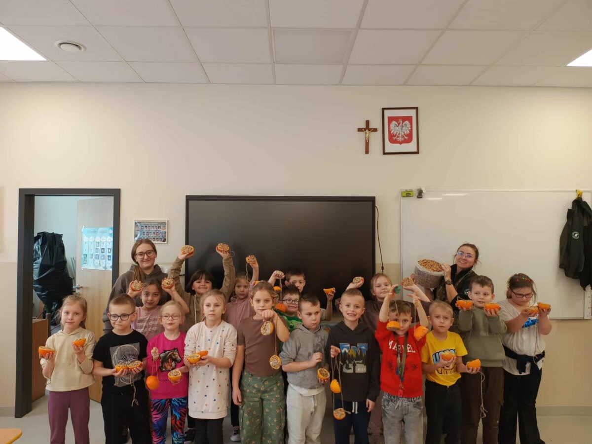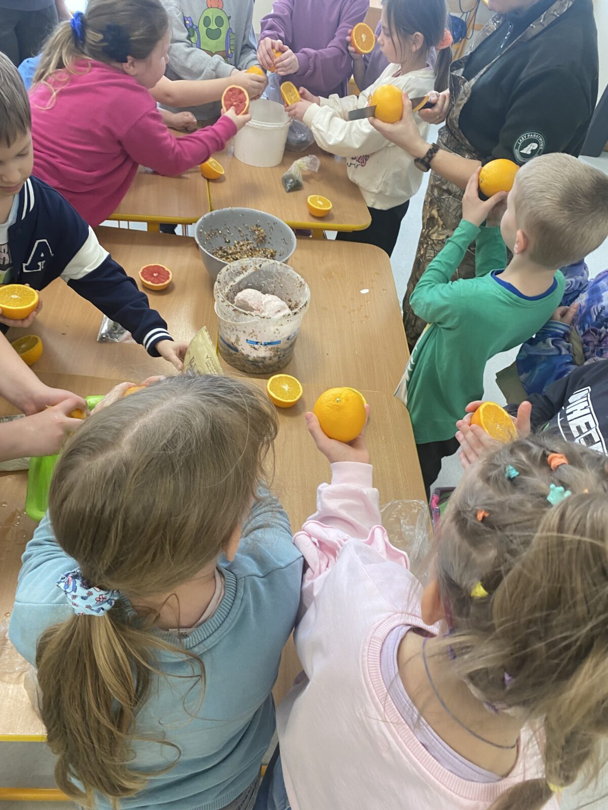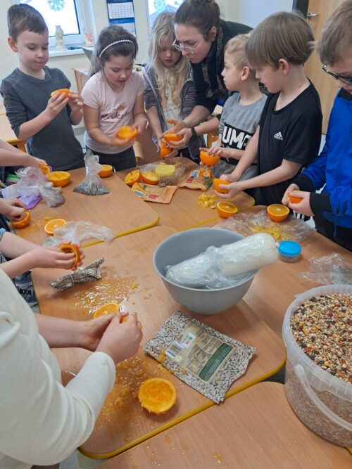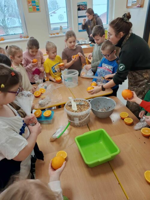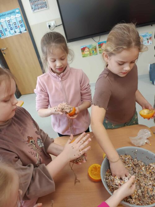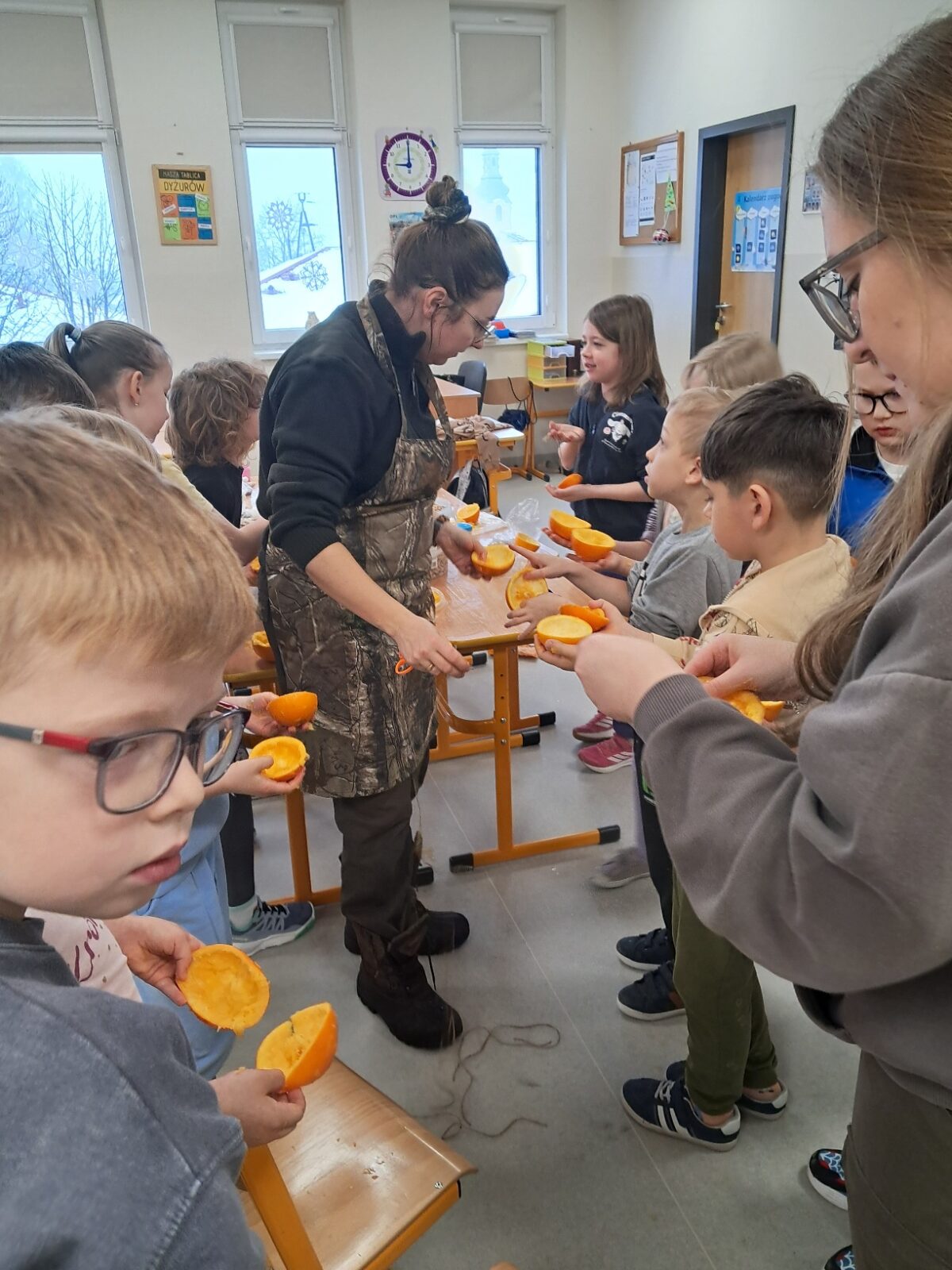 Na początku spotkania uczniowie rozmawiali w jaki sposób można pomagać ptakom zimującym w Polsce oraz omówiono zasady bezpiecznego i odpowiedzialnego dokarmiania ptaków. Następnie uczniowie przystąpili do części praktycznej warsztatów. Wydrążali miąższ z połówek pomarańczy. Skórka pełniła funkcję naturalnego pojemnika na pokarm. Uczniowie mieszali różne rodzaje ziaren (m.in. słonecznik, proso, owies) z przygotowaną wcześniej mieszanką tłuszczową, a następnie napełniali nią pomarańczowe miseczki. Do każdej kuli przymocowany został sznurek, umożliwiający zawieszenie jej na drzewie lub balkonie. Dzieci pracowały z dużym zaangażowaniem i radością. Na zakończenie zajęć omówiono zasady wyboru odpowiedniego miejsca do zawieszenia kul oraz przypomniano o regularnym kontrolowaniu karmników. Gotowe kule zostały zabrane przez uczniów do domów w celu zawieszenia w ogrodach i na balkonach. Warsztaty przebiegły w miłej i twórczej atmosferze. Zrealizowano założone cele dydaktyczne i wychowawcze. Uczniowie zdobyli nową wiedzę oraz praktyczne umiejętności, a także rozwinęli postawę troski o środowisko naturalne.