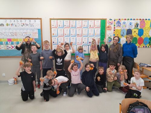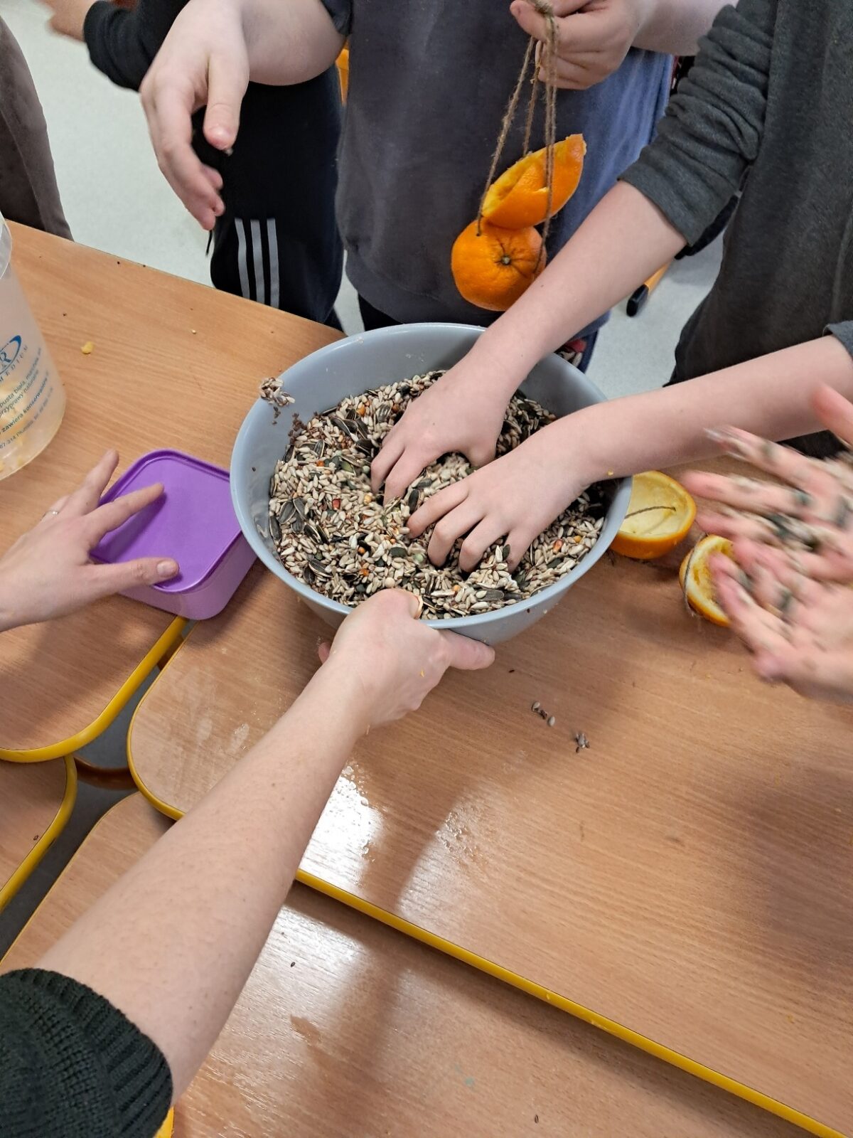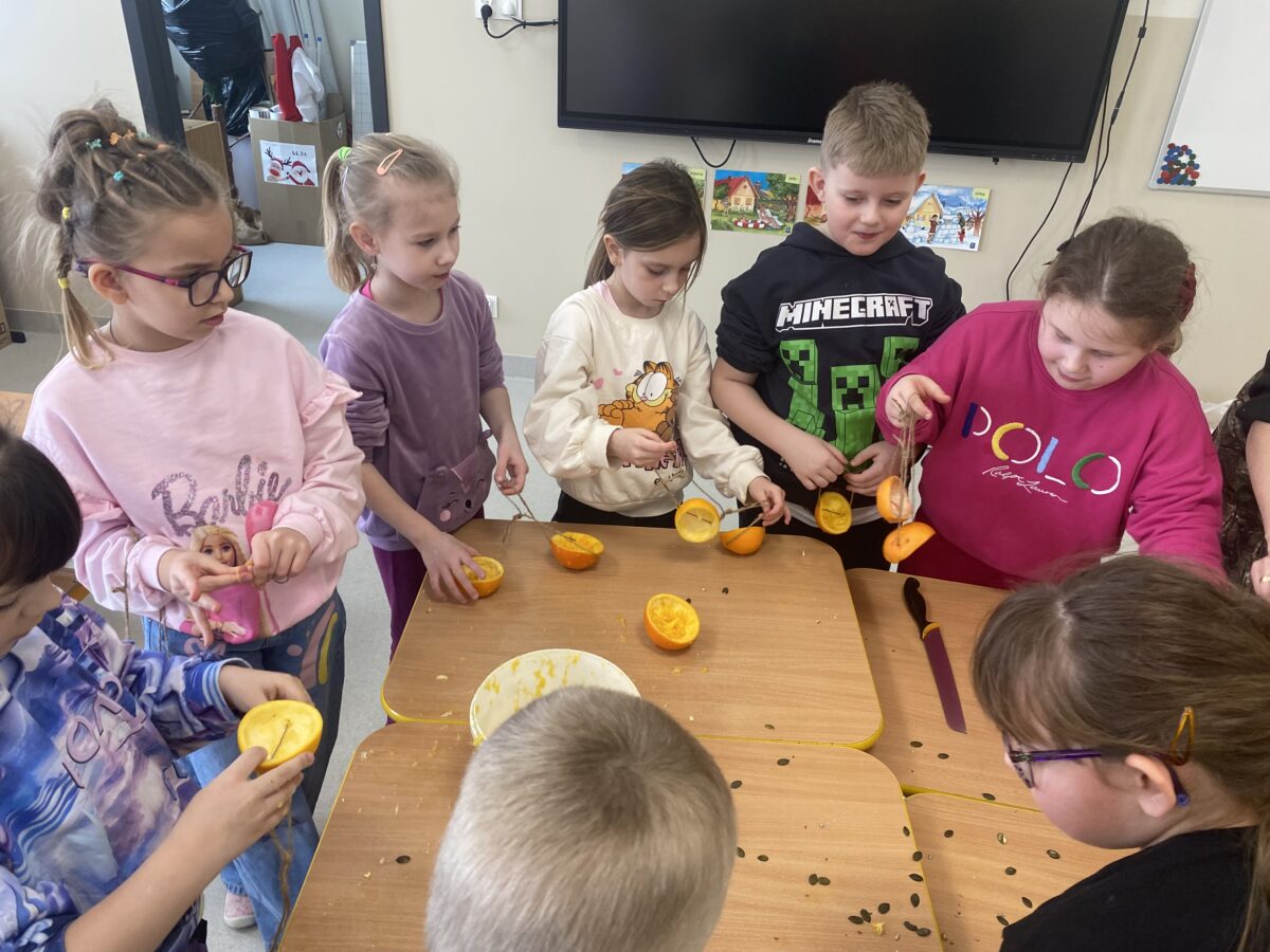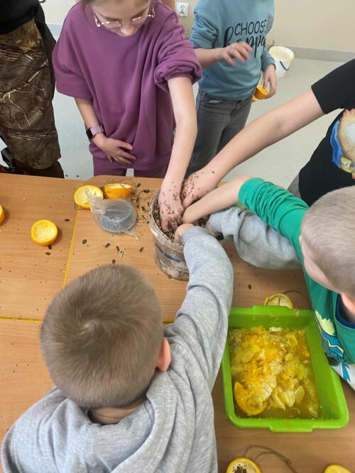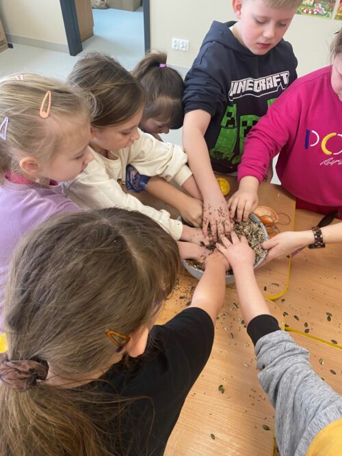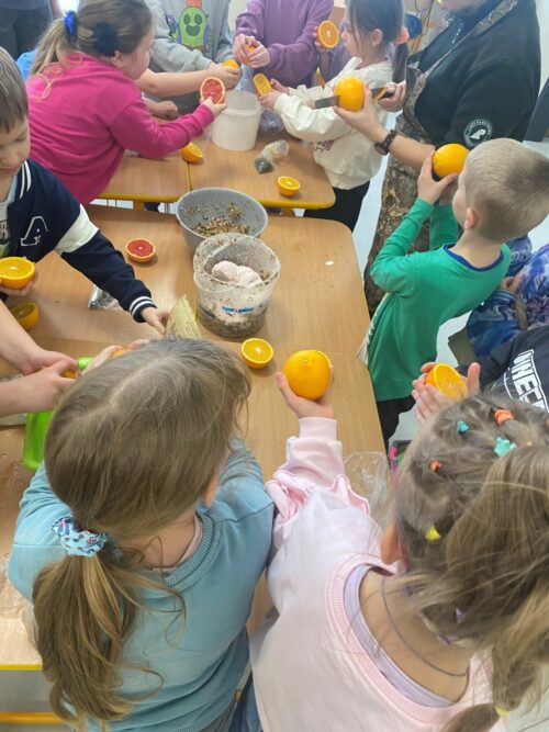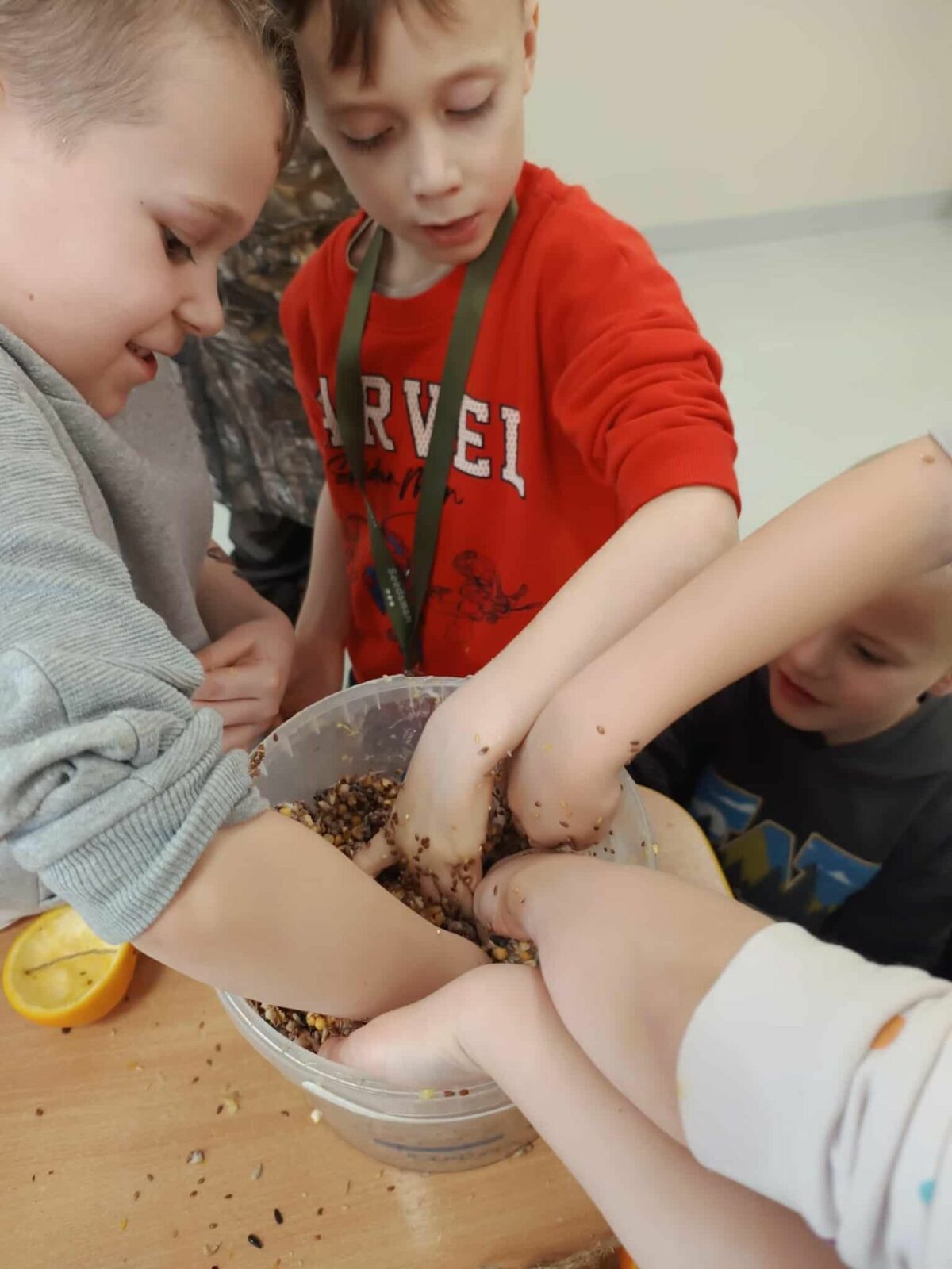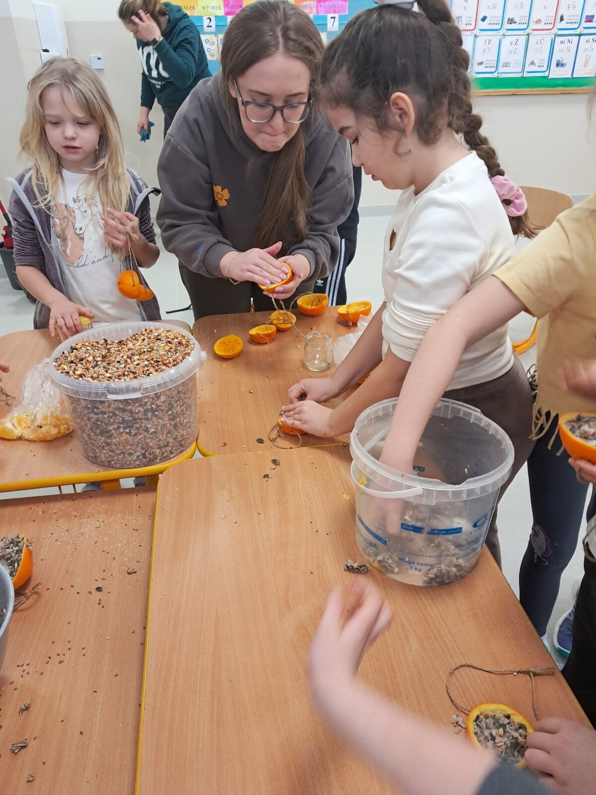 Na początku spotkania uczniowie rozmawiali w jaki sposób można pomagać ptakom zimującym w Polsce oraz omówiono zasady bezpiecznego i odpowiedzialnego dokarmiania ptaków. Następnie uczniowie przystąpili do części praktycznej warsztatów. Wydrążali miąższ z połówek pomarańczy. Skórka pełniła funkcję naturalnego pojemnika na pokarm. Uczniowie mieszali różne rodzaje ziaren (m.in. słonecznik, proso, owies) z przygotowaną wcześniej mieszanką tłuszczową, a następnie napełniali nią pomarańczowe miseczki. Do każdej kuli przymocowany został sznurek, umożliwiający zawieszenie jej na drzewie lub balkonie. Dzieci pracowały z dużym zaangażowaniem i radością. Na zakończenie zajęć omówiono zasady wyboru odpowiedniego miejsca do zawieszenia kul oraz przypomniano o regularnym kontrolowaniu karmników. Gotowe kule zostały zabrane przez uczniów do domów w celu zawieszenia w ogrodach i na balkonach. Warsztaty przebiegły w miłej i twórczej atmosferze. Zrealizowano założone cele dydaktyczne i wychowawcze. Uczniowie zdobyli nową wiedzę oraz praktyczne umiejętności, a także rozwinęli postawę troski o środowisko naturalne.